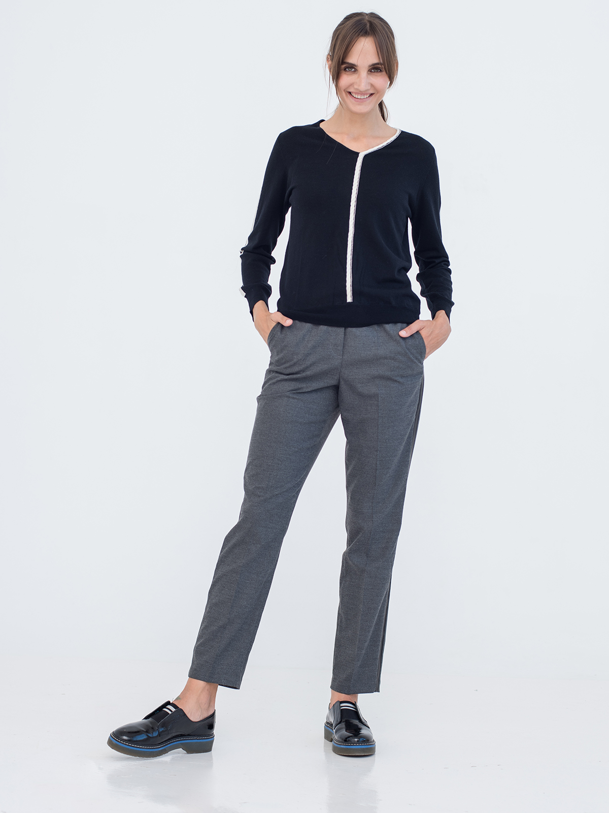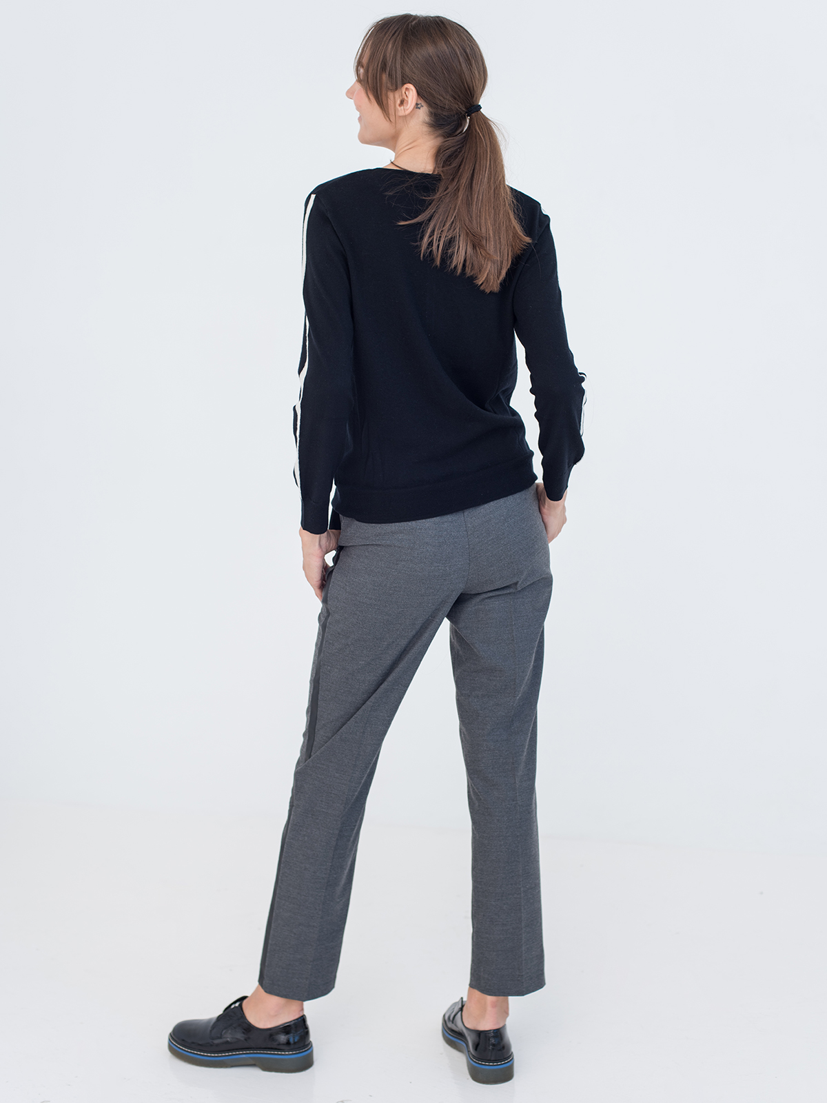 Прямые однотонные брюки с лампасами – оригинальный дизайн, выдержанный в деловом стиле. Комфортная средняя посадка, эластичный пояс с кулиской гарантируют удобство ношения. Приятный к телу материал. Трендовая длина 7/8. Брюки хорошо сочетаются с рубашкой, джемпером или блейзером.