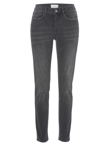 Серые джинсы силуэта slim. Декоративные потертости и складки. Комфортная высокая посадка, притачной пояс со шлевками. Застежка на пуговицу и скрытую молнию. Внутренние боковые карманы и два накладных кармана сзади.