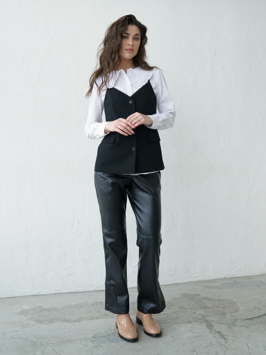 На сайте указаны российские размеры. Черные брюки из экокожи – тренд сезона! Прямой крой. Комфортная высокая посадка, широкий эластичный пояс обеспечивает удобство ношения. Боковые карманы в шве. Боковые разрезы по низу штанин. Ткань: качественная искусственная кожа (55% полиуретан, 40% поливискоза, 5% эластан). Практичный материал, загрязнения с которого легко удаляются влажной салфеткой, что особенно актуально в межсезонье. Крой: стильные брюки свободного прямого силуэта с удобным поясом-резинкой, который подчеркивает линию талии и закрывает область живота. Имеют правильный крой, благодаря чему брюки идеально садятся на разные типы фигуры. В удобных карманах в боковых швах можно легко уместить телефон и банковские карты. Отделка: модель выделяется необычной конструкцией, состоящей из двух деталей, соединенных крепкой строчкой в цвет брюк. Имеют изящные разрезы по низу, которые добавляет комфорта при передвижении, а еще позволяют носить их с различной обувью.