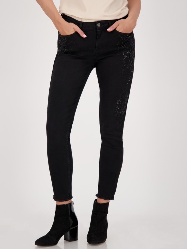 Однотонные джинсы силуэта slim с необработанным краем брючин. Комфортная средняя посадка, притачной пояс со шлевками. Застежка на пуговицу и скрытую молнию.