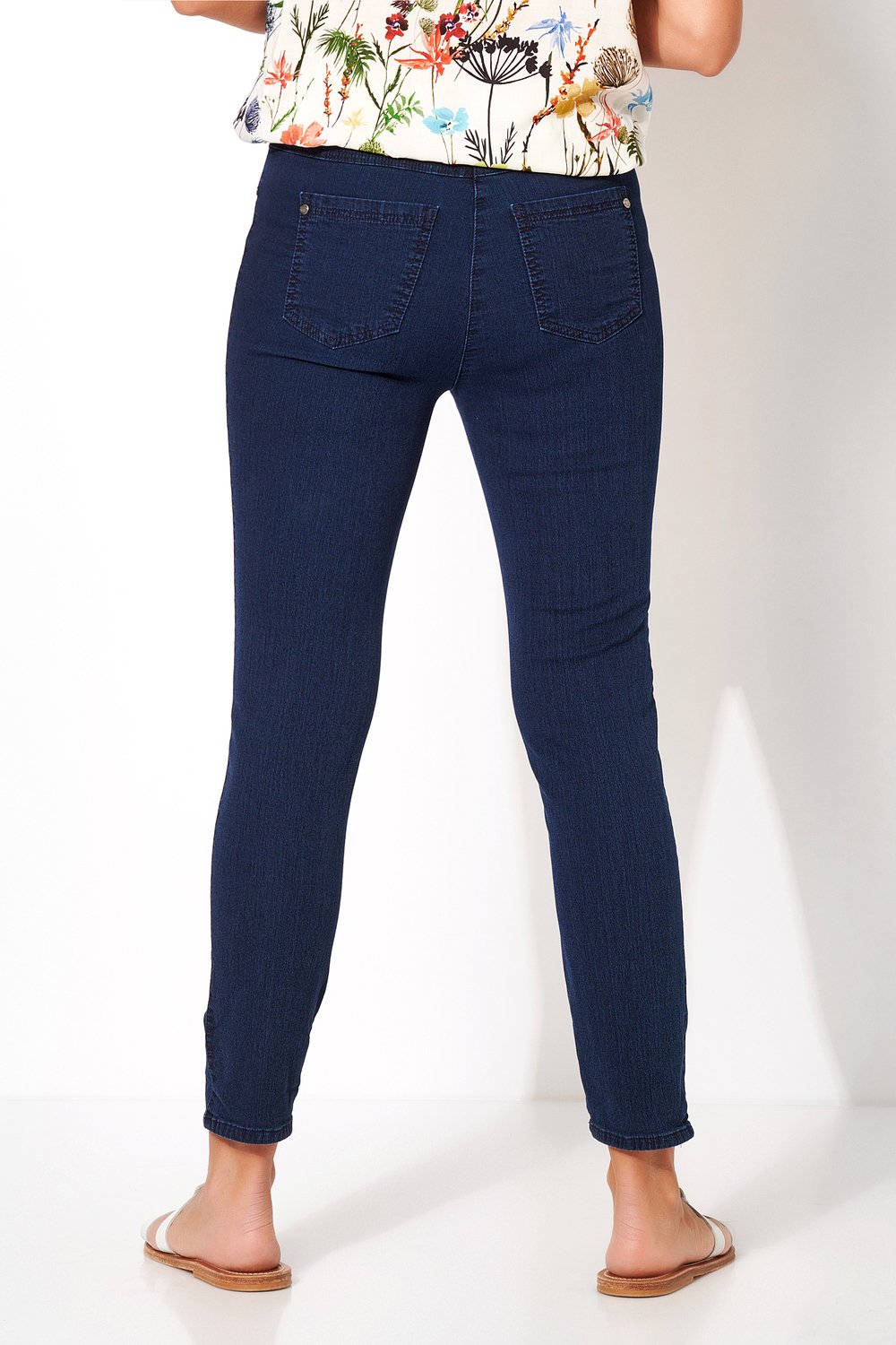 Однотонные зауженные брюки с высокой посадкой. Застежка на скрытую молнию и пуговицу. Боковые изогнутые карманы спереди, накладные карманы сзади. Длина позволяет оголять щиколотки, что визуально стройнит силуэт и вытягивает рост.