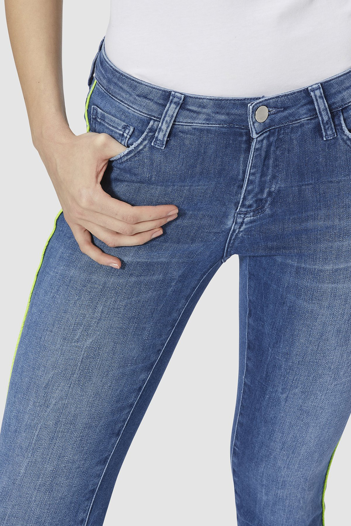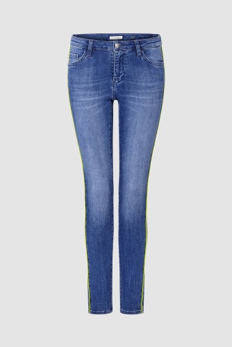 Супер-мягкие джинсы воплощают тренд на неоновые элементы очень элегантно - с тонкой тесьмой по бокам. С ними вы можете сделать модное заявление, которое не доминирует над общим образом. Средняя посадка, 5 карманов, силуэт брюк выгодно подчеркивает ноги. Стильная модель, изготовленная из итальянского денима премиум-класса, отлично подходит к различным вариантам верха: от объемных рубашек до нежных блузок.