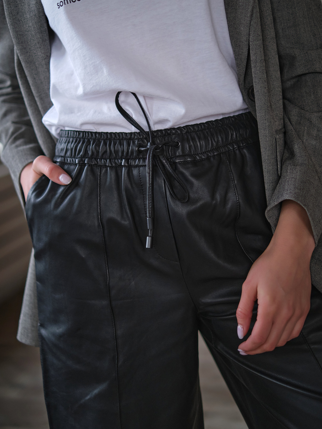 Экстравагантные кожаные шорты могут стать яркой акцентной деталью в совокупности со сдержанным верхом. Смелый и невероятно стильный атрибут гардероба по-настоящему стильной женщины. Свободный силуэт, длина до колена, эластичный пояс на кулиске.