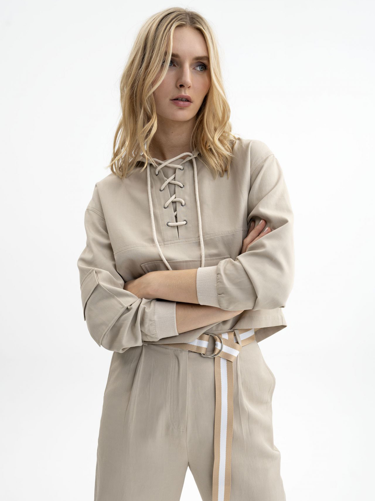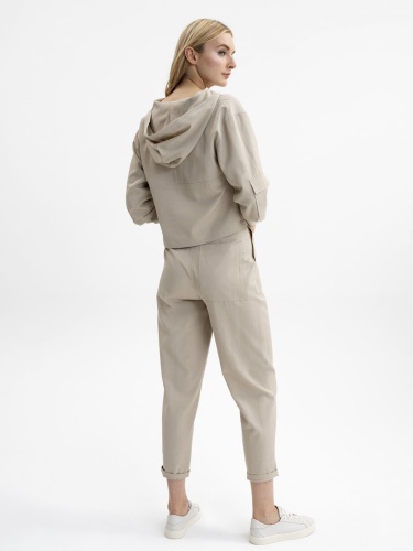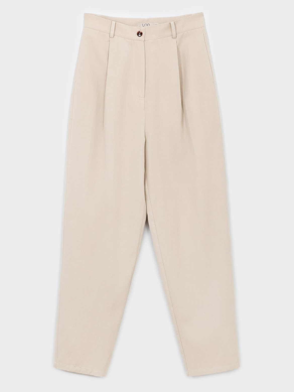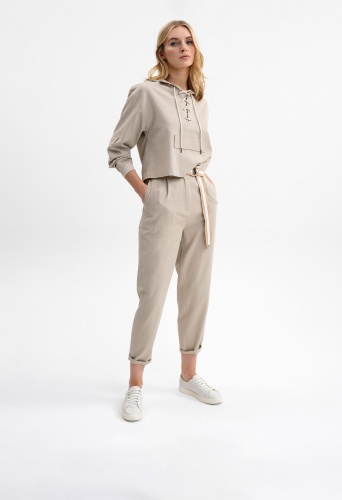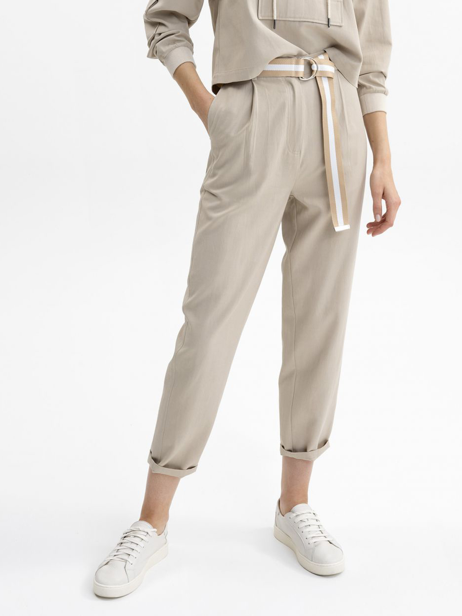 Однотонные бежевые брюки прямого кроя с подворотами. Комфортная высокая посадка. Пояс со шлевками. В комплекте идет ремень в полоску.