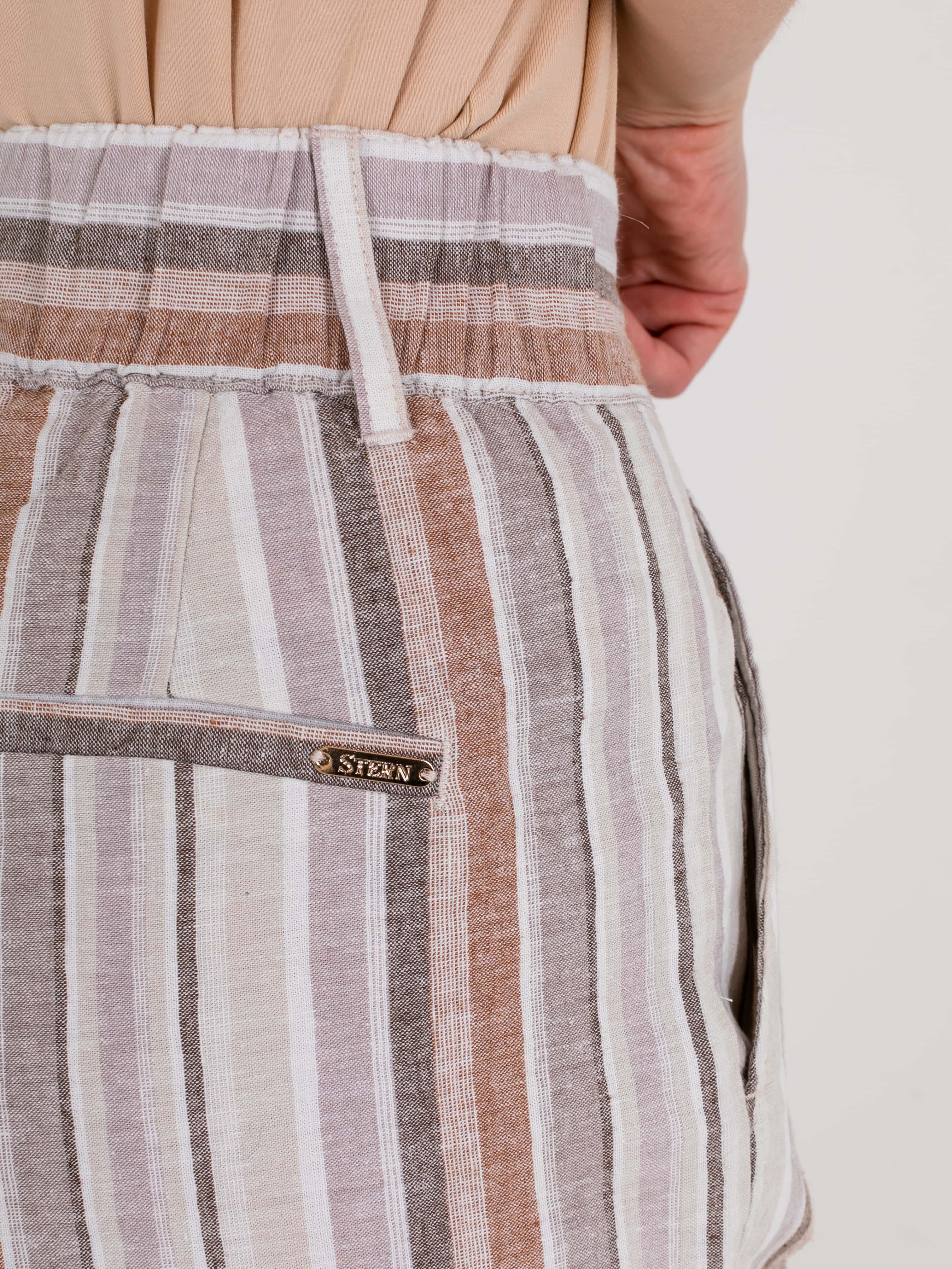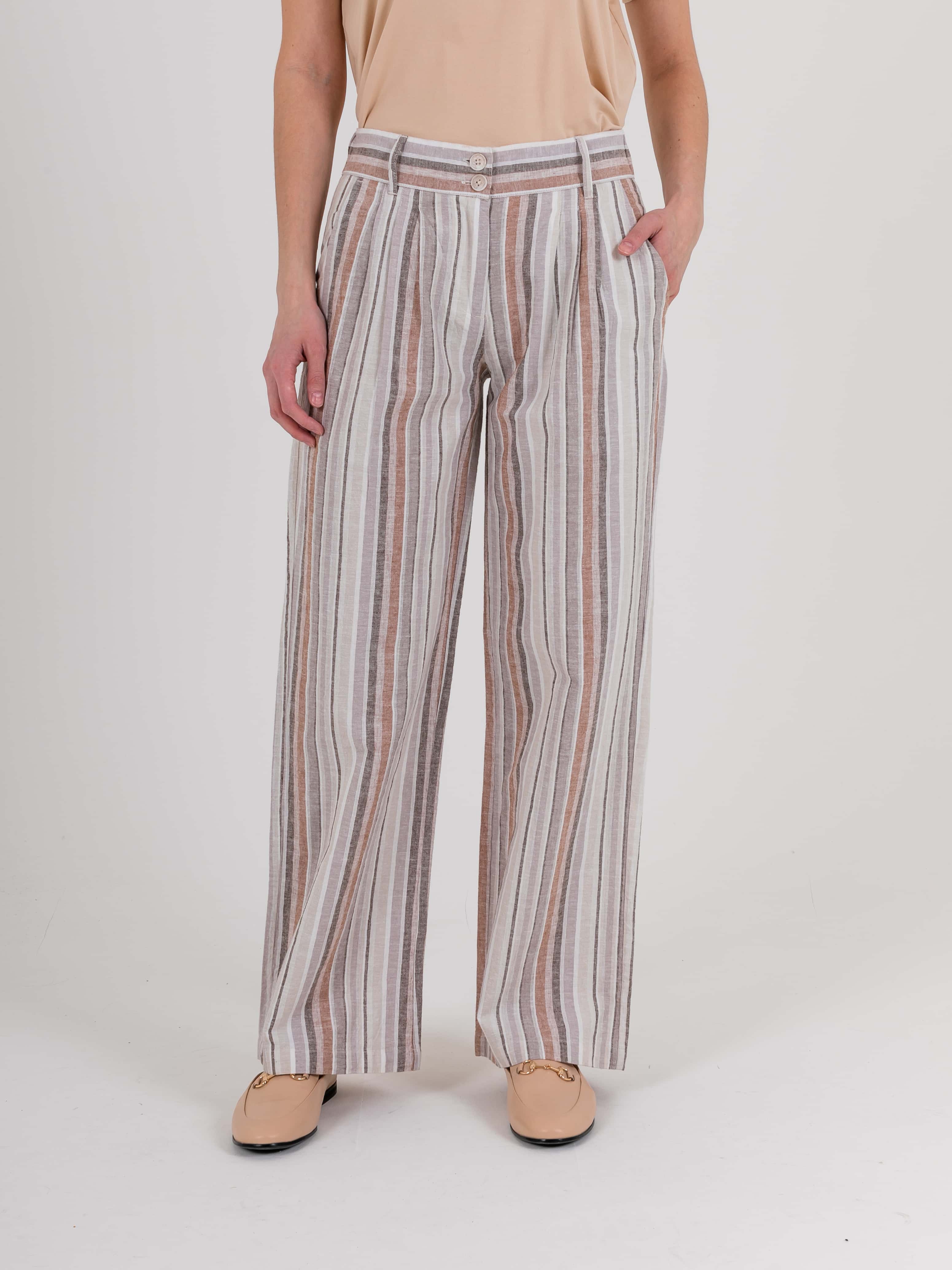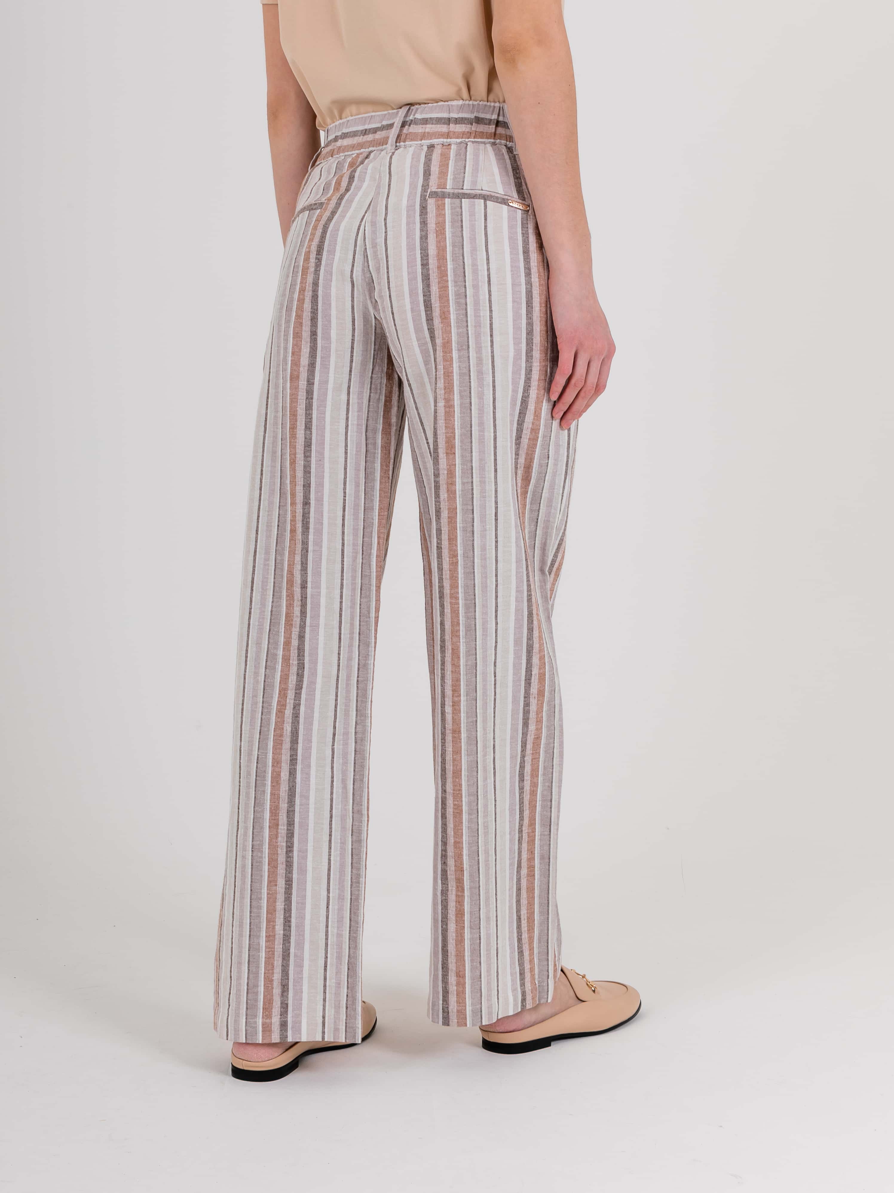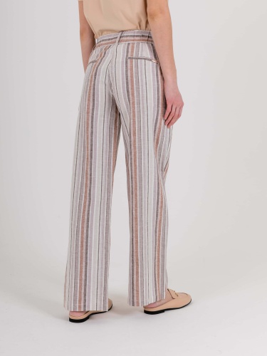 На сайте указаны российские размеры. Ткань: комфортный для тела, максимально дышащий материал изо льна и хлопка (55% лен, 45% хлопок). Крой: летние расклешенные брюки со средней посадкой. Благодаря продольной полоске визуально удлиняют силуэт, делая его стройным и подтянутым. Имеет два функциональных кармана спереди и два прорезных – сзади. Качественный крой и идеальная посадка обеспечивают комфорт и удобство при движении. Отделка: застегиваются на две удобные пуговицы и молнию. Шлевки на поясе позволяют дополнить брюки ремнем или поясом.