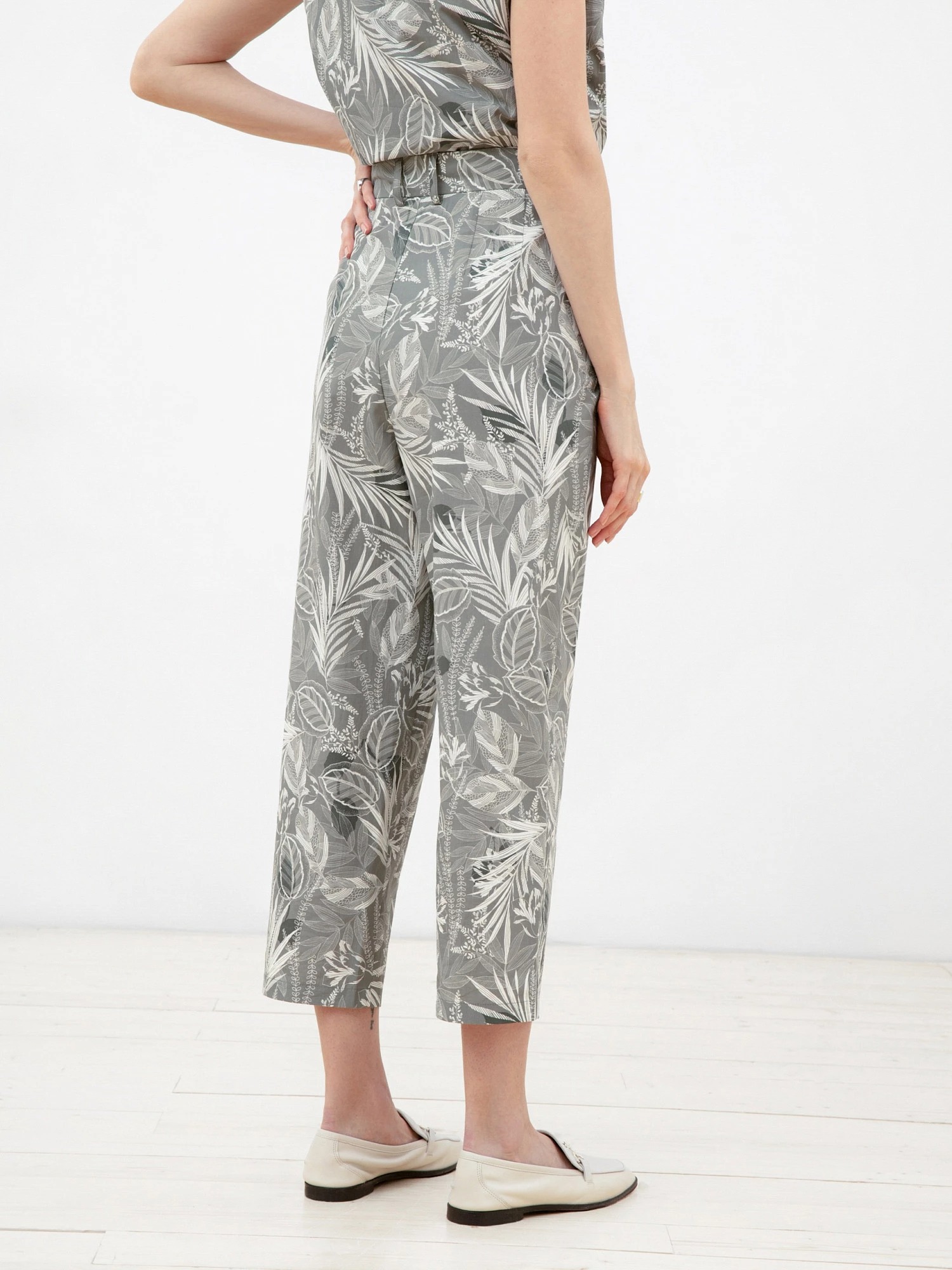 Брюки из хлопковой ткани силуэта "бананы", длиной 7/8, на притачном поясе из основной ткани. С защипами по линии пояса для наилучшей посадки. Имеют два комфортных боковых кармана.