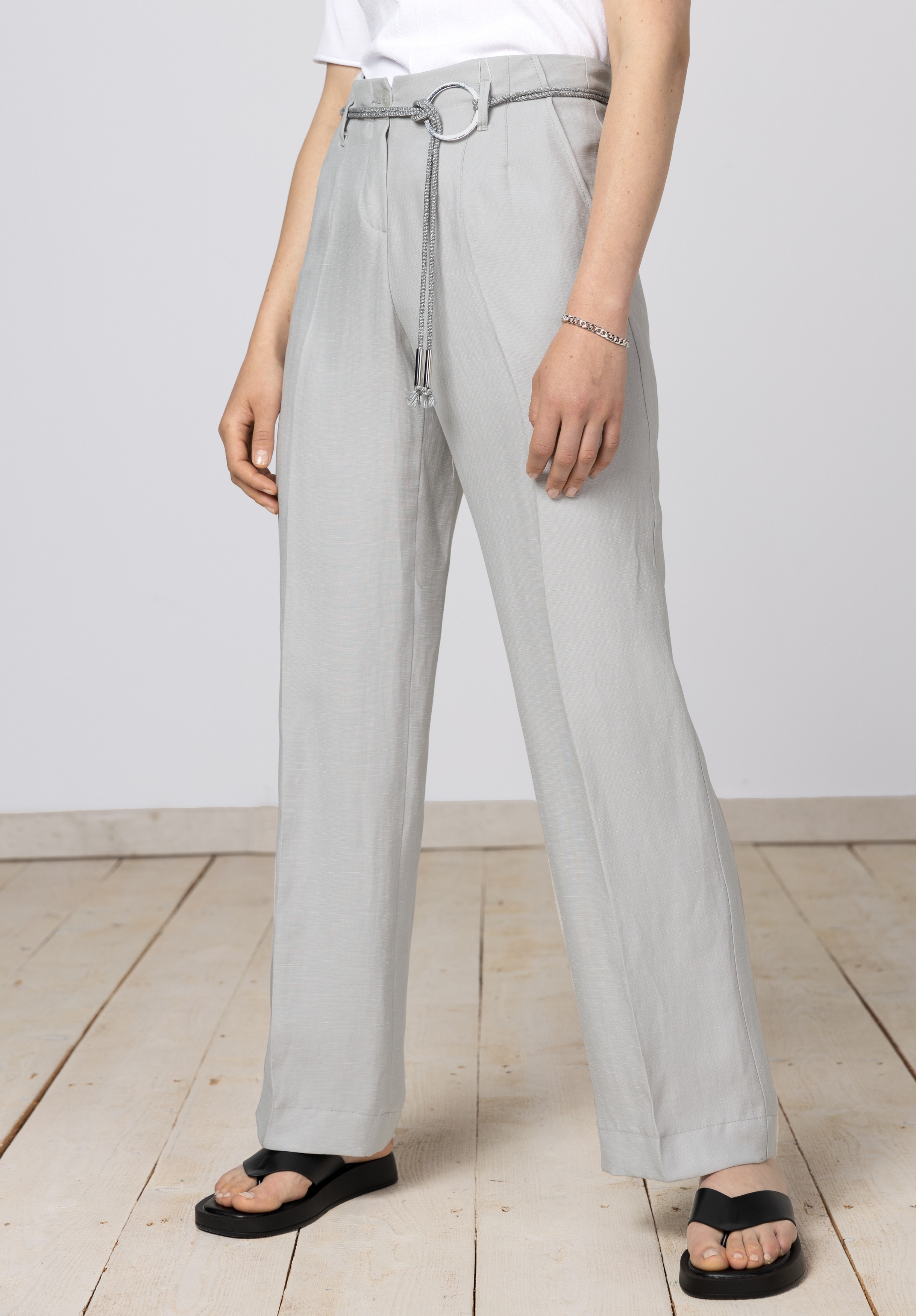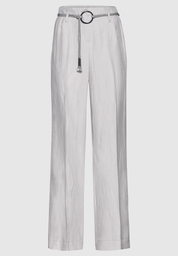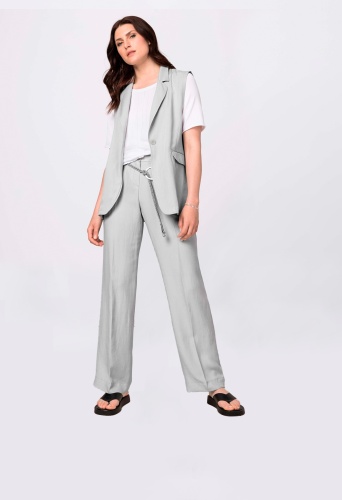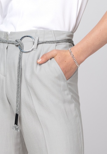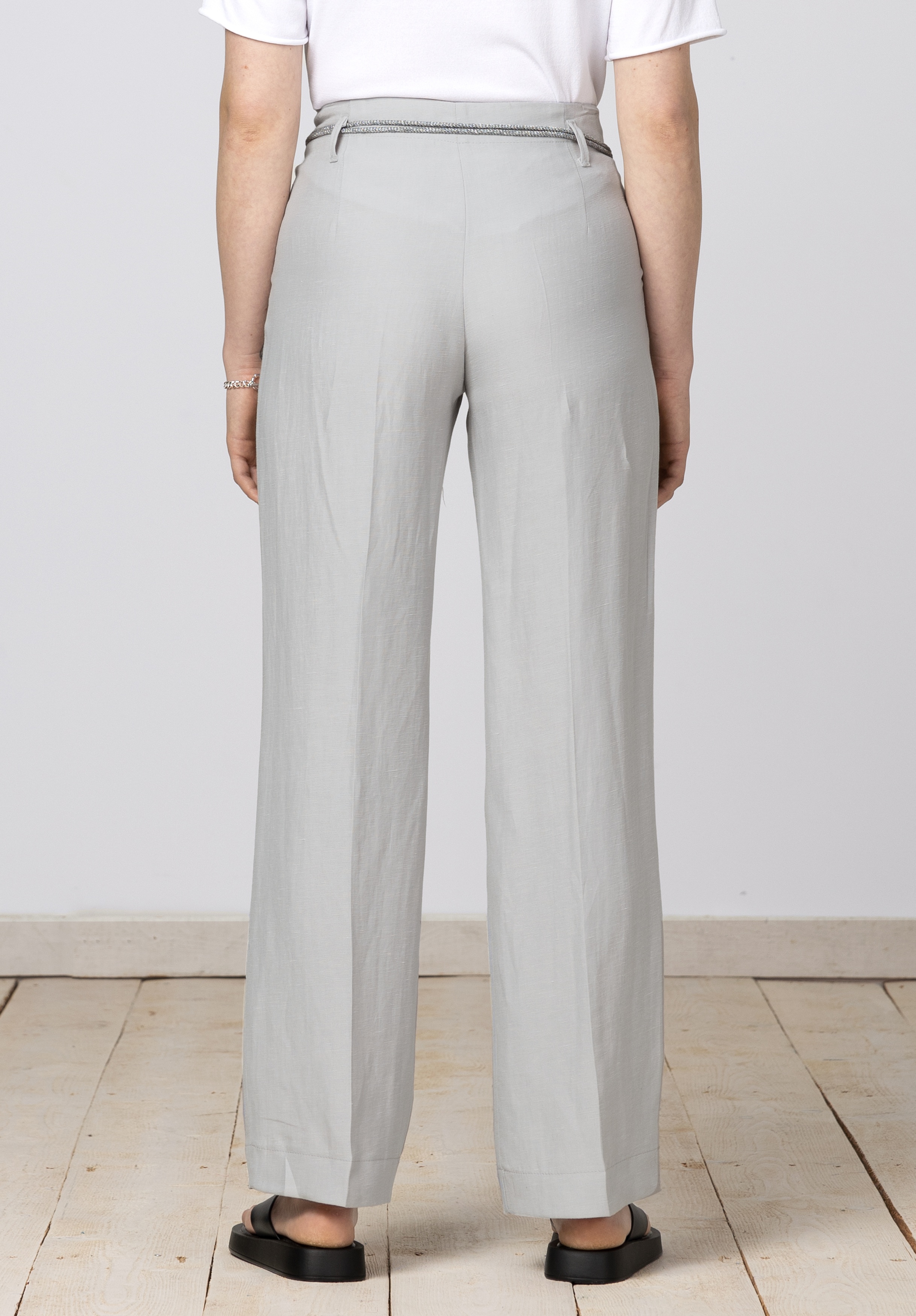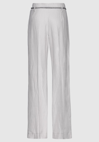 Брюки прямого кроя с застежкой-молнией, шлевки для ремня с соответствующим ремнем. Заметные швы на поясе, отутюженные складки с обеих сторон.