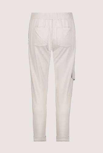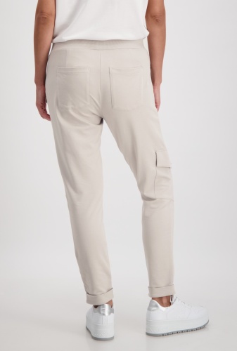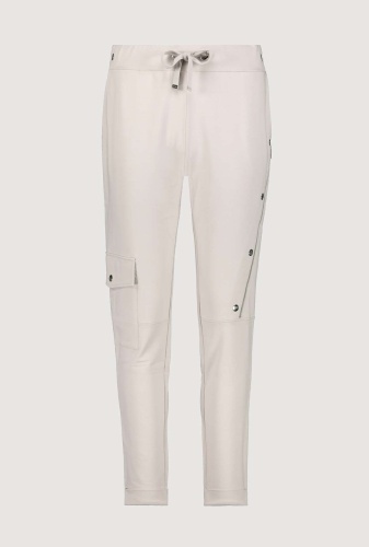 На сайте указаны российские размеры. Спортивные джоггеры monari в байкерском стиле. Пояс украшен декоративными пуговицами, талия на кулиске с проушинами и завязками, а также ребристая спинка. Боковые карманы, накладной карман с клапаном на уровне колена на правой штанине и диагональный шов с застежкой-молнией и декоративными пуговицами на левой штанине завершают дизайн довольно простой модели джоггеров. Параметры модели: 42 размер, рост 179 см