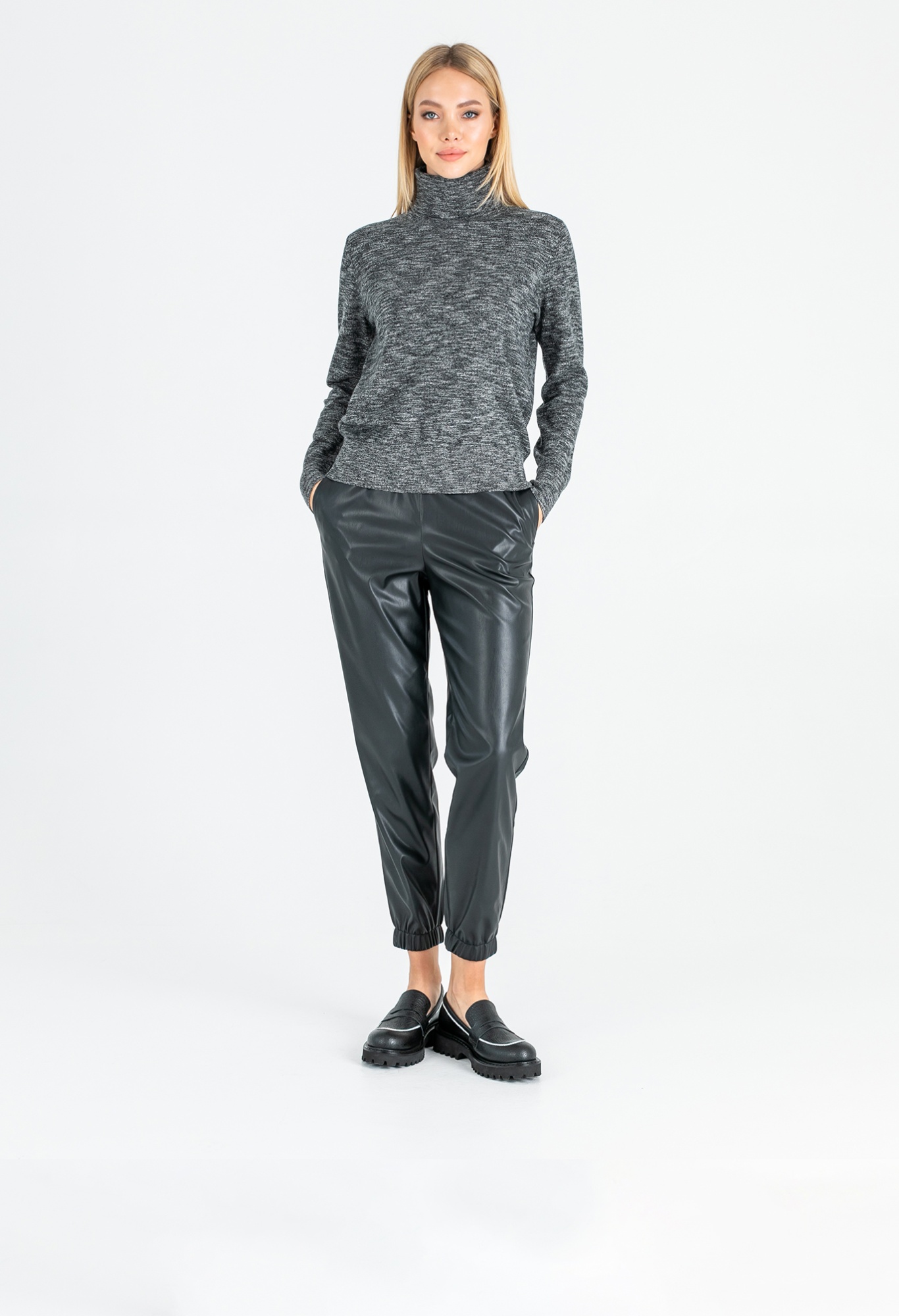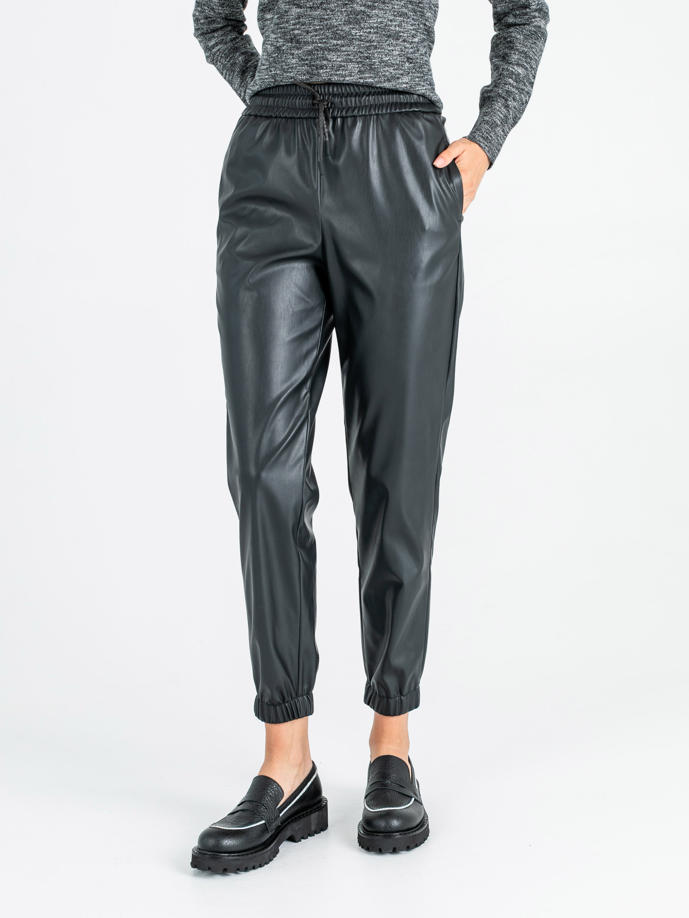 На сайте указаны российские размеры. Брюки-чинос на резинке с регулируемой талией. Впереди 2 больших кармана. Низ брюк оформлен резинкой. Ткань: 55% полиуретан, 40% поливискоза, 5% эластан. Практичный материал, загрязнения с которого легко удаляются влажной салфеткой, что особенно актуально в межсезонье. Крой: брюки свободного прямого силуэта из гладкой искусственной кожи классического черного цвета. Имеют высокую посадку с поясом-резинкой, благодаря чему их легко надевать. Эластичные манжеты в нижней части брюк плотно прилегают к телу – оценить эти достоинства смогут те, кто будет носить их в холодное время года. Удобные функциональные карманы по бокам поместят в себя то, что всегда нужно держать под рукой – телефон, карту и ключи от машины. Отделка: регулировать размер пояса можно при помощи тонкого шнура. Параметры модели: размер 39-42 (86-61-91) Рост 177 см