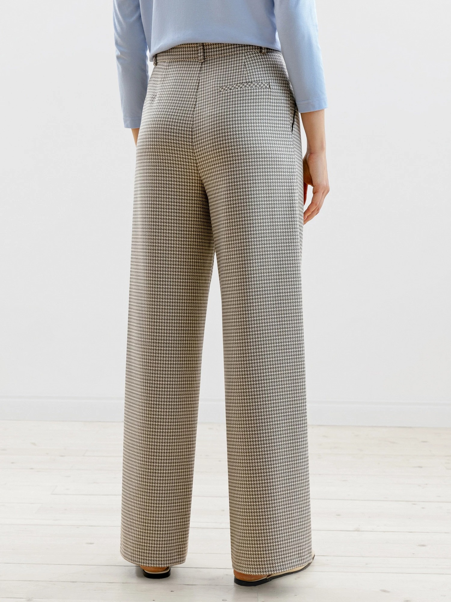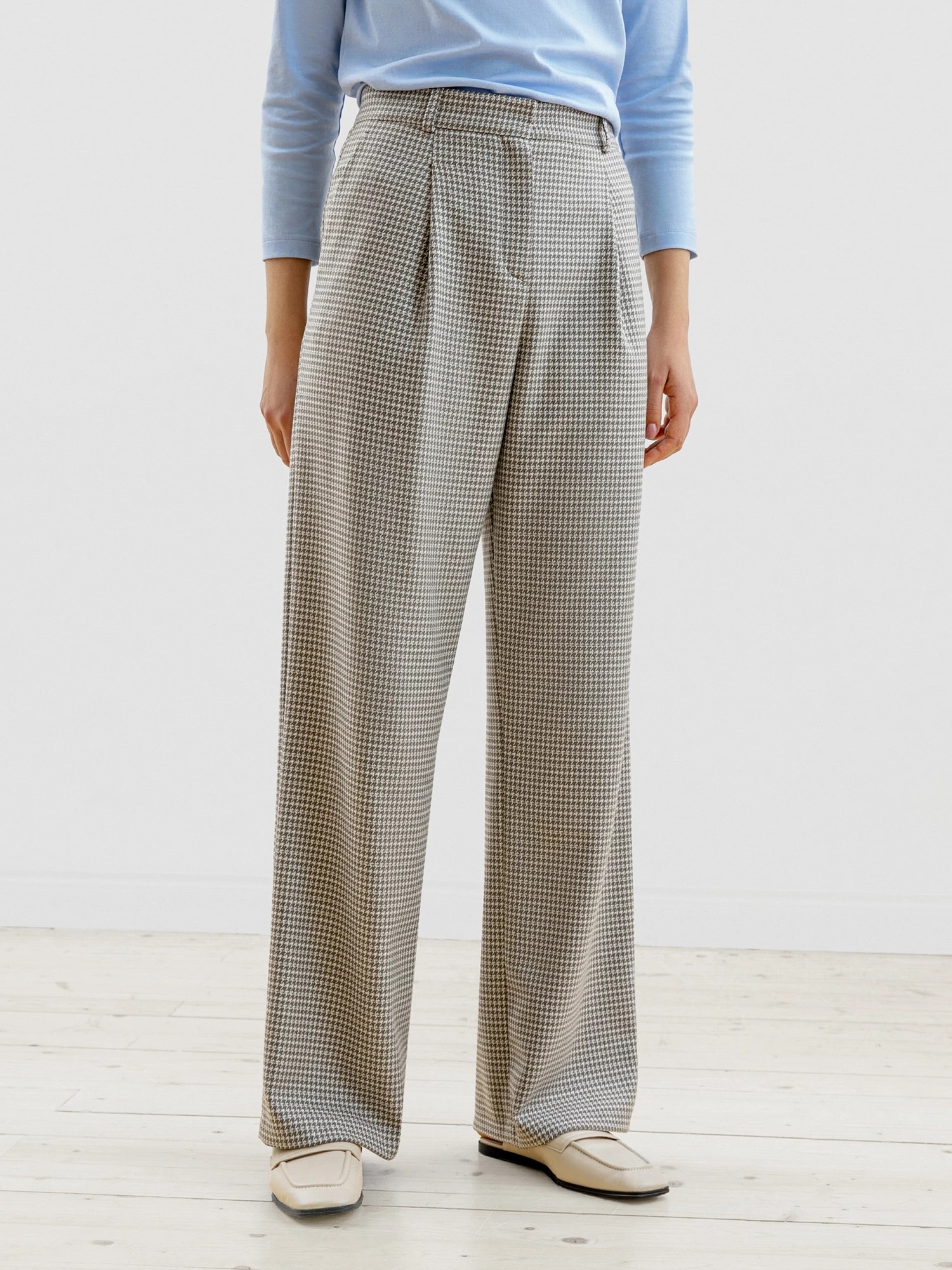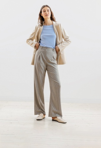 На сайте указаны российские размеры Брюки прямого, свободного силуэта из костюмной ткани в принте гусиная лапка. С глубокими складками, карманами и притачным поясом. Модель идеально подходит к жакету из этой же ткани (арт.1109781CH0490) Рост модели на фото - 175 см.