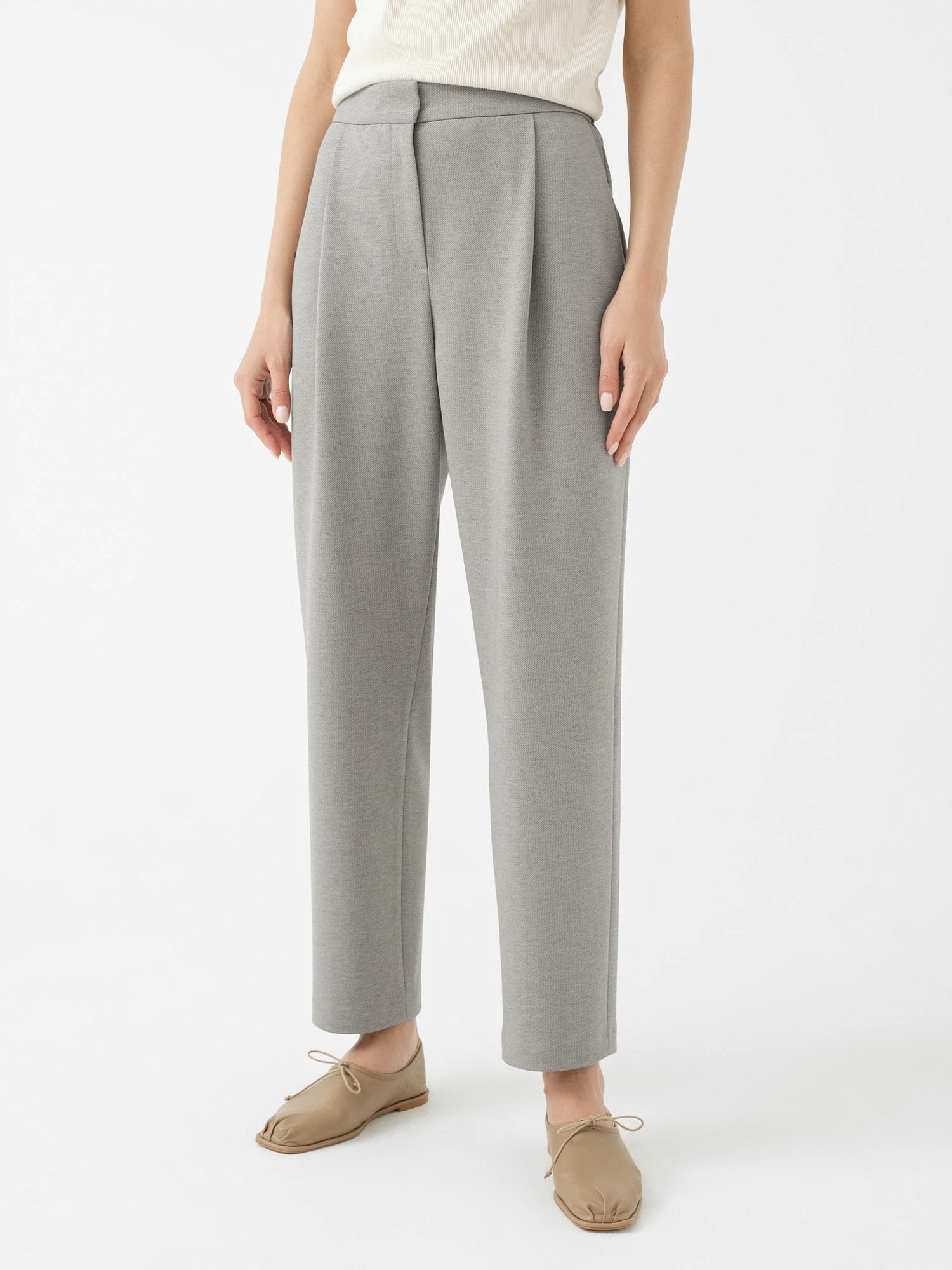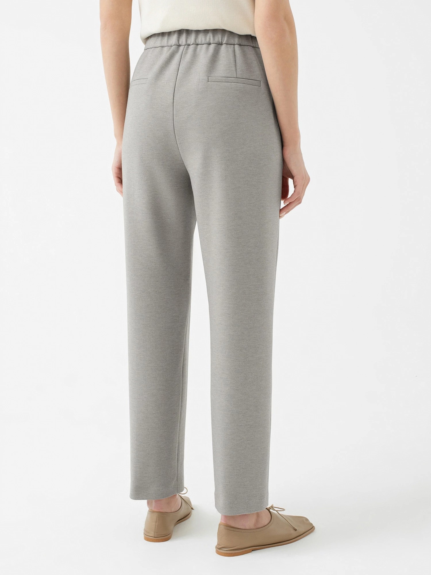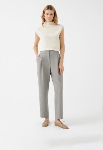 На сайте указаны российские размеры. Брюки со стрелками из мягкого трикотажного полотна прямого свободного силуэта на притачном поясе с боковыми рабочими карманами. Застёжка спереди на молнию и крючок. Сзади на поясе вставлена резинка для более комфортной посадки. По низу изделия манжеты с резинкой. Рост модели на фото - 175 см.