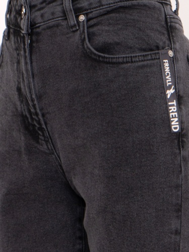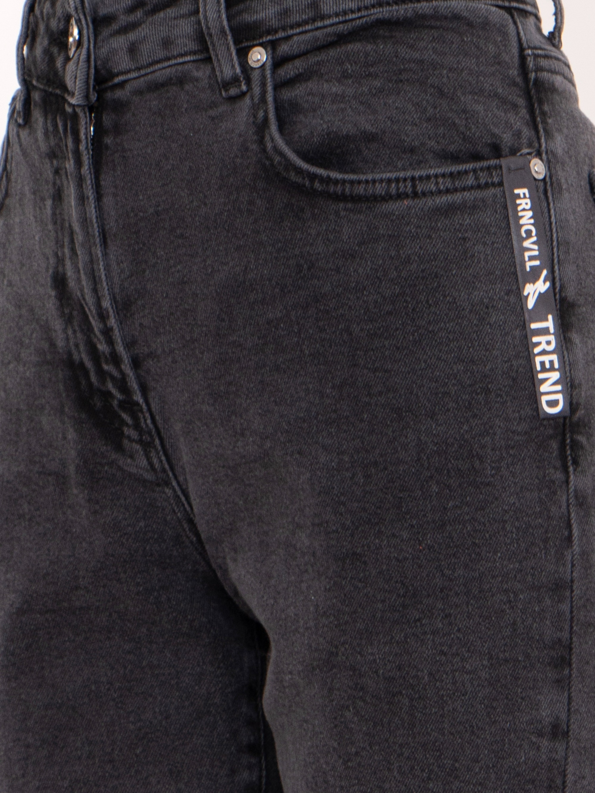 На сайте указаны российские размеры. Темно-серые джинсовые брюки клеш из плотного денима на молнии, с косыми и накладными карманами, с передними разрезами. Рост модели: 175 см Длина брюк: 77 см