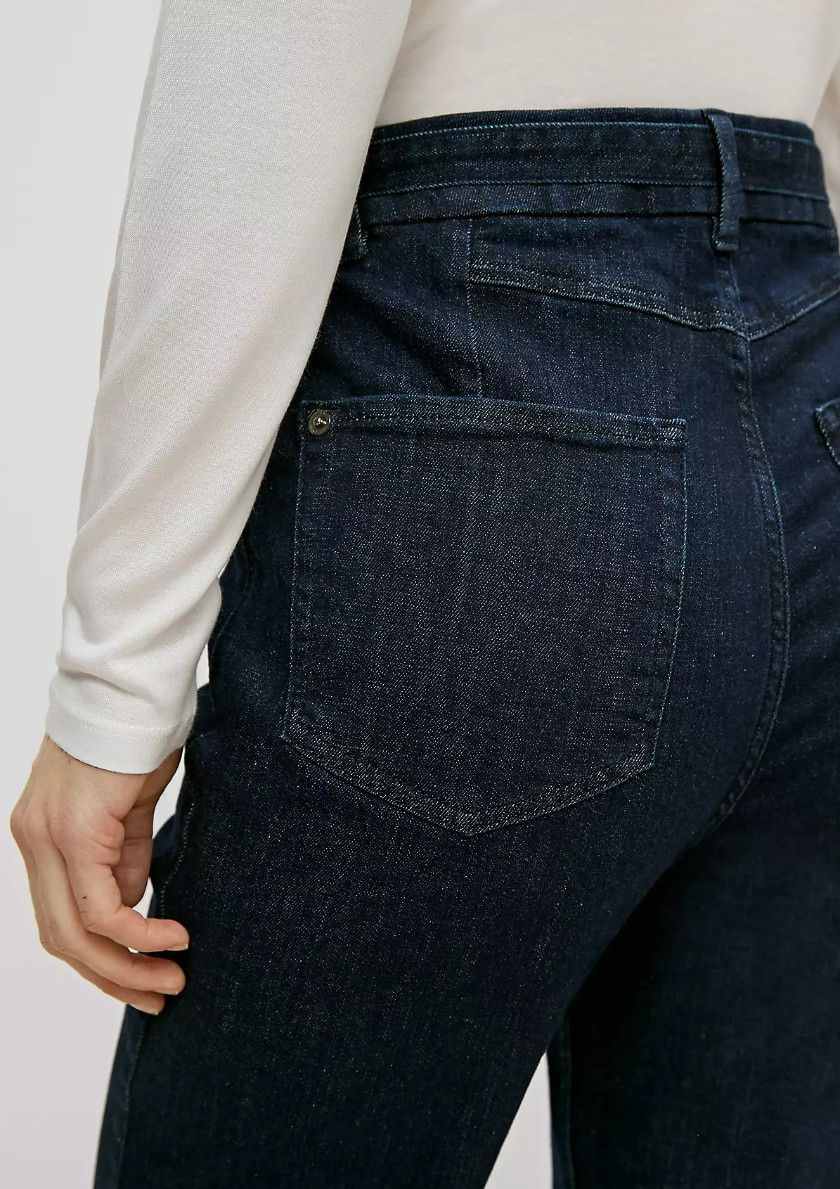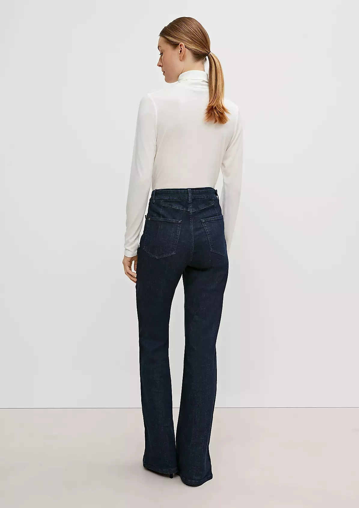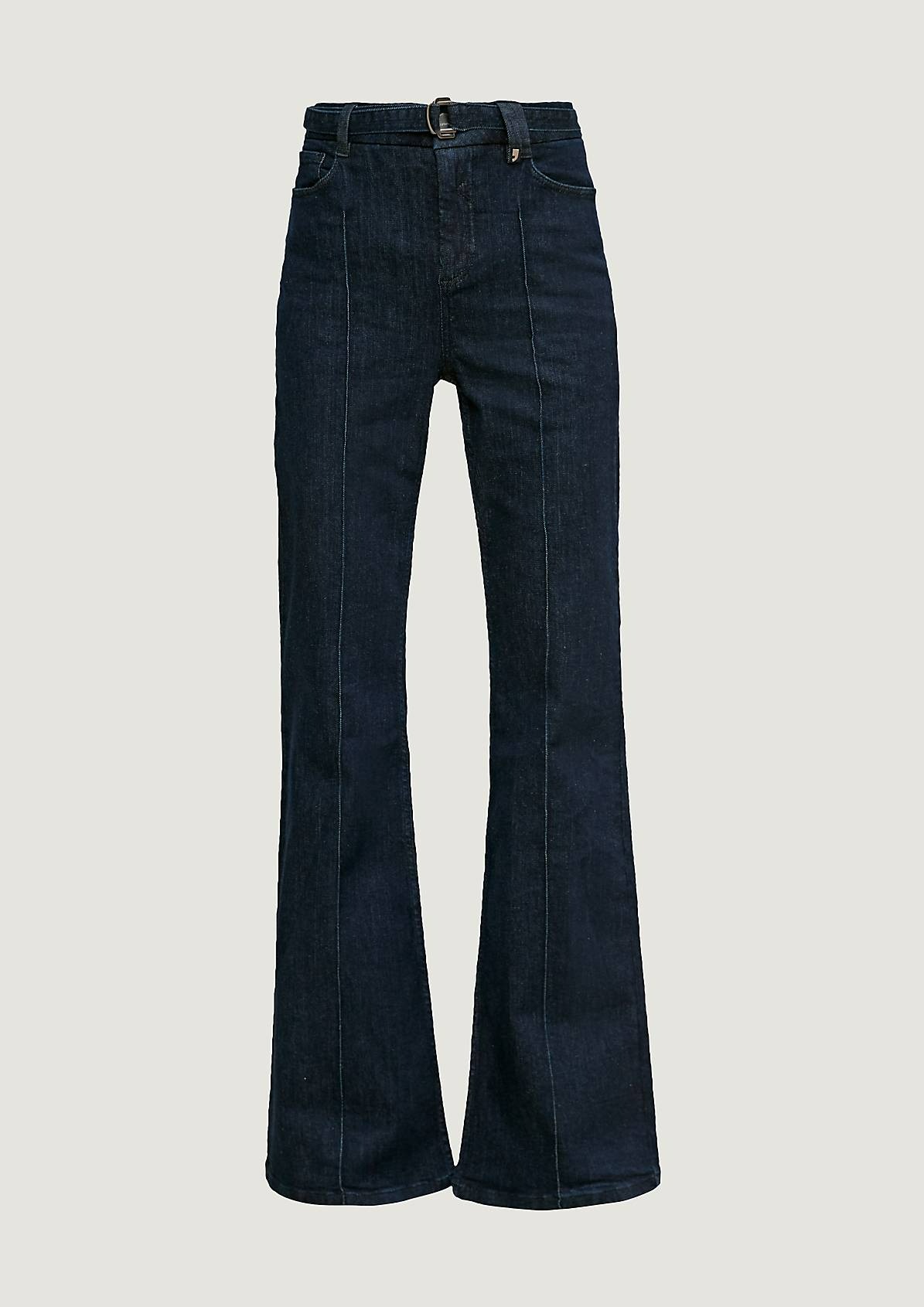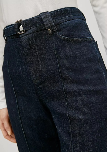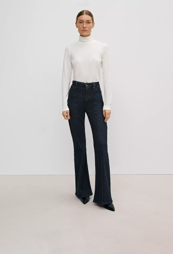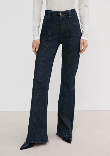 На сайте указаны российские размеры. Расклешенные брюки джинс с высокой посадкой. ТТканевый ремень с D-образной пряжкой. Длина штанины по внутренней стороне для размера 42 около 80 см. Рост модели 173 см.