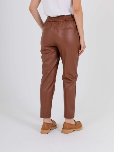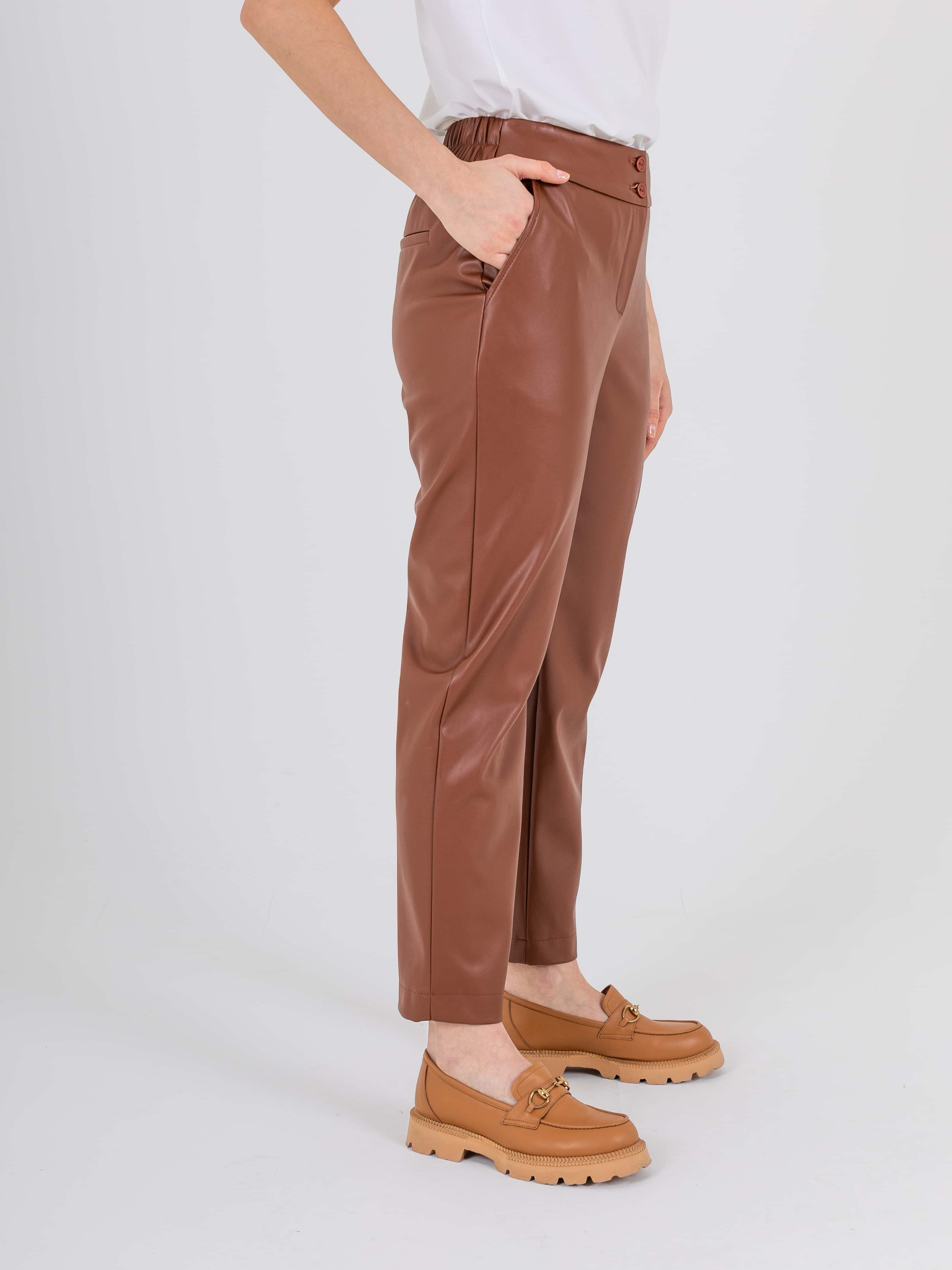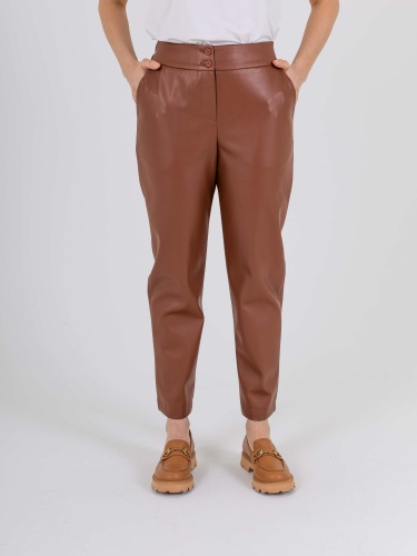 Прямые брюки с завышенной талией длиной до щиколотки с застежкой на молнию и 2 пуговицы. Брюки слегка зауженные книзу. На передних половинках расположены два кармана с отрезным бочком. На задних половинках два прорезных кармана с листочками. Верх брюк обработан поясом на резинке.