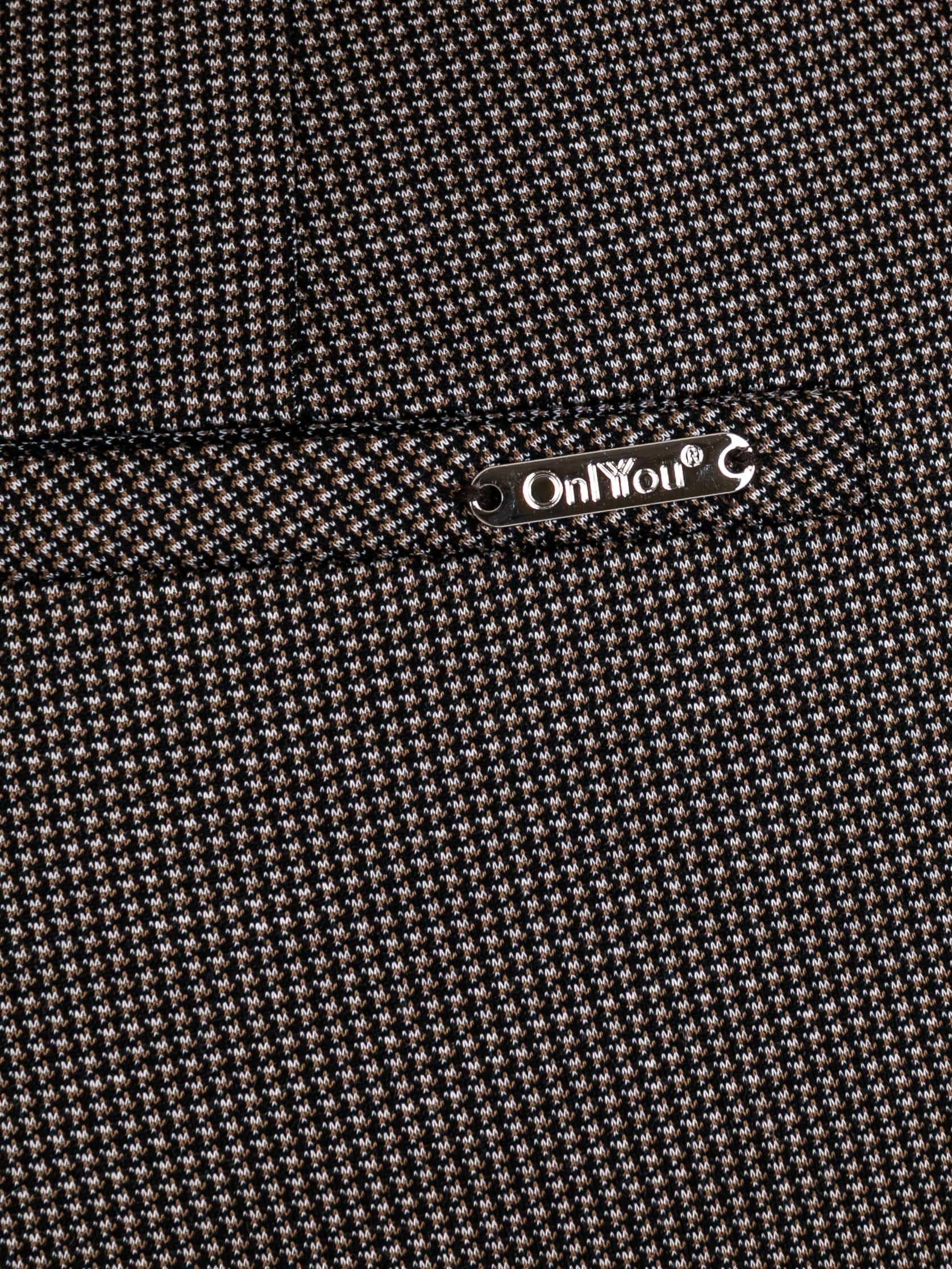 Прямые брюки с завышенной талией длиной до щиколотки с застежкой на молнию и 1 пуговицу, дизайнерская особенность модели – принт «клетка» и лампасы в боковых швах. Брюки слегка зауженные книзу. На передних половинках расположены два кармана с отрезным бочком. На задних половинках два прорезных кармана с листочками. Верх брюк обработан поясом на резинке со шлевками.