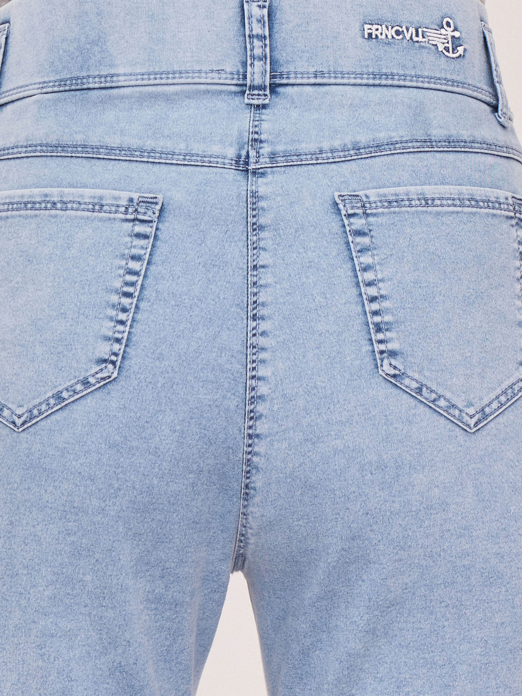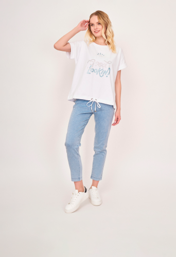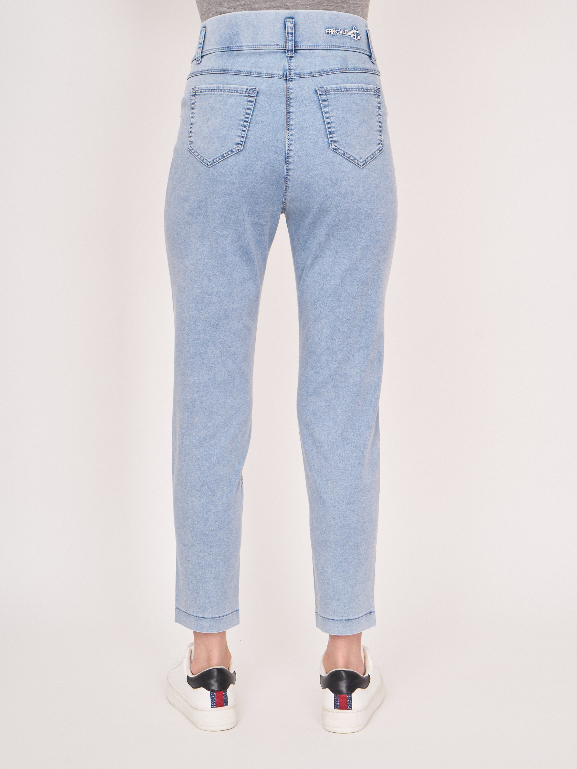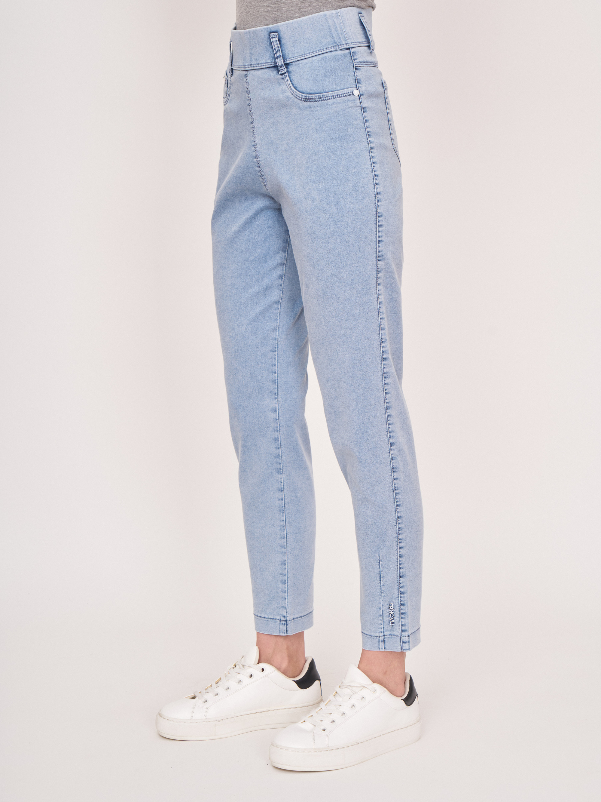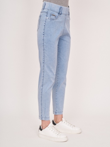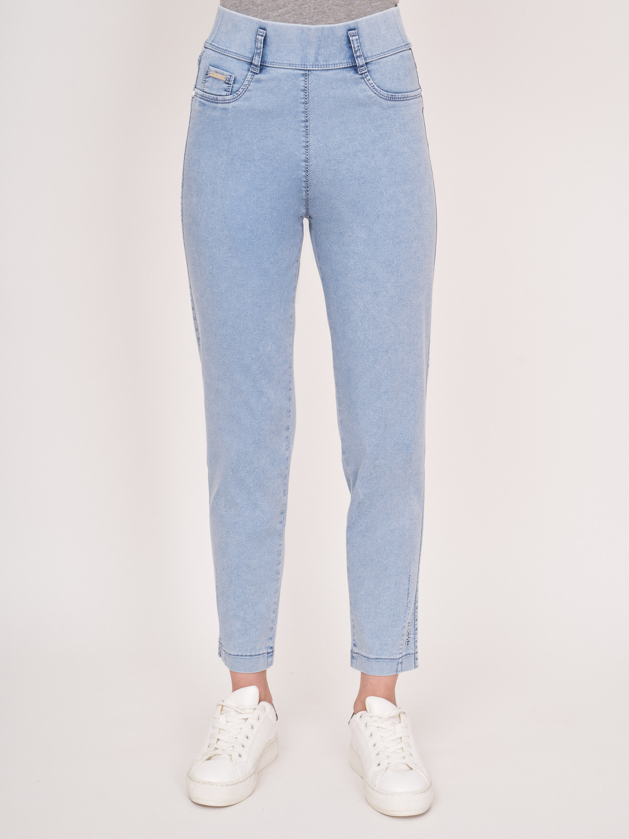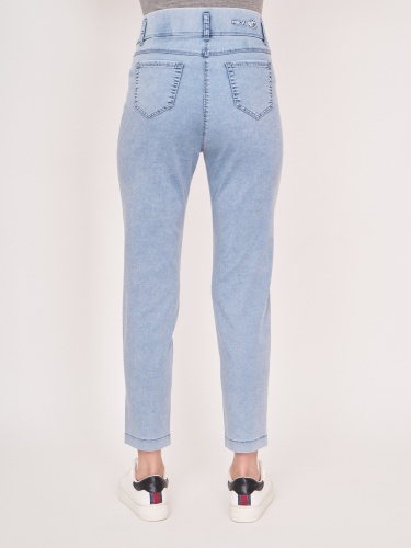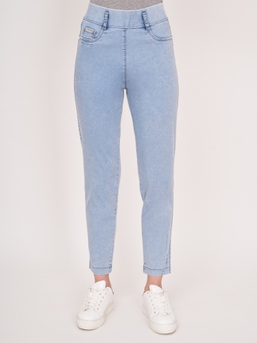 На сайте указаны российские размеры. Зауженные голубые джинсовые брюки из денима-стрейч на резинке, с накладными карманами, с боковой надписью понизу. Длина по спинке: 70 см. Рост модели: 176 см.