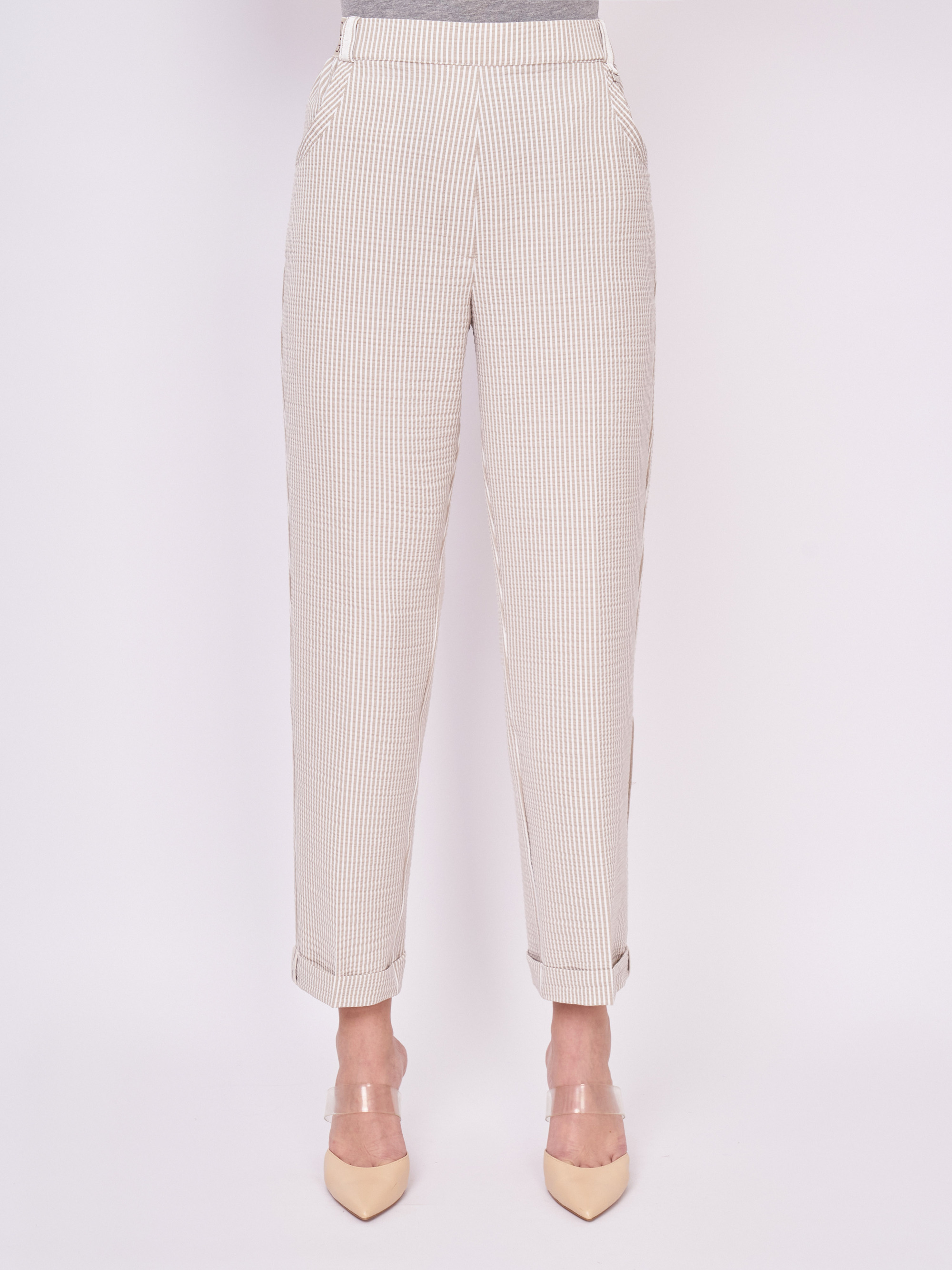 На сайте указаны российские размеры. Текстильные зауженные брюки в бело-бежевую полоску на резинке, с косыми карманами, с подворотами. Длина брючин: 71 см. Рост модели: 177 см.