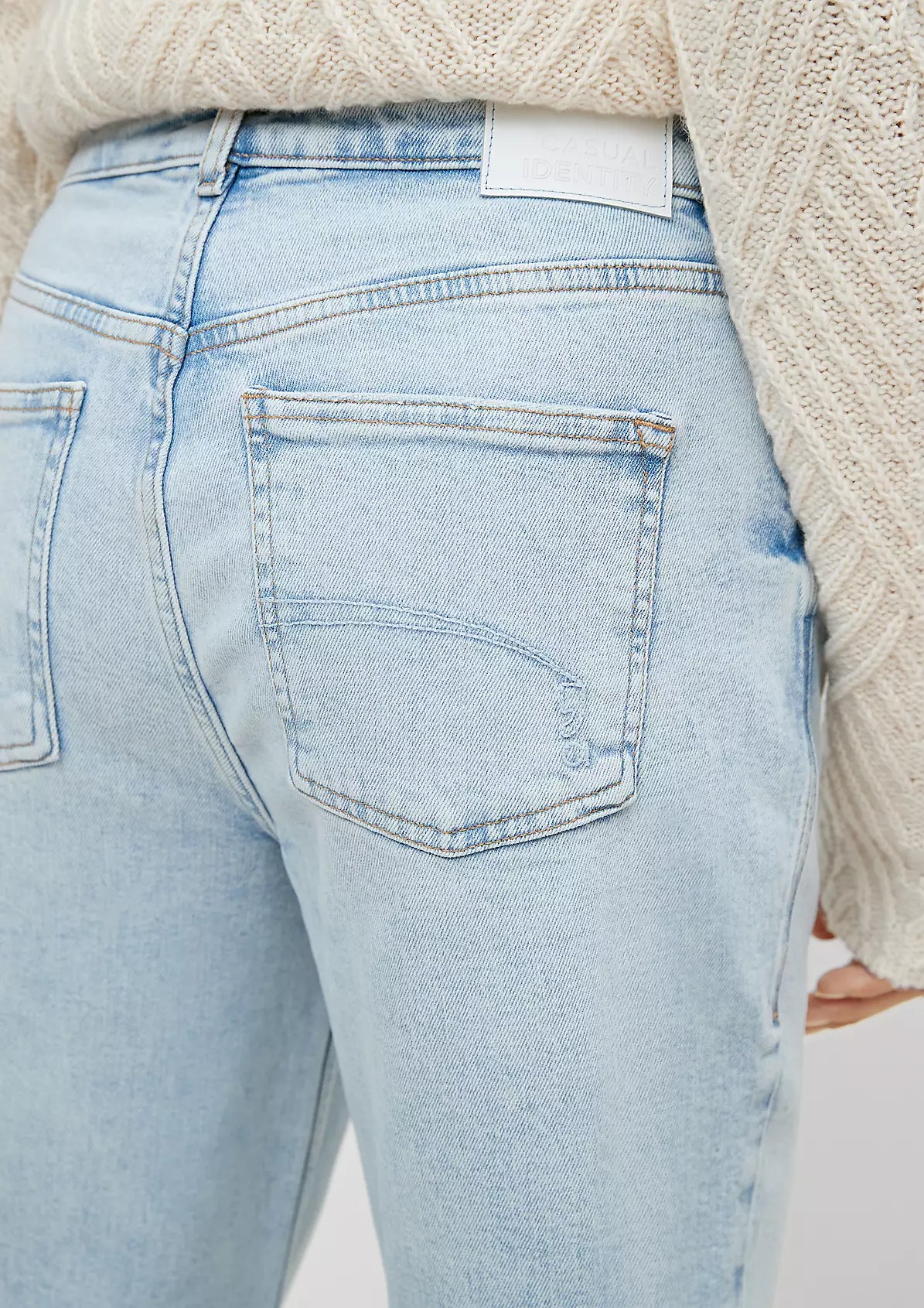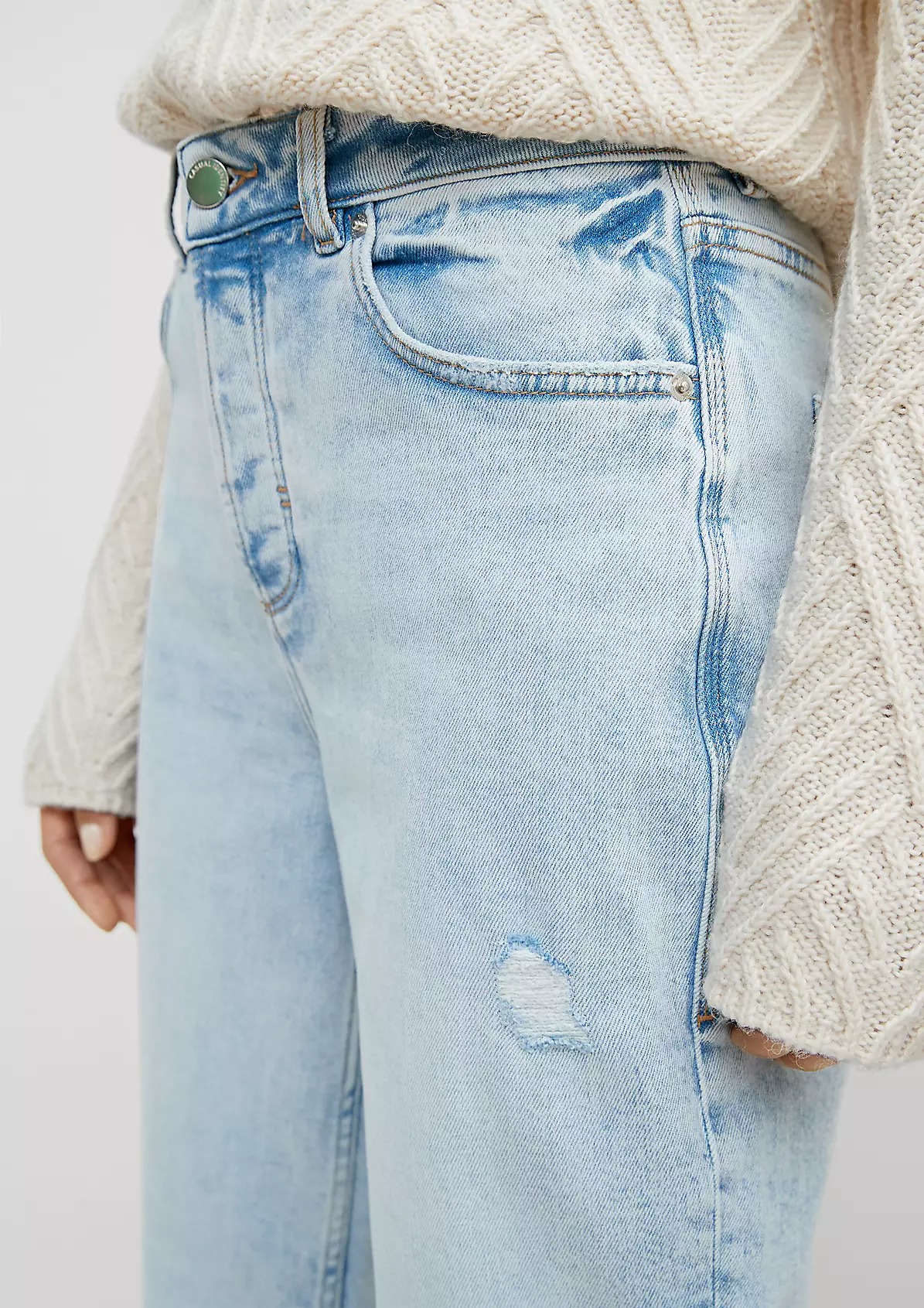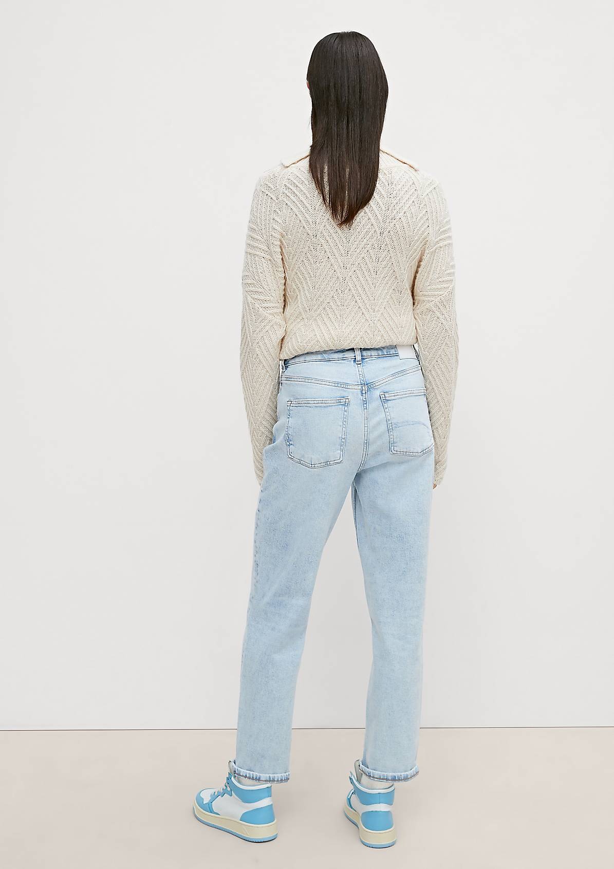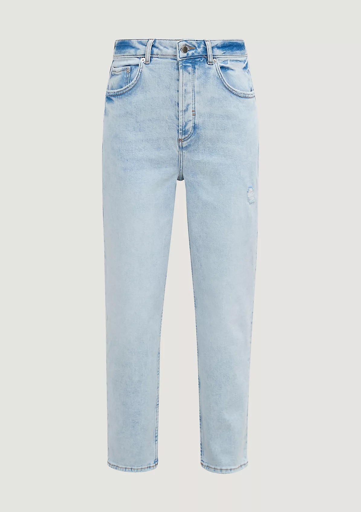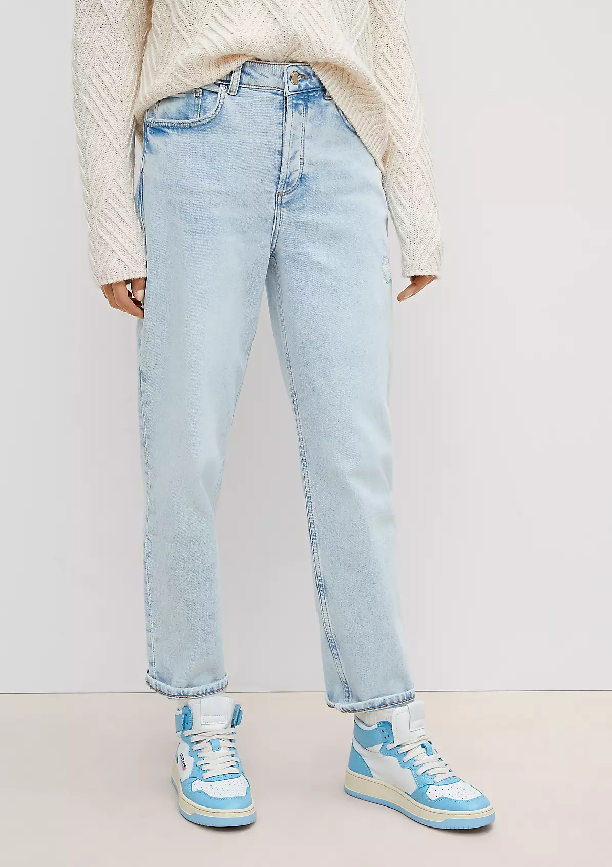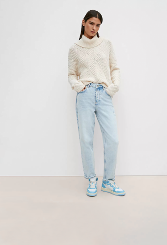 На сайте указаны российские размеры. Джинсы MOM свободного кроя на пуговице и молнии c эффектом потертости. Длина штанины по внутренней стороне для размера 42 около 69 см. Рост модели 178 см.