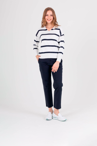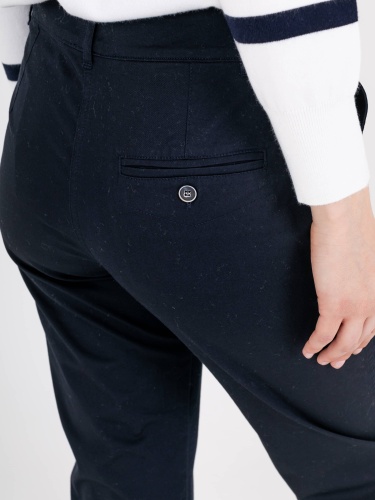 Прямые брюки с завышенной талией длиной до щиколотки с застежкой на молнию и 1 пуговицу. На передних половинках расположены два кармана с отрезным бочком. На правой задней половинке прорезной карман «в рамку» с прорезной петлей и пуговицей, для фиксации кармана. Верх брюк обработан поясом со шлевками.