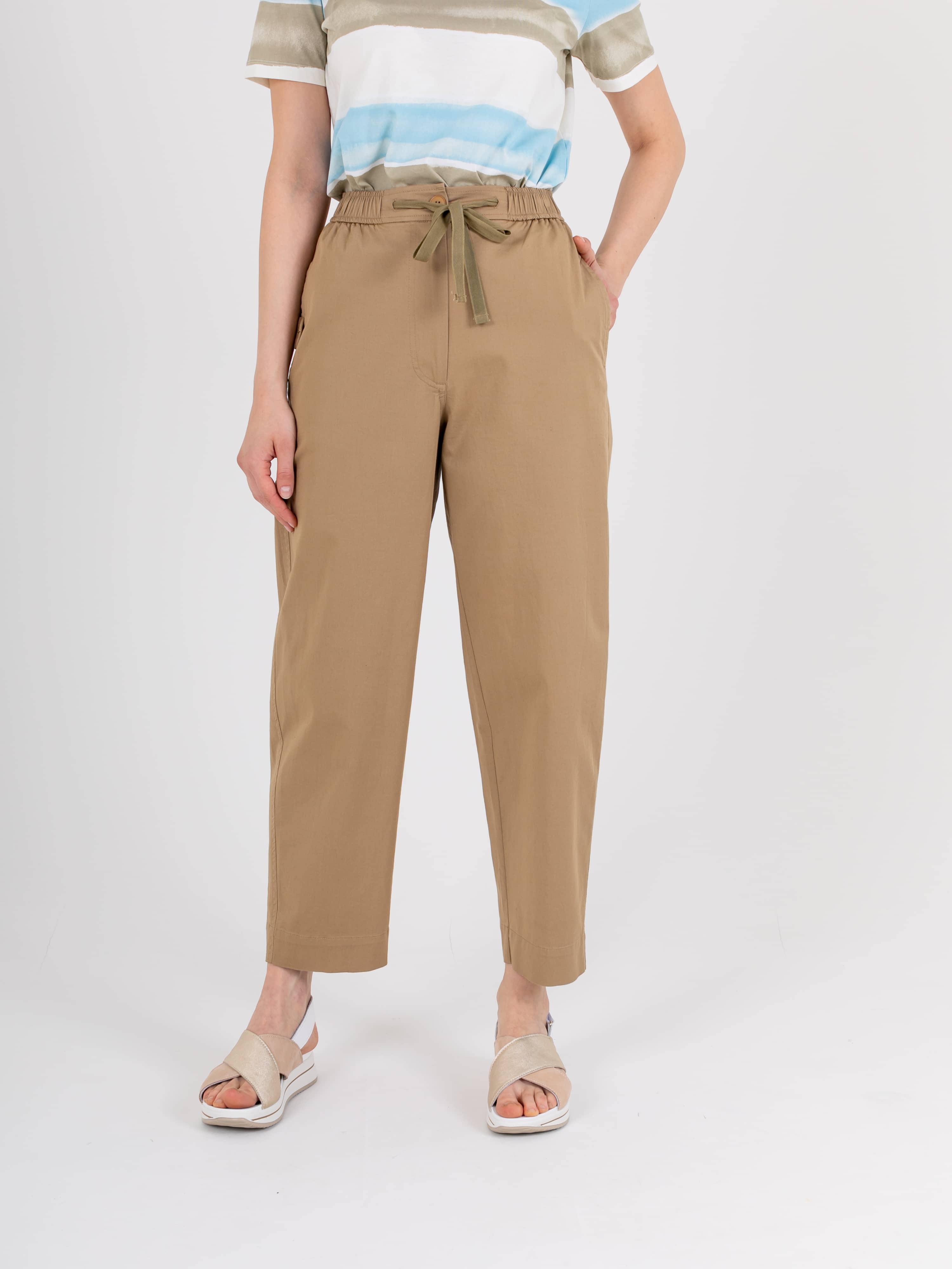 Джинсы «Carrot fit» с завышенной талией длиной до щиколотки с застежкой на молнию и 1 пуговицу. Джинсы слегка зауженные книзу. Два кармана в боковых швах с патами. На задних половинках фигурная кокетка и накладной карман. Верх брюк обработан поясом на резинке со шнуром.