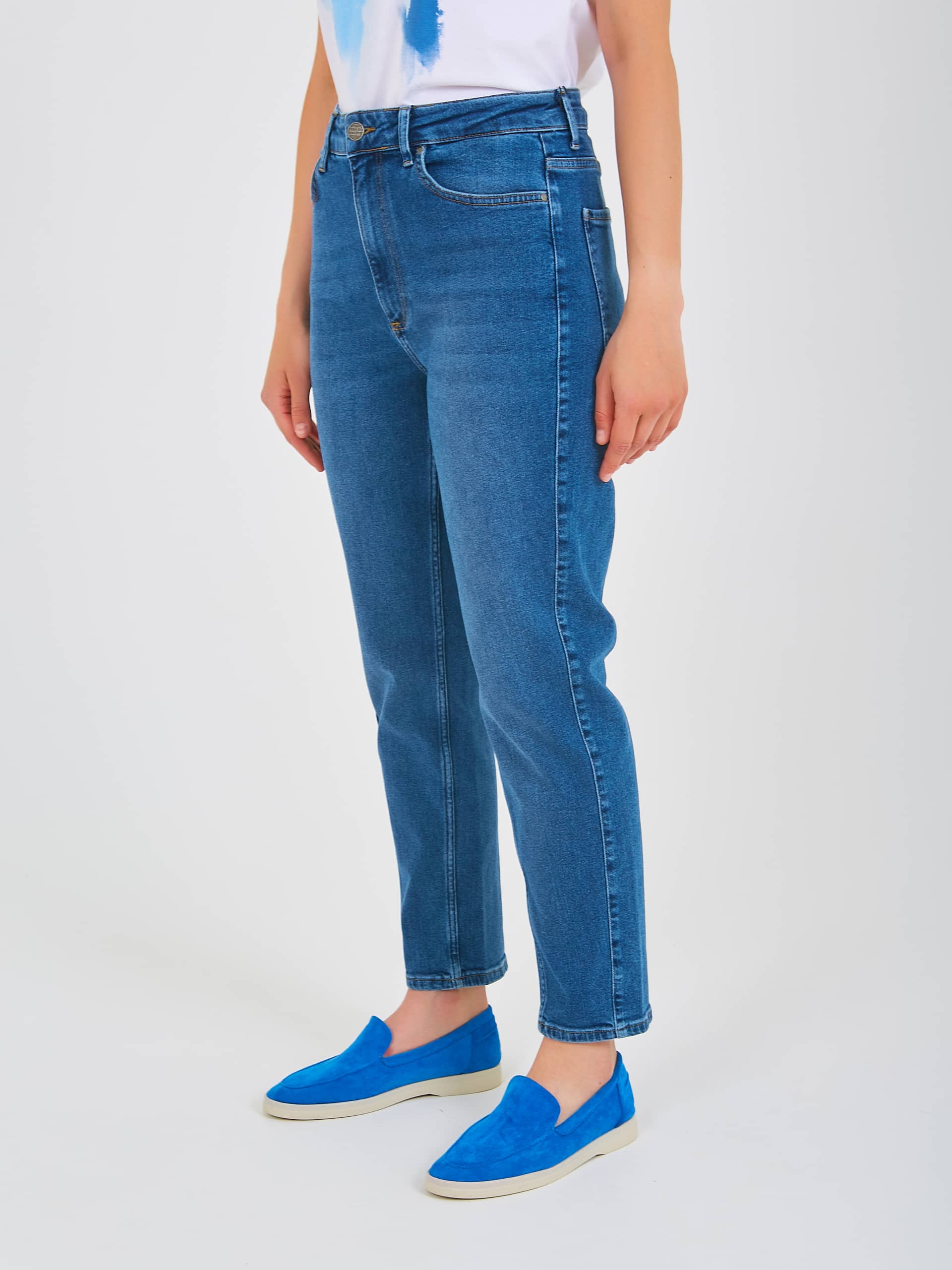 Джинсы «mom» длиной до щиколотки с застежкой на молнию и 1 пуговицу. Джинсы слегка зауженные книзу. На передних половинках расположены два кармана с отрезным бочком и один монетный карман. На задних половинках два накладных кармана и фигурная кокетка. Верх брюк обработан поясом со шлевками.