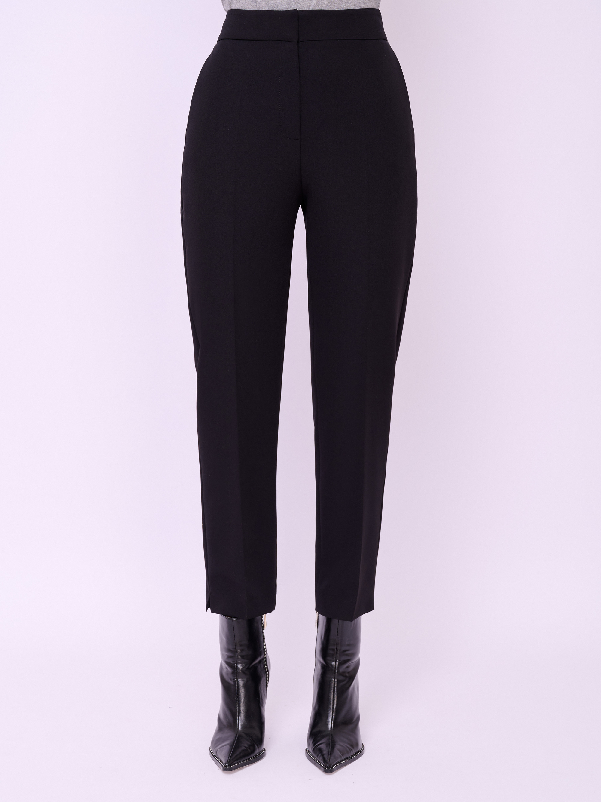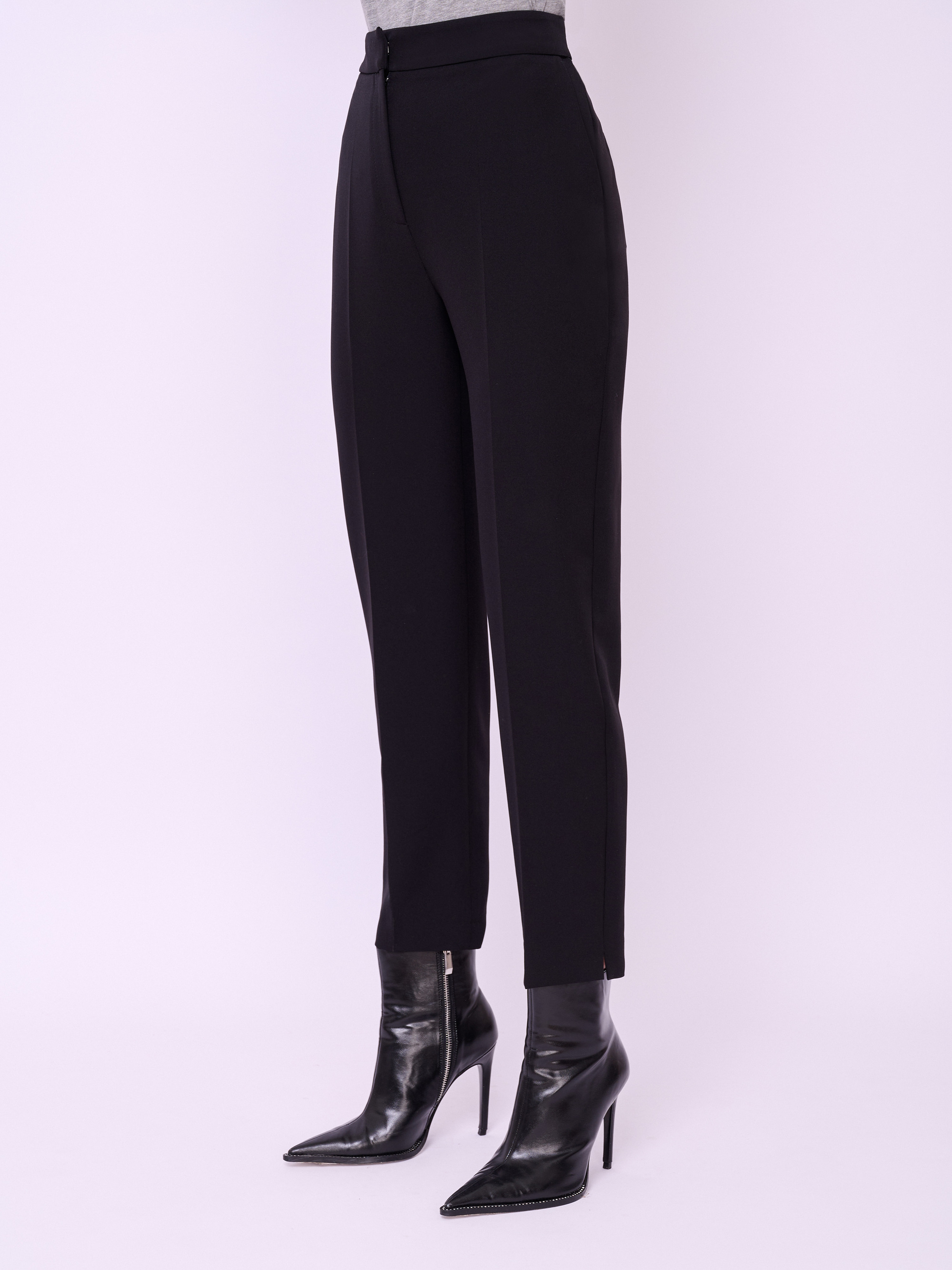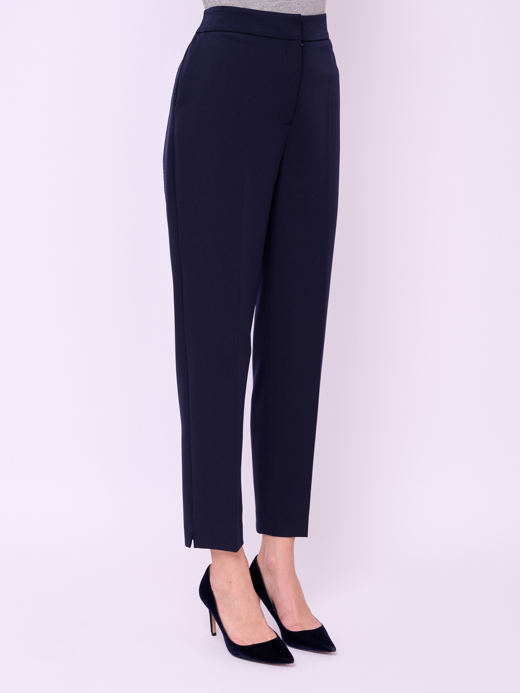 Брюки классические зауженного покроя из текстиля на молнии и резинке с косыми карманами, стрелками и небольшими боковыми разрезами по низу брючин. Длина брючин: 70 см.