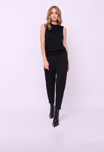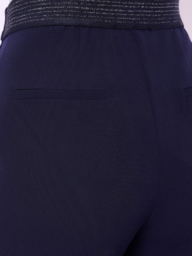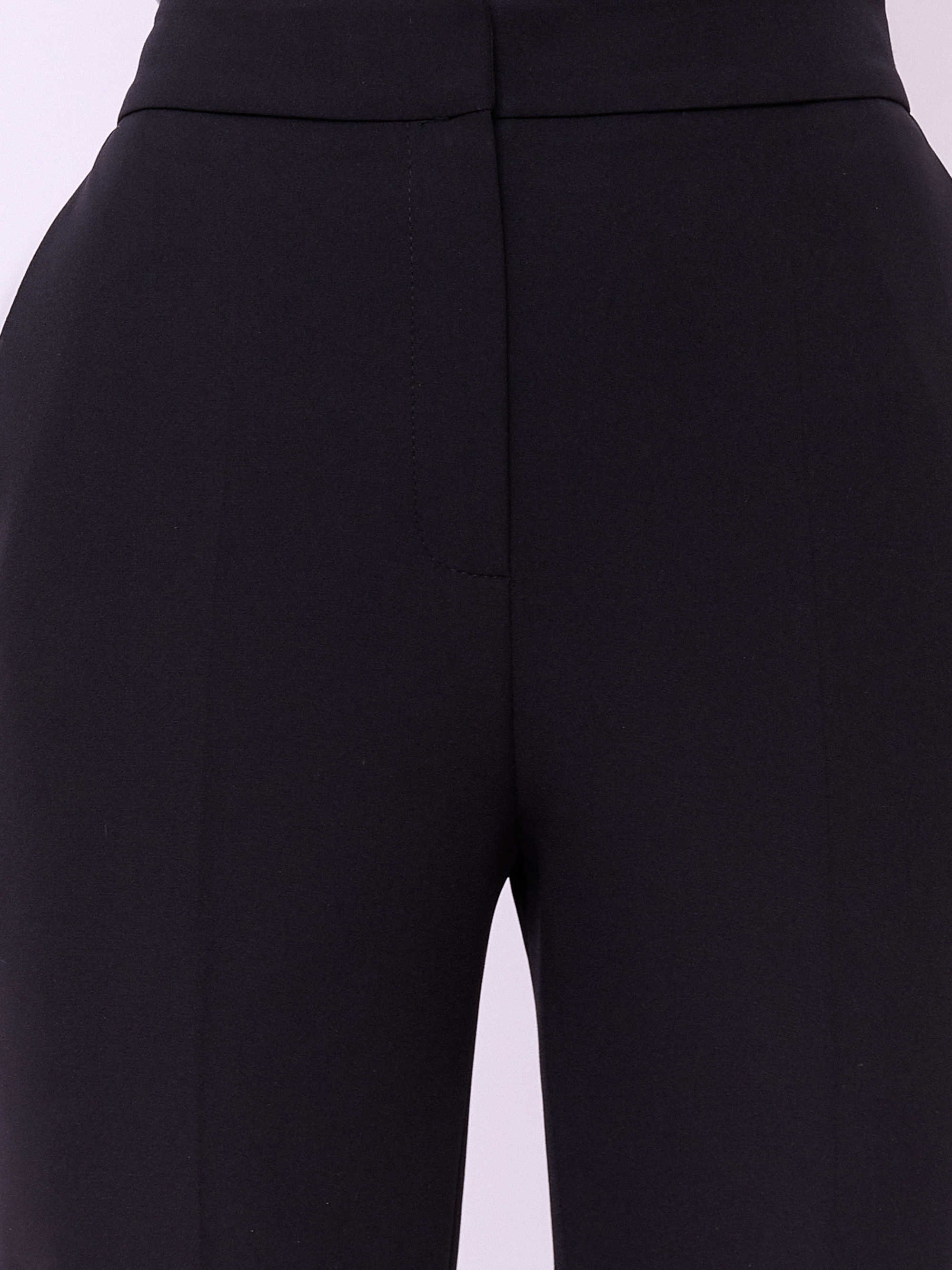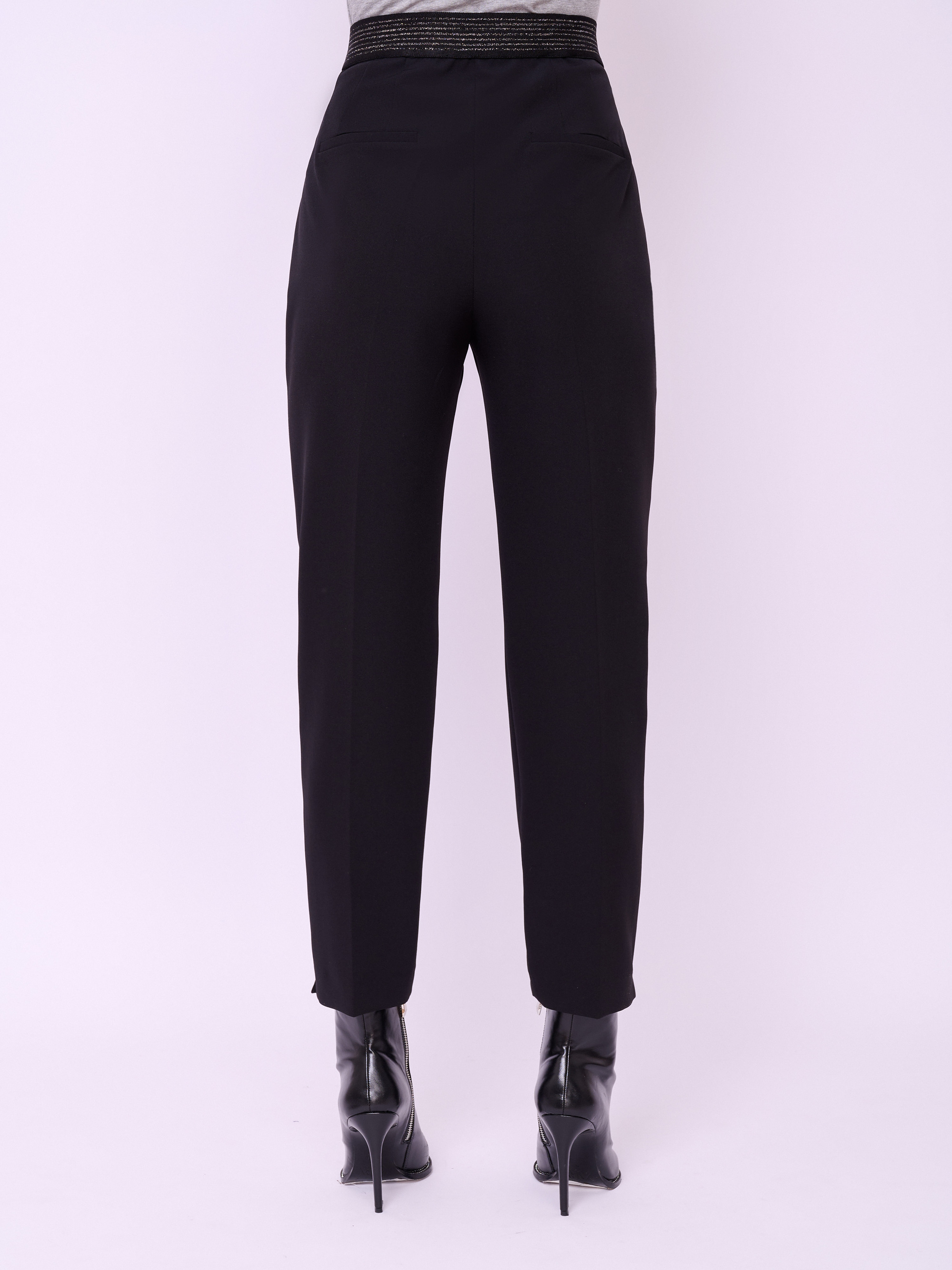 Брюки классические зауженного покроя из текстиля на молнии и резинке с косыми карманами, стрелками и небольшими боковыми разрезами по низу брючин. Длина брючин: 70 см.