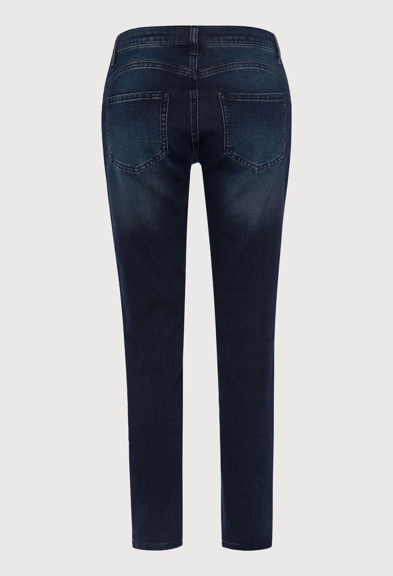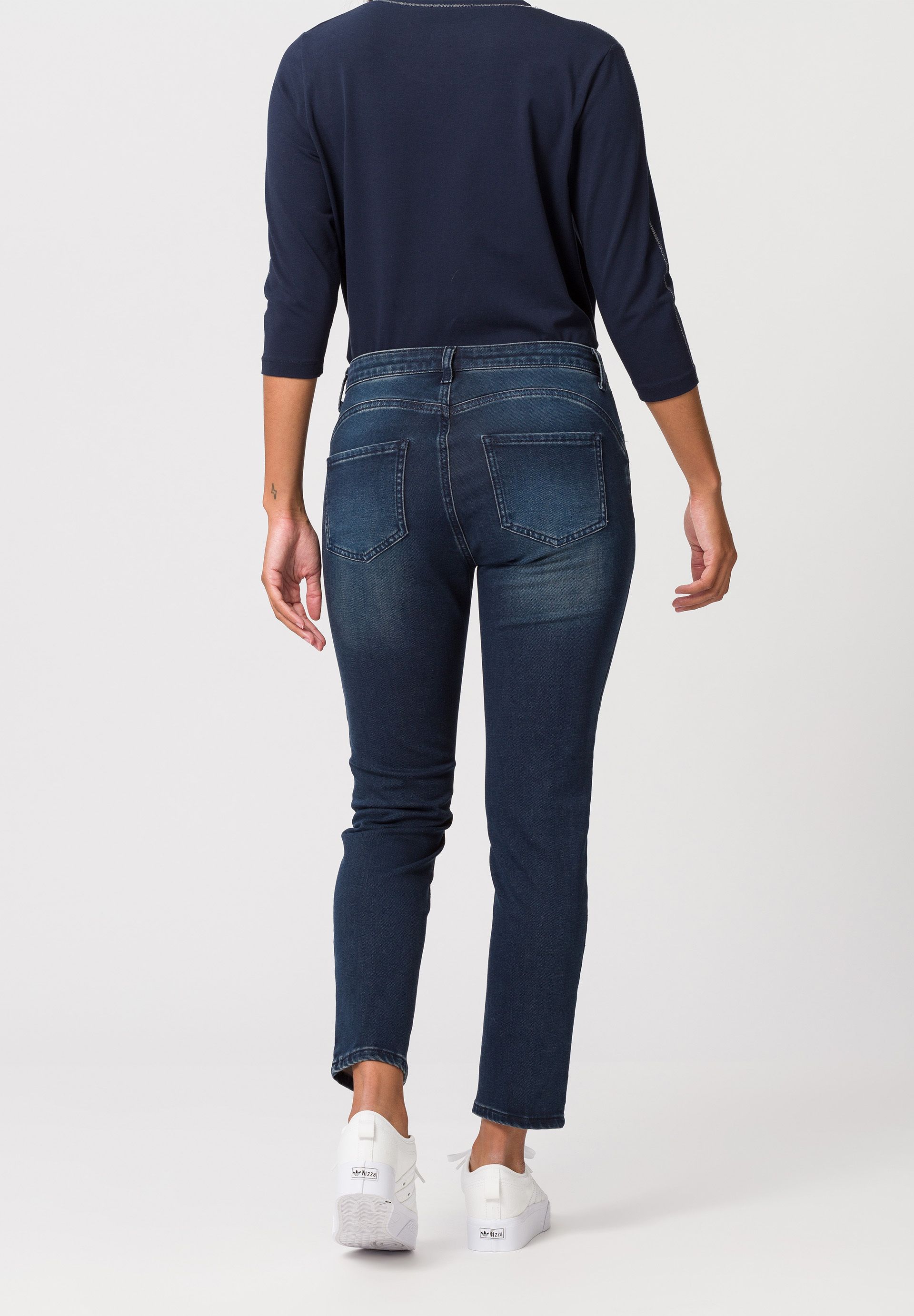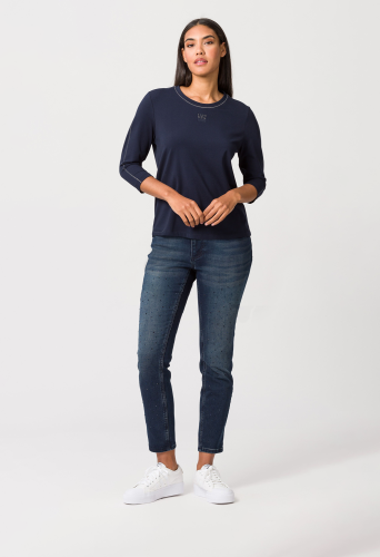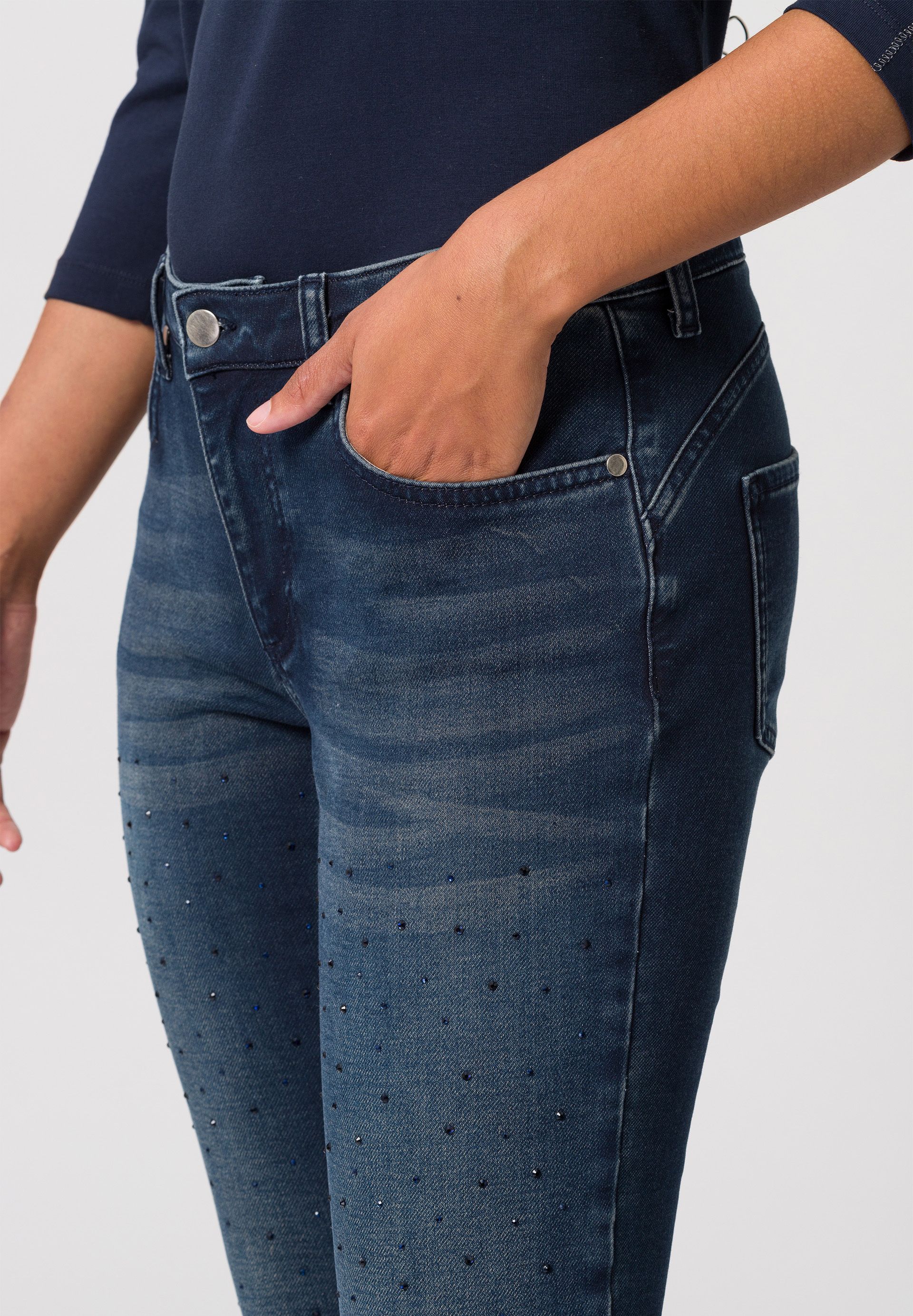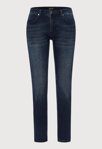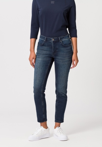Джинсы женские с прорезными карманами спереди и сзади. Джинсы украшены сверкающими стразами и таким образом предстают в небрежно-гламурном свете. Помимо яркого декора спереди, зауженные джинсы имеют аутентичную потертость и заклепки на передних карманах.