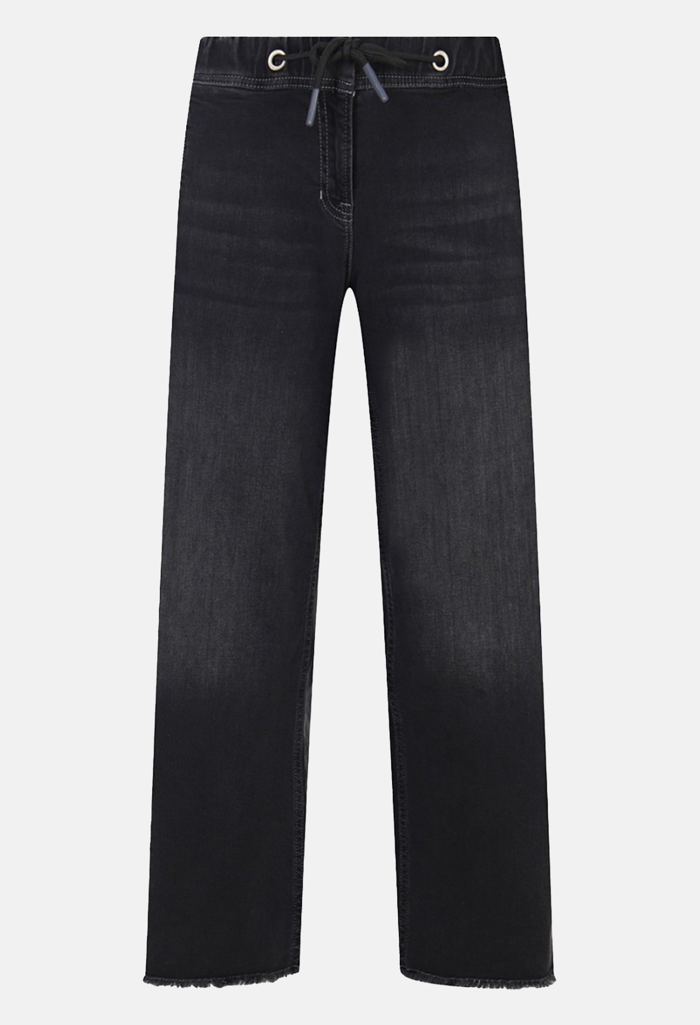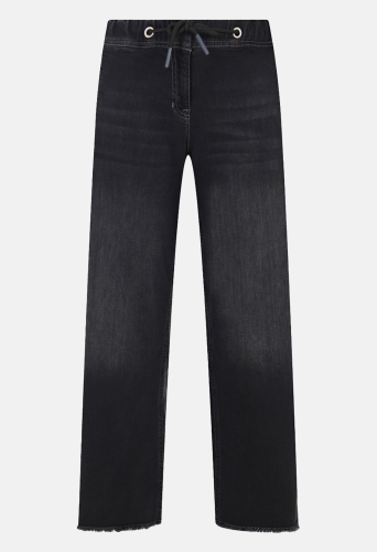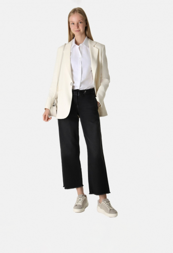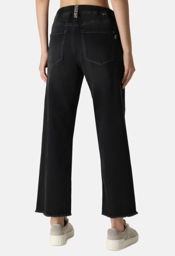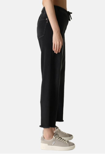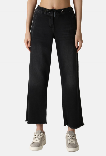 Джинсы формы «Пикси»: заниженная талия, широкие ноги, пояс на резинке и декоративном шнуре. Прорезные карманы спереди, накладные карманы сзади. Металлические пуговицы и заклепки. Бахрома по низу брюк. Внутренняя длина штанины: 72 см.