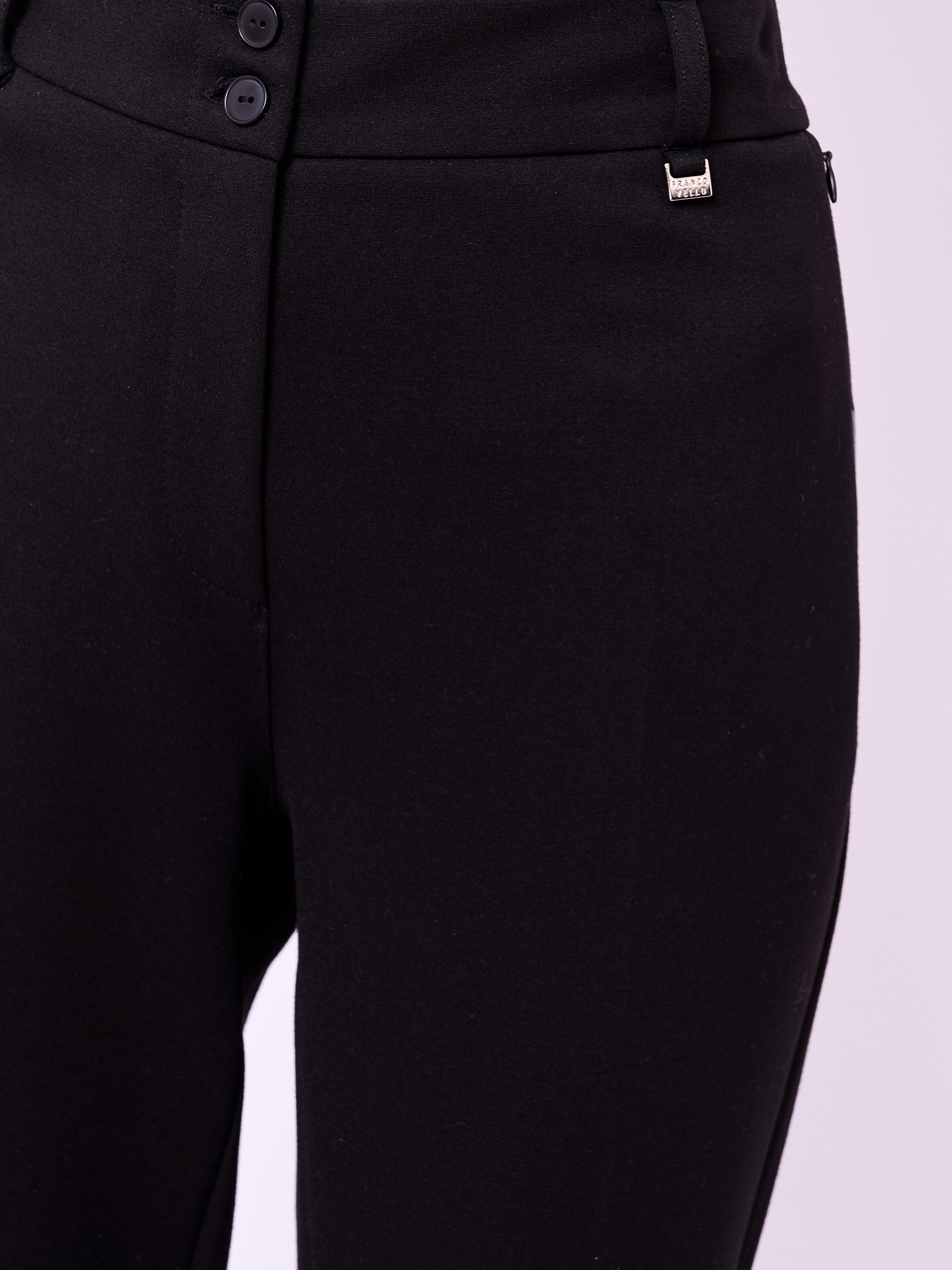 Зауженные брюки из плотного, тяжелого трикотажа на молнии и резинке с прорезными карманами на молнии, стрелками и боковыми разрезами на молнии. Длина брючин: 76 см.