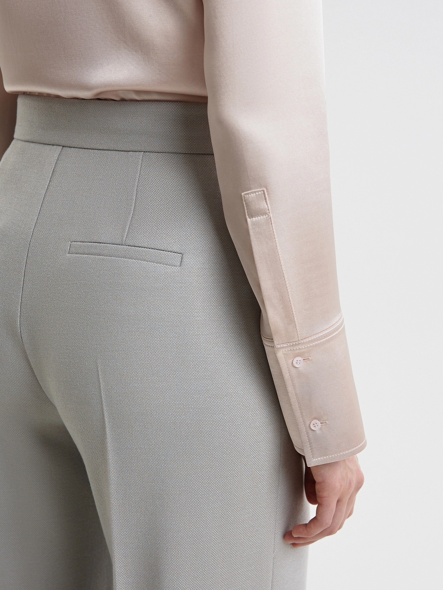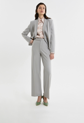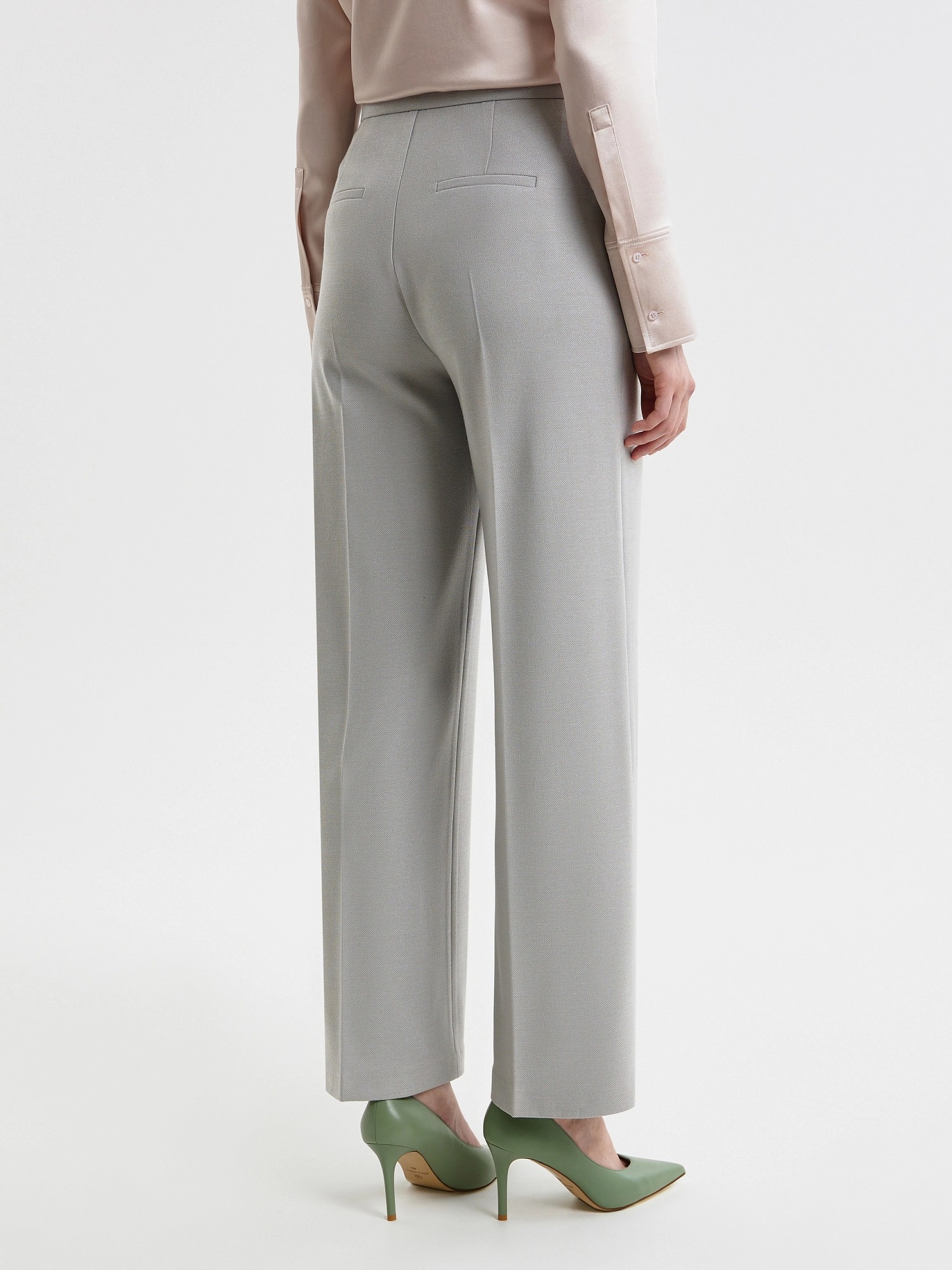 Брюки со стрелками прямого силуэта слегка расклешенные к низу, выполнены из костюмной ткани в бежево-голубом цвете. На притачном поясе, застежка спереди на молнию и крючок. Брюки без карманов.