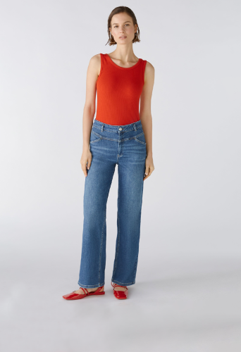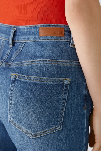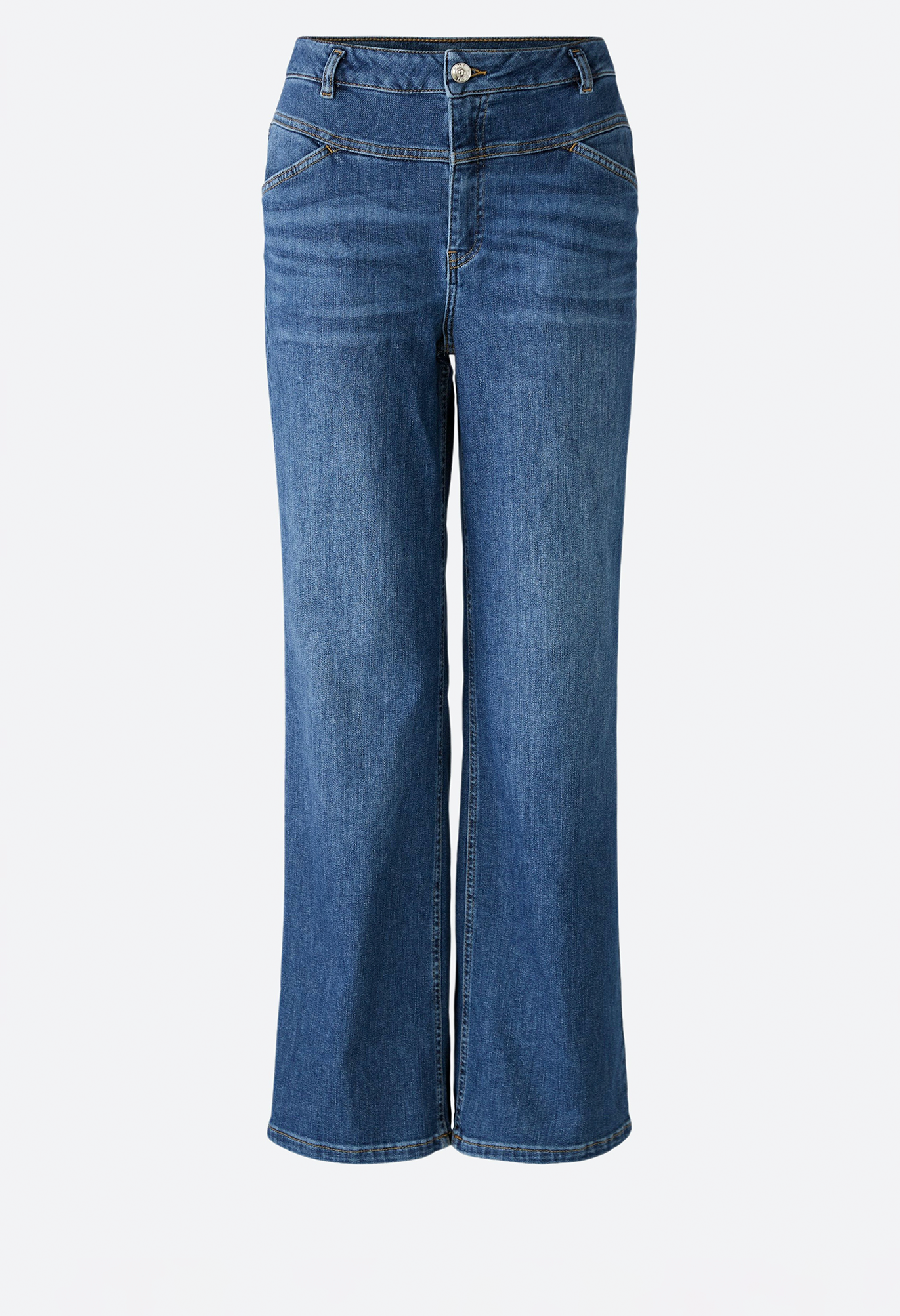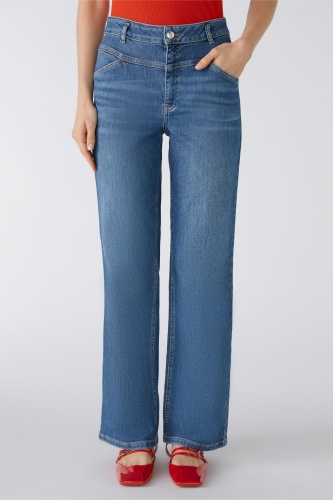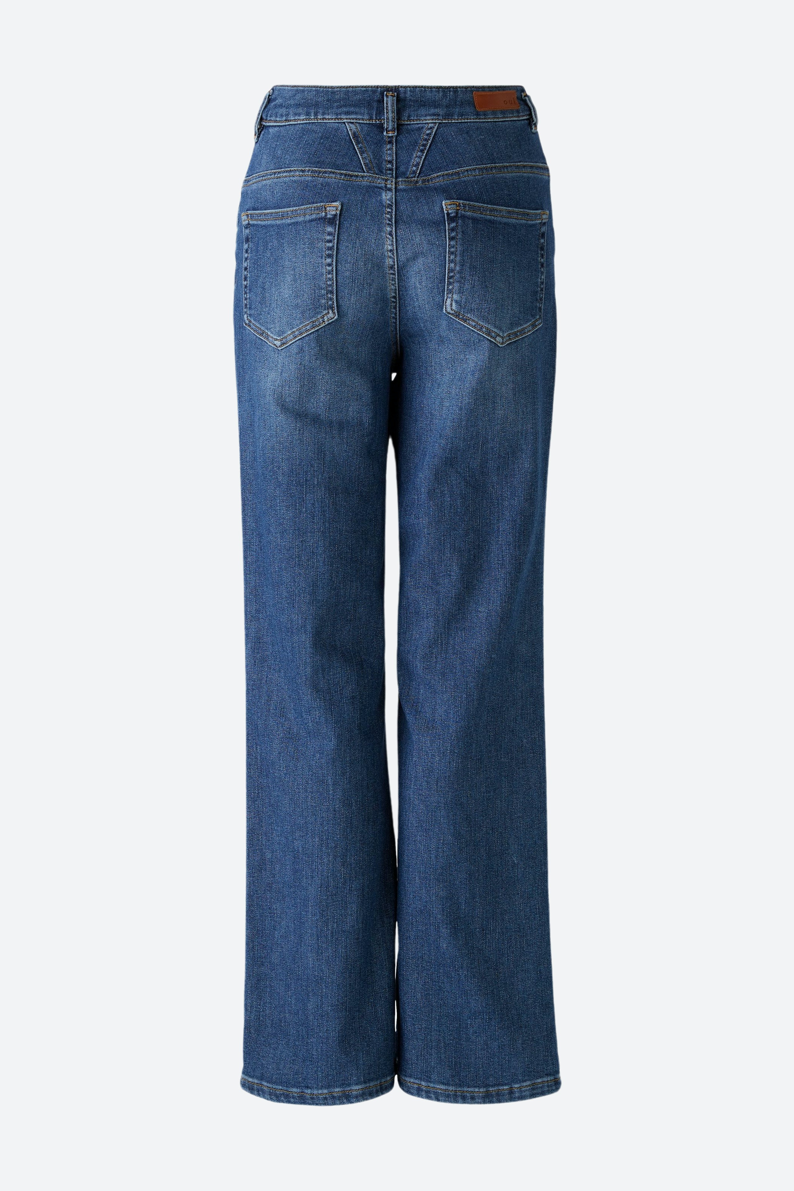 Высокоэластичная смесь хлопка, аутентичная стирка среднего синего цвета. Прямой крой, средняя талия, стандартная длина. С молнией и кнопкой с логотипом. С петлями для ремня. С четырьмя карманами, спереди с вырезом, подчеркивающим фигуру. Ластомультиэстер с превосходными свойствами растяжения и отскока. Длина для размера 42: 80 см.