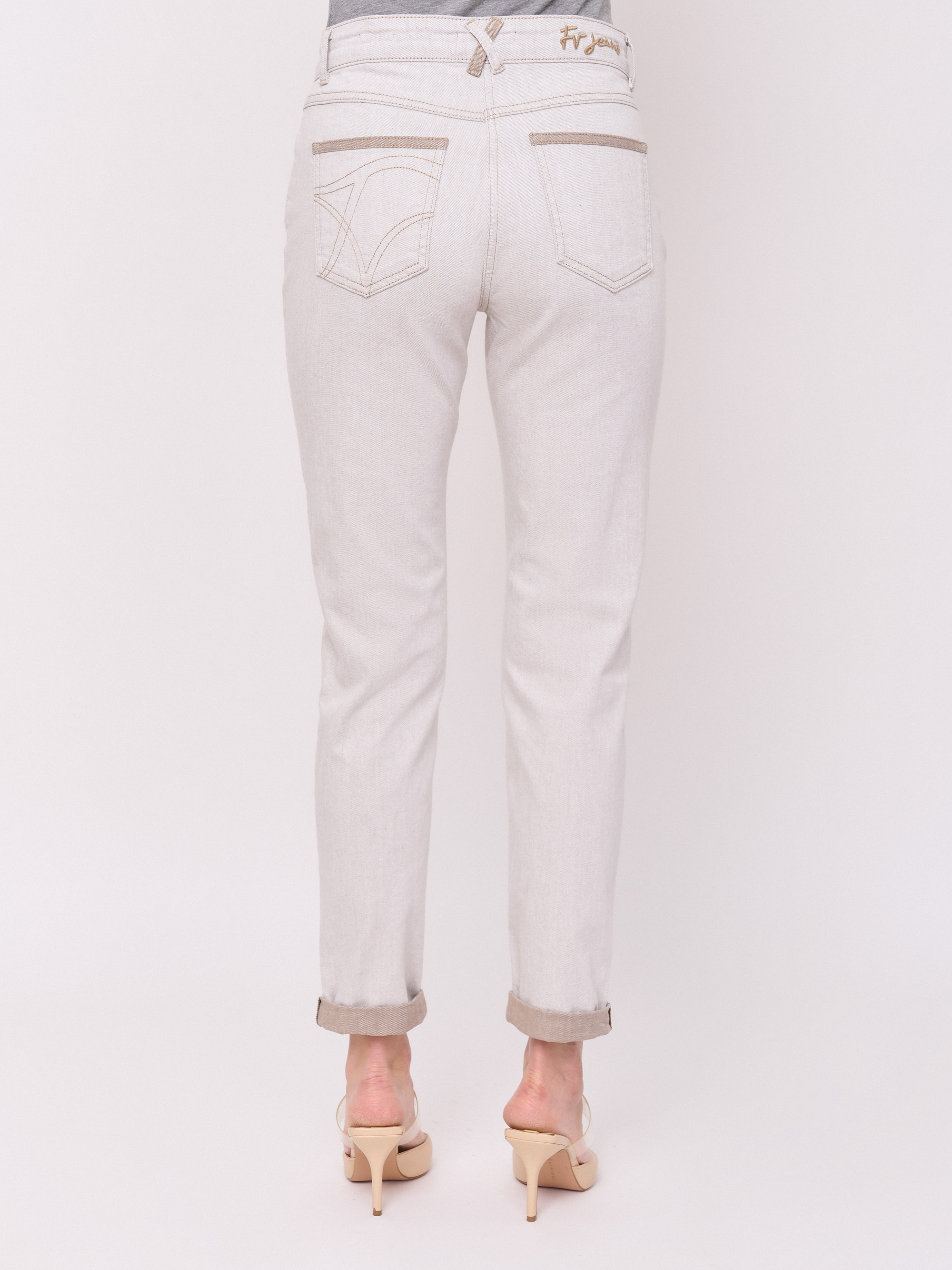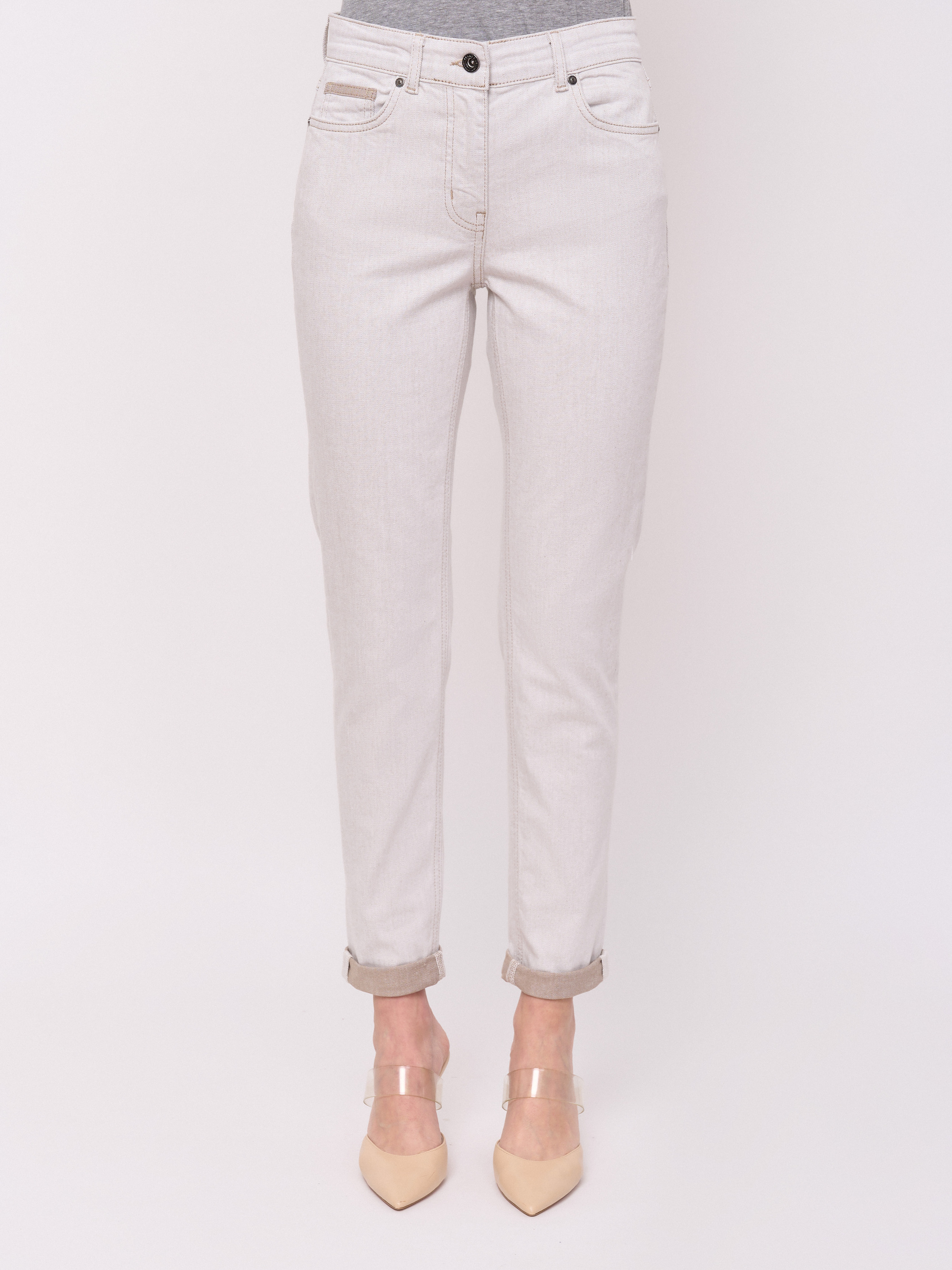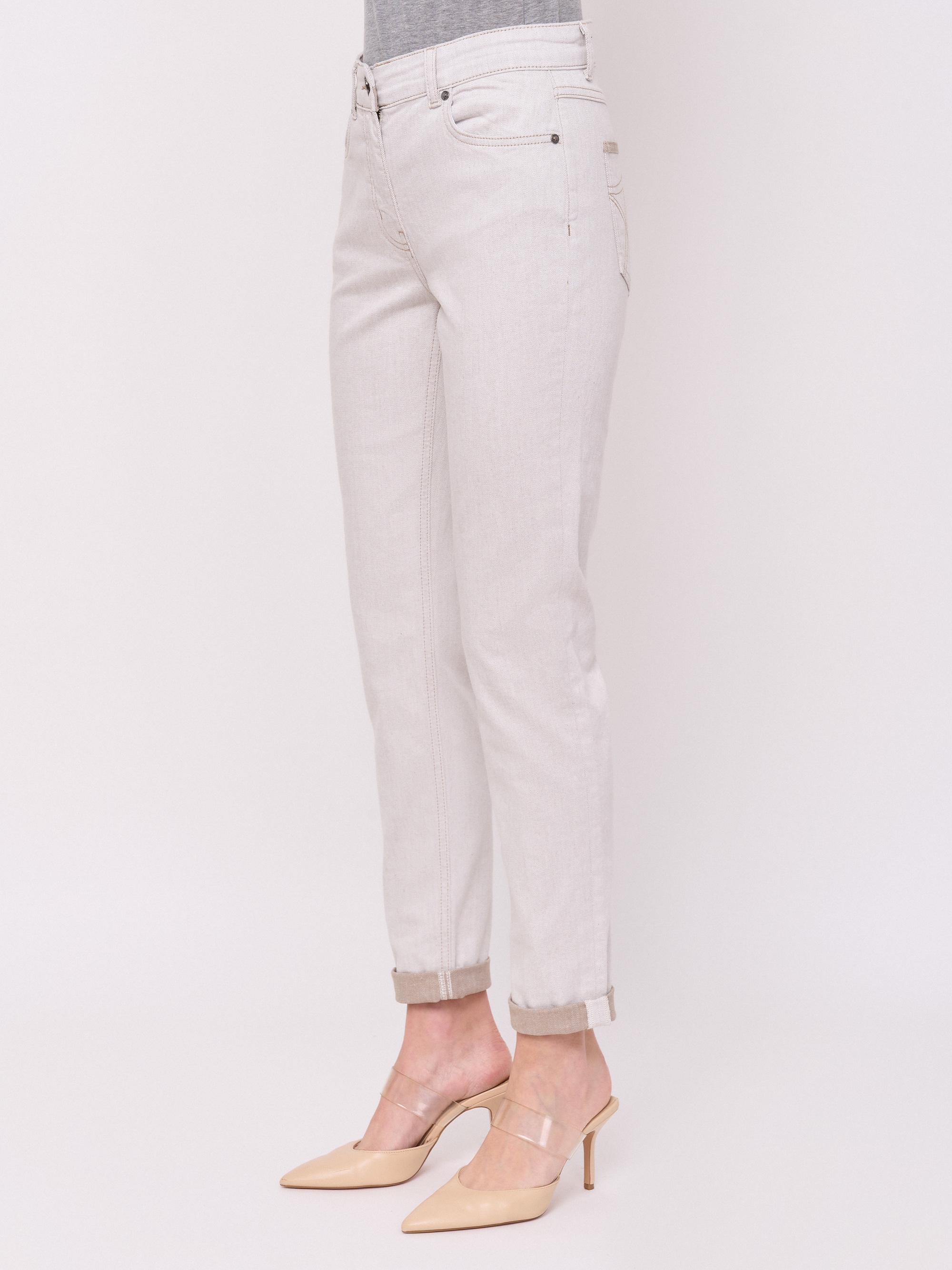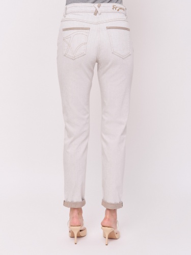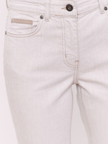 Детали: плотный деним, застежка молния, без рисунка, карманы с отрезным бочком, крой брючин зауженный, посадка средняя. Длина брючин: 78 см.