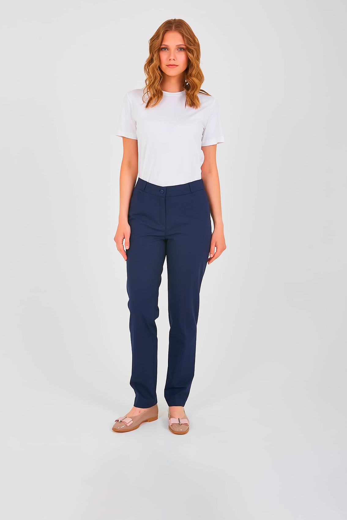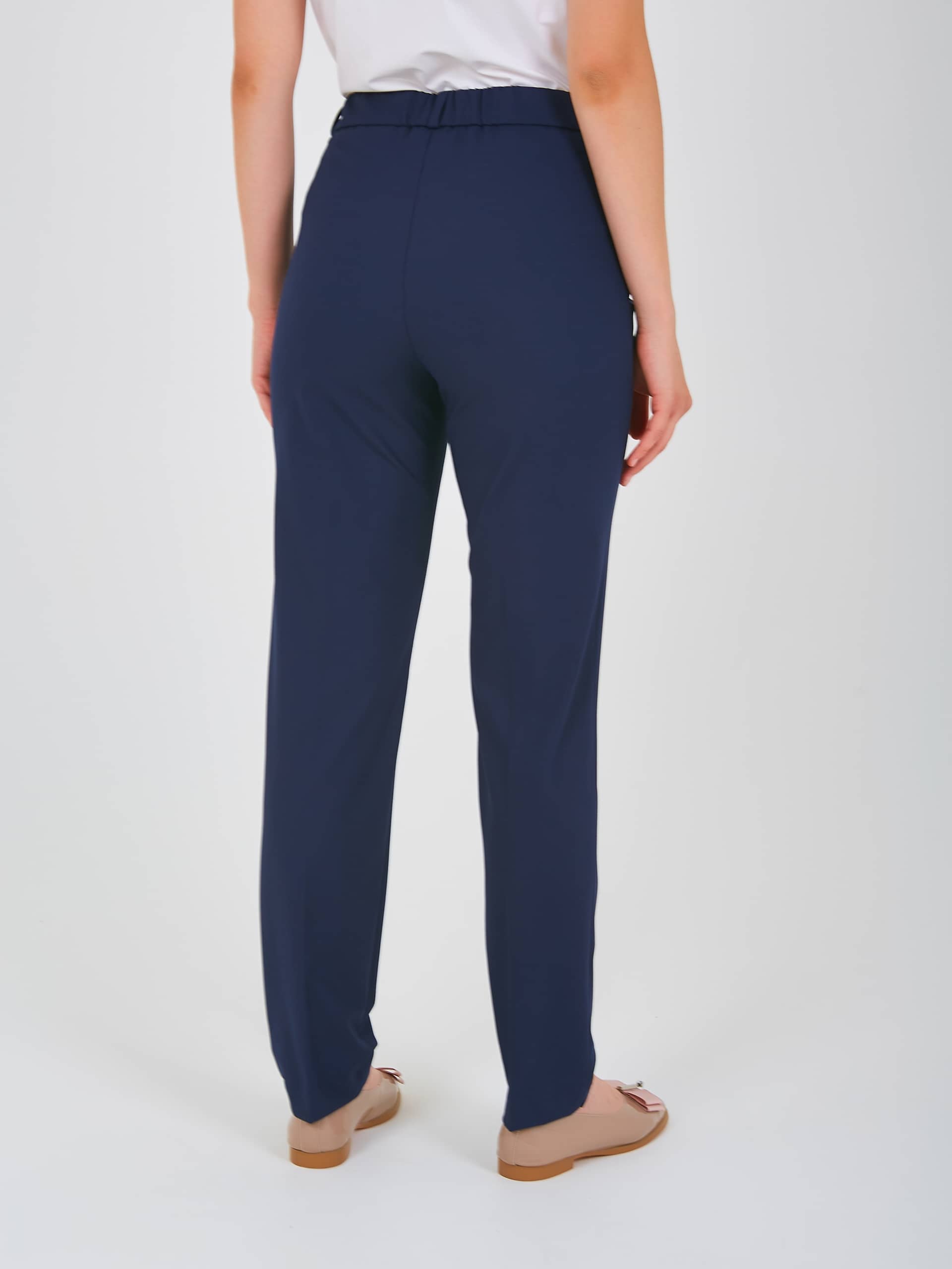 Прямые брюки с завышенной талией, длина 7/8, с застежкой на молнию и 1 пуговицу. Брюки слегка зауженные книзу. На передних половинках расположены два кармана с отрезным бочком. Вверх брюк обработан поясом на резинке со шлевками.