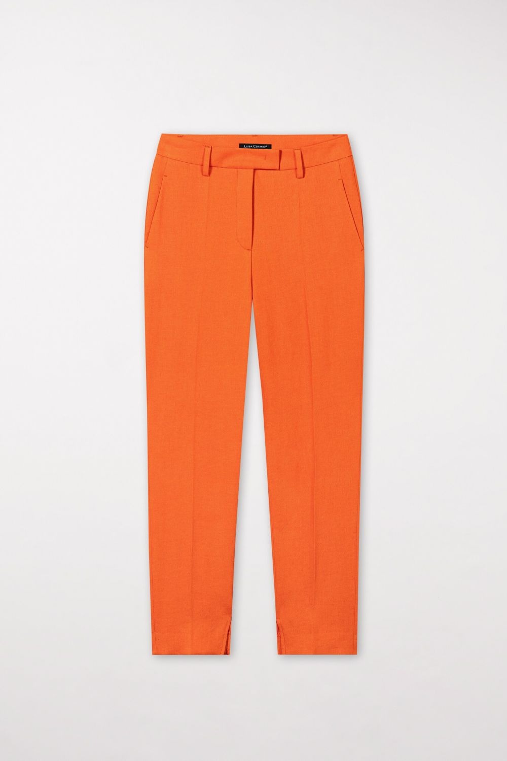 Слегка укороченные брюки из тонкой струящейся смесовой льняной ткани с узкими зауженными брючинами и приглаженными складками. Брюки имеют боковой разрез по низу, два боковых кармана и два декоративных набедренных кармана с клапанами.