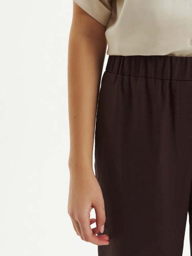 Прямые брюки из льняной ткани в благородном шоколадном цвете на притачном поясе с резинкой и имитацией гульфика. Рабочие карманы в боковых швах и один накладной карман на спинке. Модель идеально подходит для создания ансамбля с жакетом из аналогичной ткани.