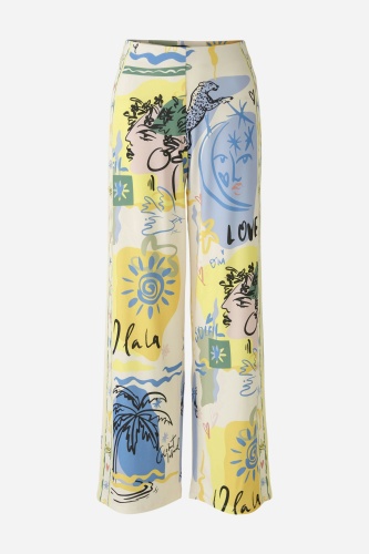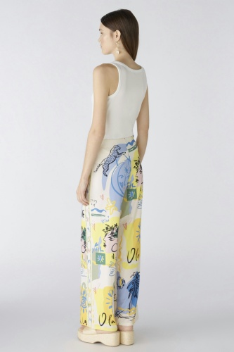 Высокоэластичный материал Silky Touch с принтом по всей поверхности и эластичными полосками по бокам. Повседневный крой с длинными штанинами. Максимальный комфорт благодаря скрытому эластичному поясу. Очень удобный, без застежек, легко надевается. Брюки не мнутся, не требуют глажки. Длина для размера 42: 78 см.