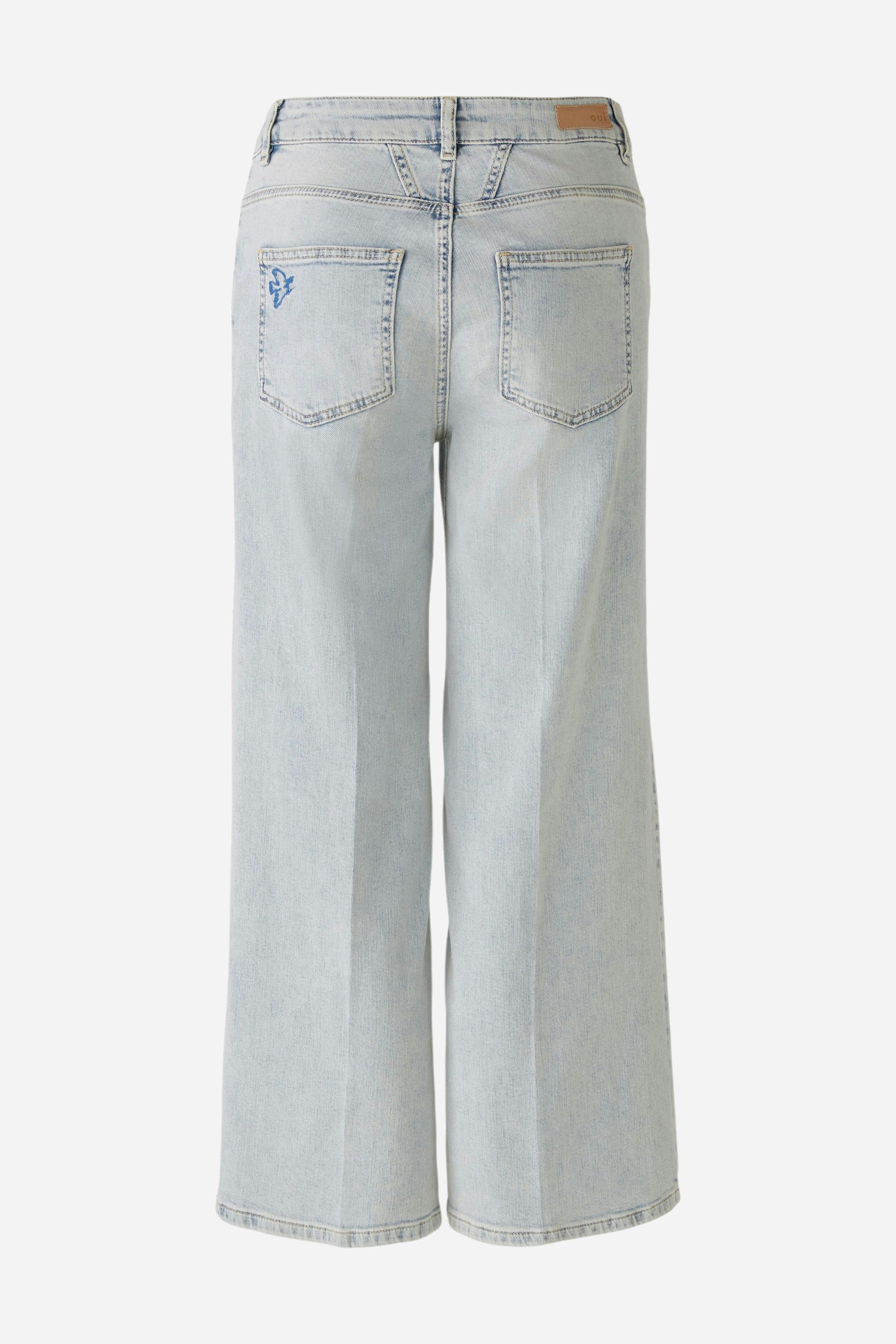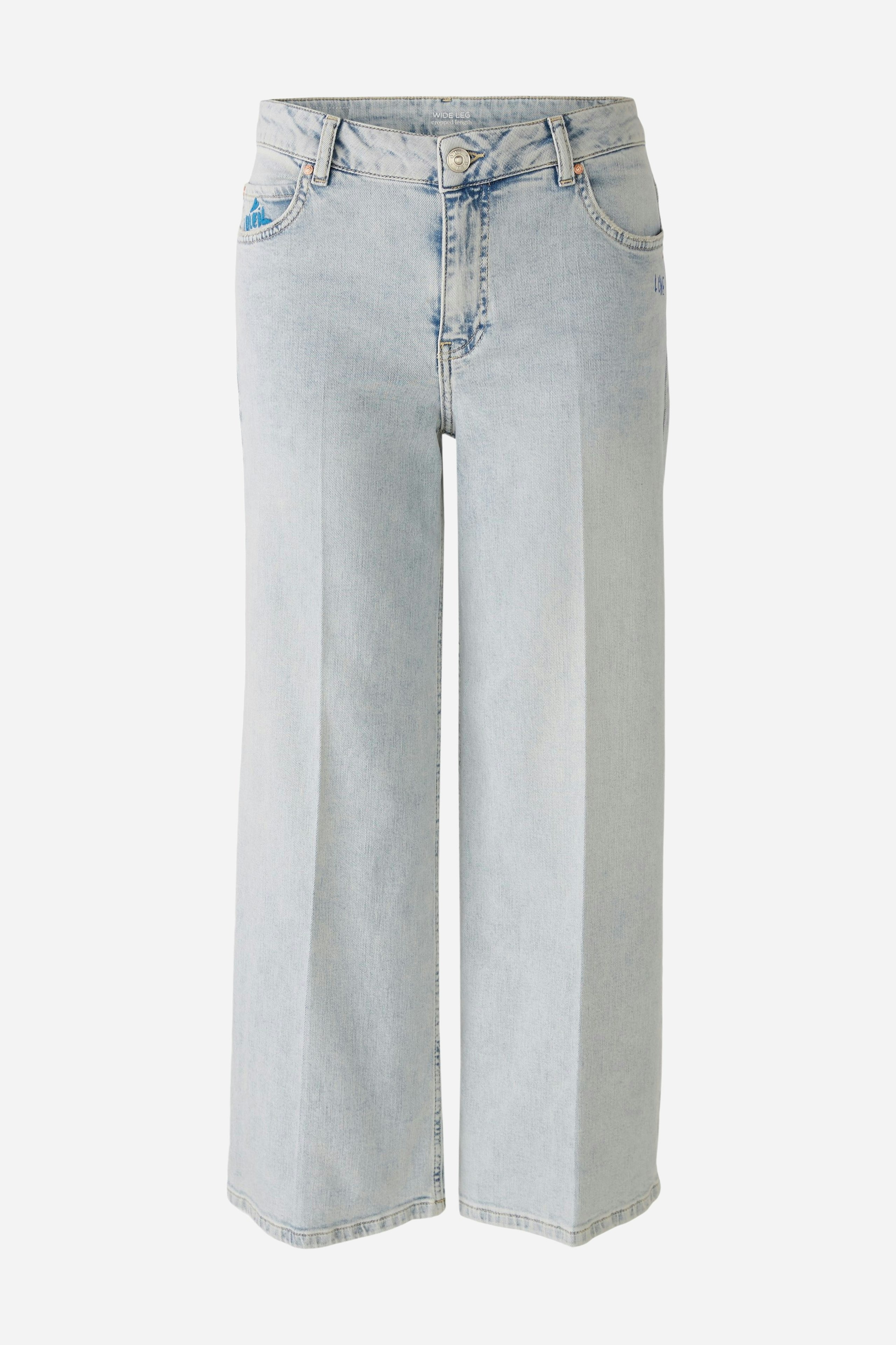 Джинсовые брюки-кюлоты с любовной вышивкой. Эластичный хлопковый деним с вышивкой и принтом. Средняя талия, прямой крой, широкие штанины, укороченная длина. Классический джинсовый пояс с петлями для ремня, пуговицей и молнией. Пять накладных карманов. Со стабильной складкой. Длина для размера 42: 66 см.