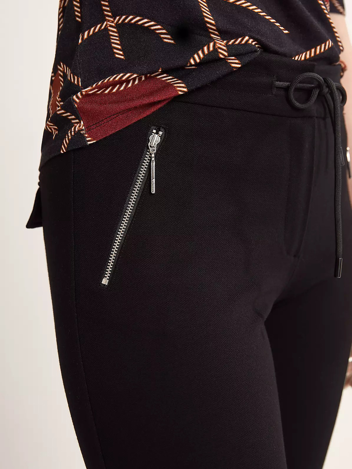 Укороченные однотонные брюки силуэта slim. Комфортная высокая посадка, притачной пояс с кулиской, застежка на скрытую молнию. Боковые косые карманы на молнии.