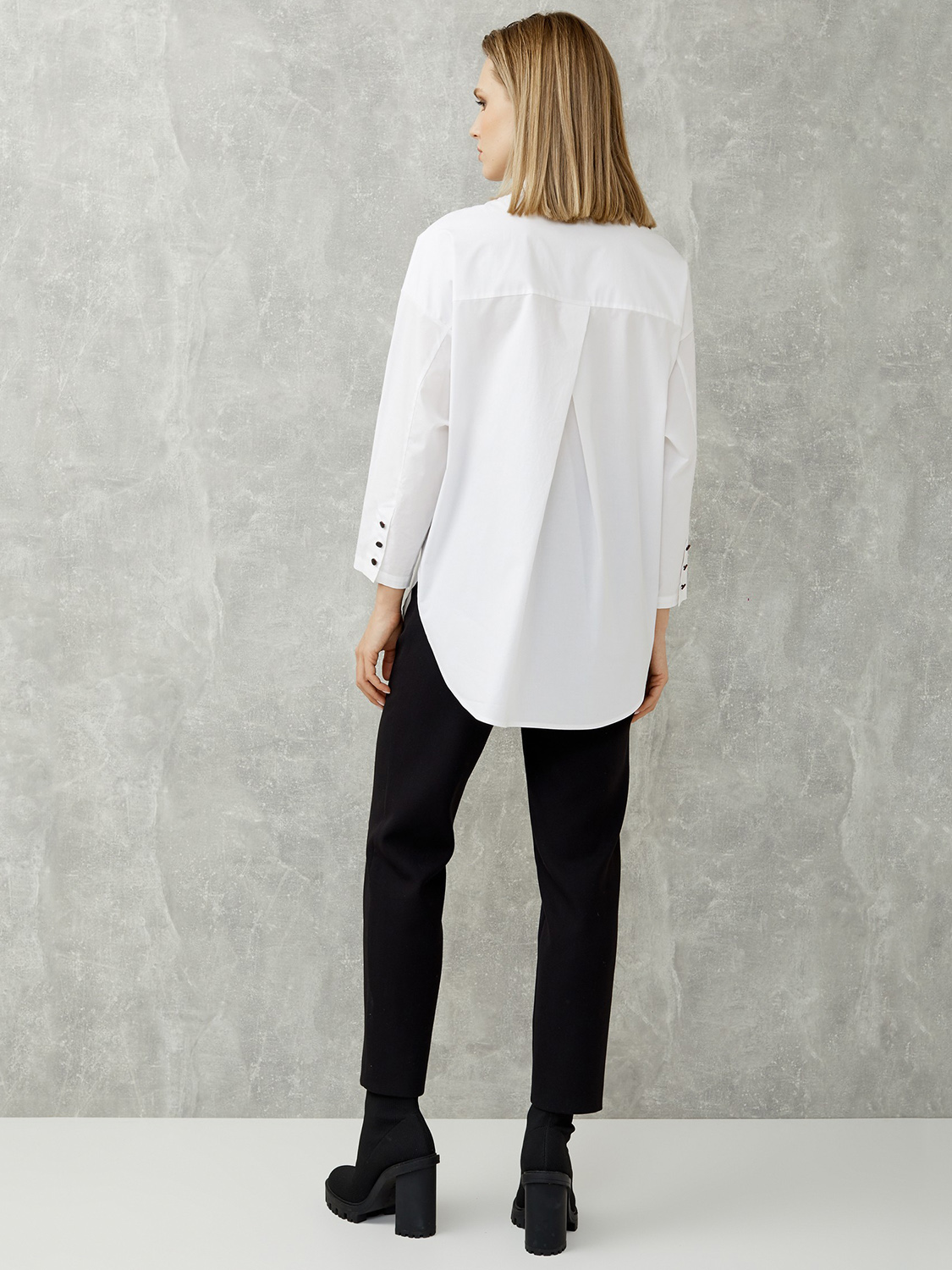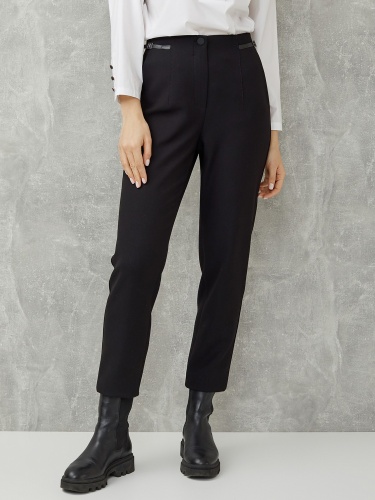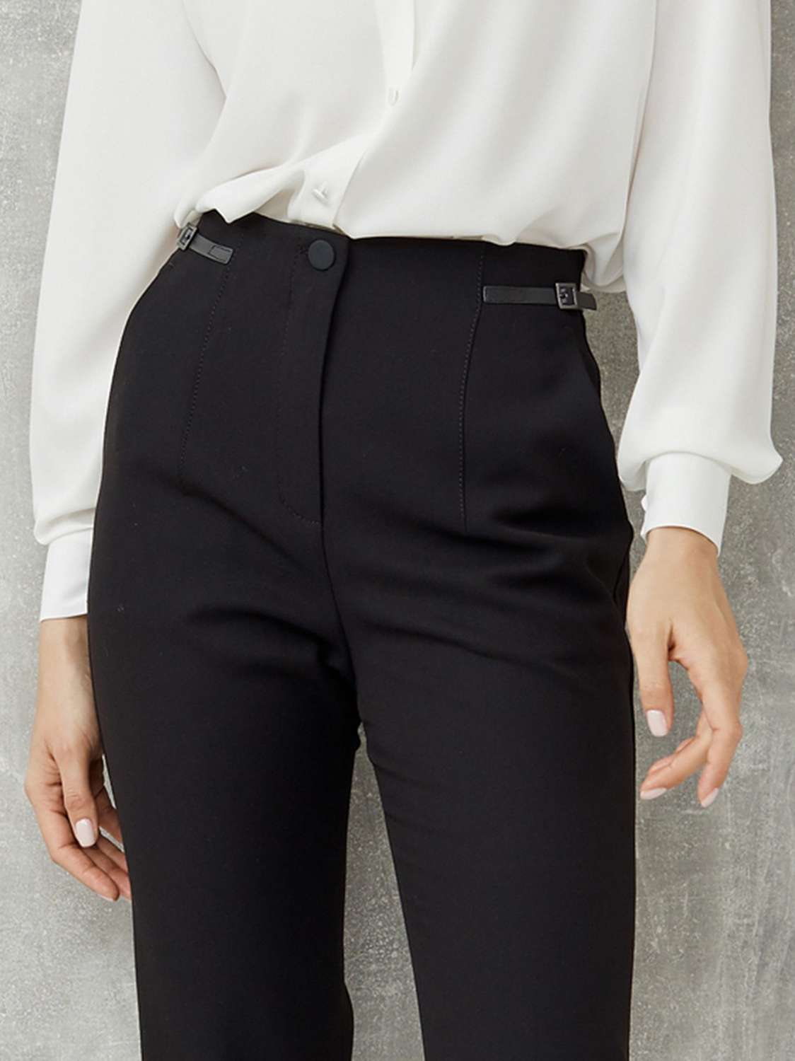 Укороченные однотонные брюки с высокой посадкой. Вариант низа для делового образа. Притачной пояс украшают ремешки из экокожи. Застежка на пуговицу и скрытую молнию.