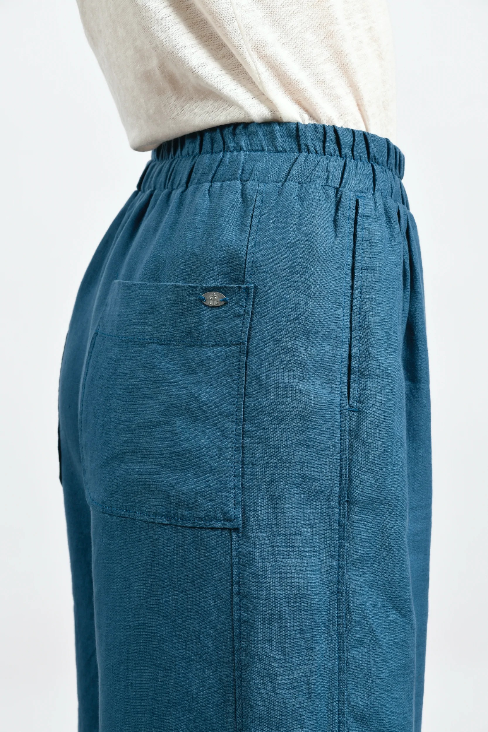На сайте указаны Российские размеры. Льняные брюки широкого кроя с эластичным поясом.2 передних итальянских кармана. 2 накладных кармана с клапаном на пуговице сзади.