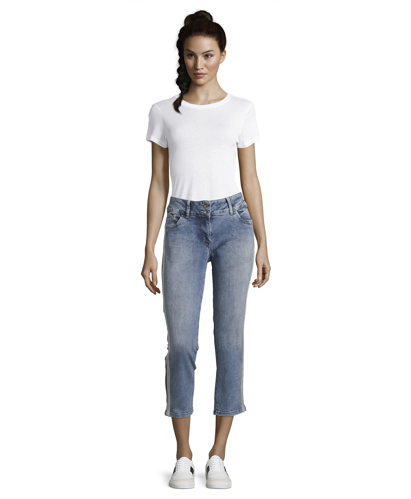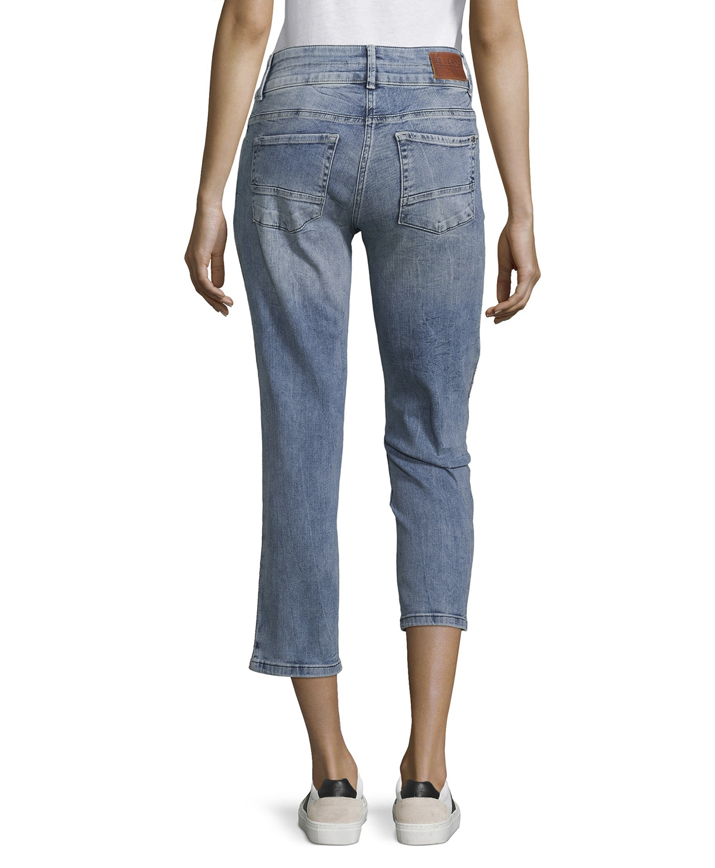 Укороченные потертые джинсы обращают на себя внимание. Универсальная средняя посадка, прямой крой. Длина брюк позволяет подчеркнуть модную обувь. Отделка тесьмой вдоль боковых швов. Материал из хлопковой смеси приятен к телу и обеспечивает комфорт. Эти джинсы - отличный вариант низа для множества образов в стиле кэжуал.