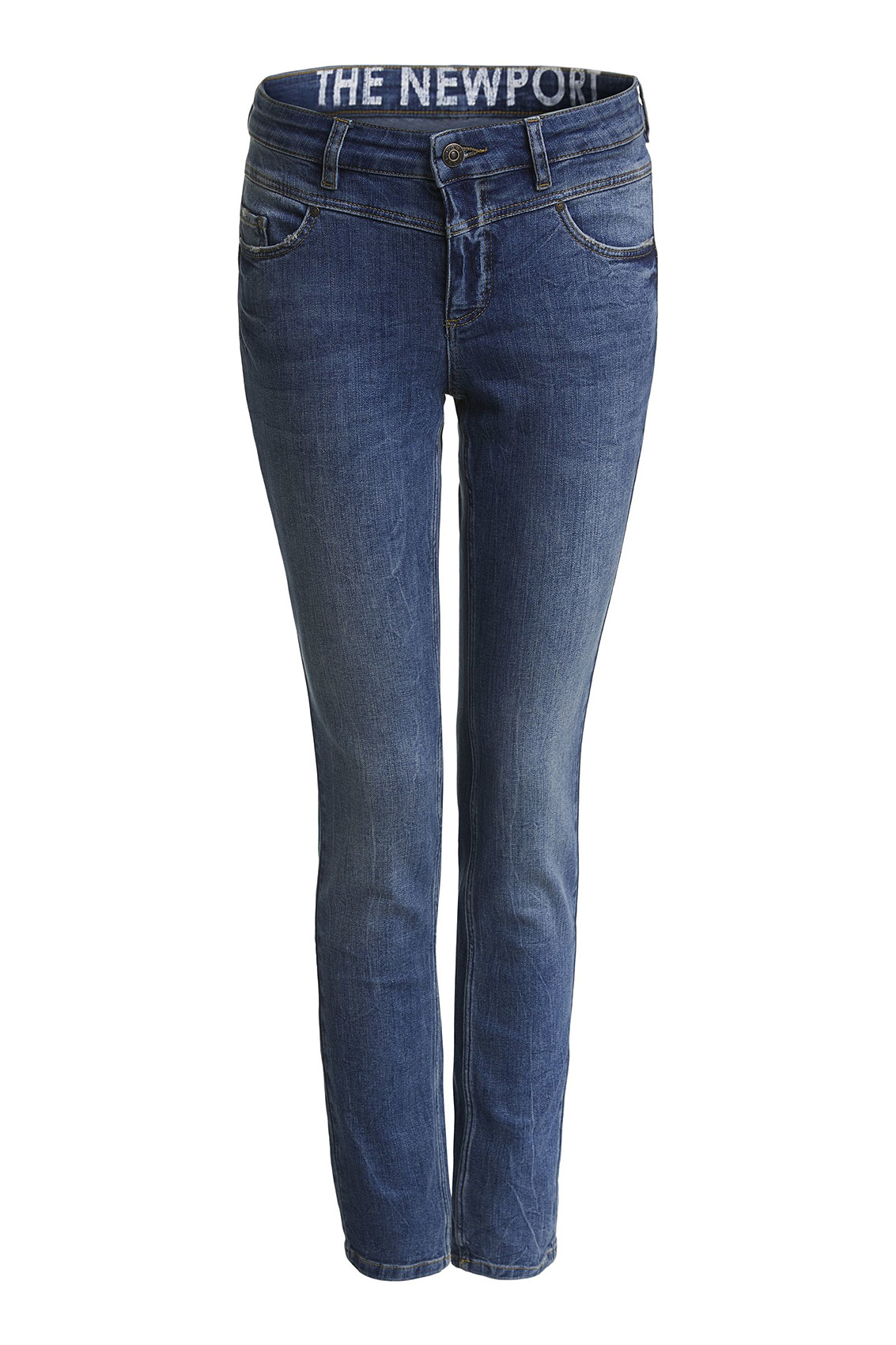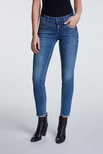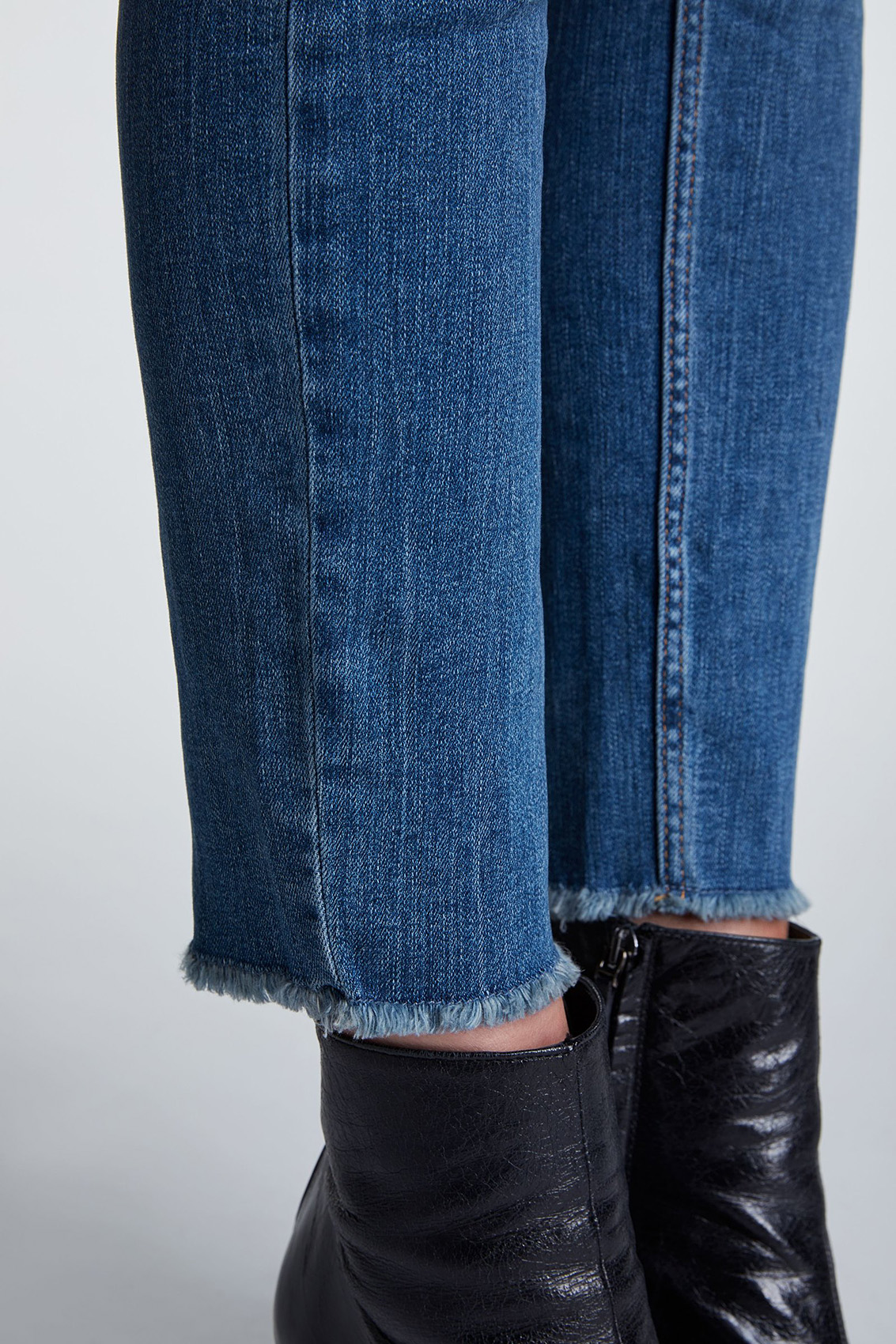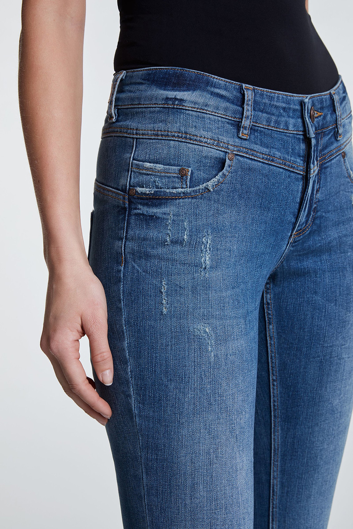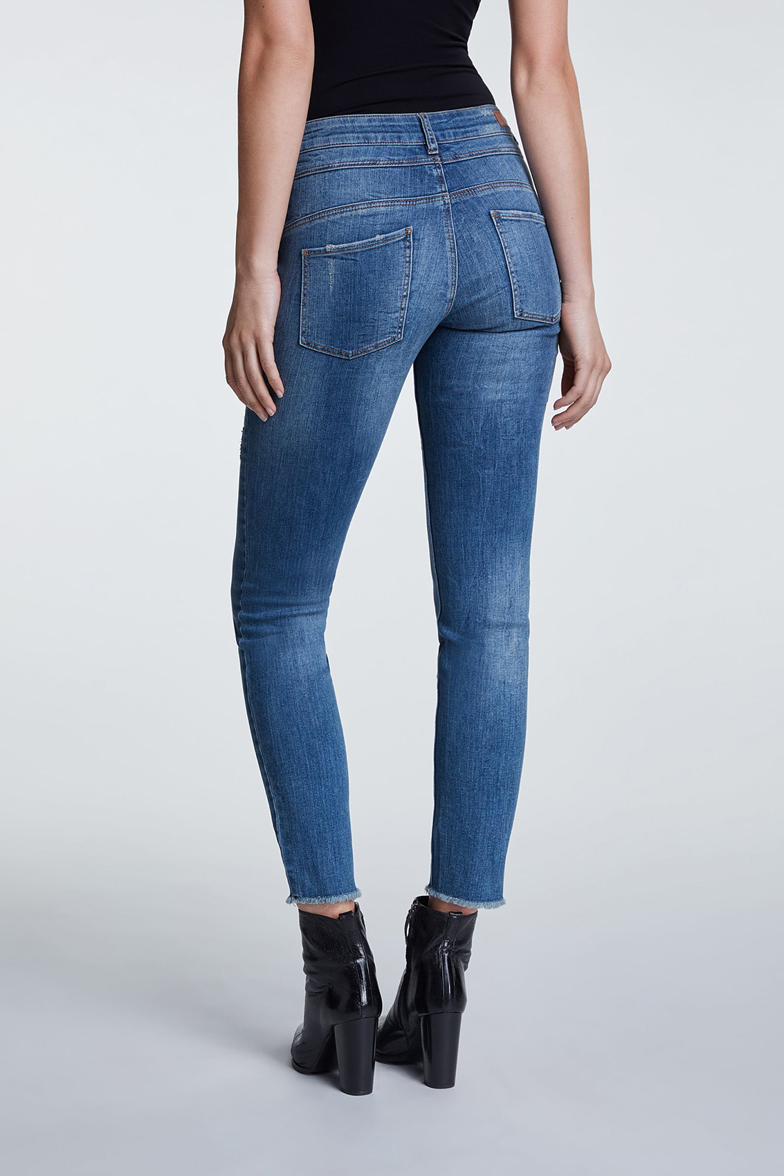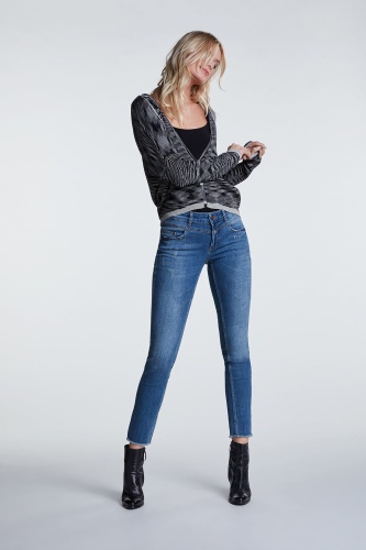 Стильные джинсы с потертостями. Средняя посадка, силуэт slim подчеркивает достоинства фигуры. Укороченная длина позволяет акцентировать внимание на модной обуви. Открытый нижний срез изделия с бахромой. Застежка-молния, карманы.