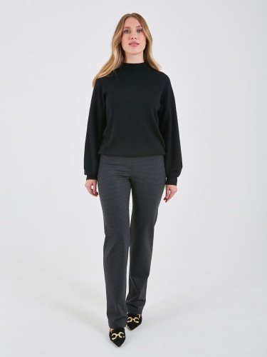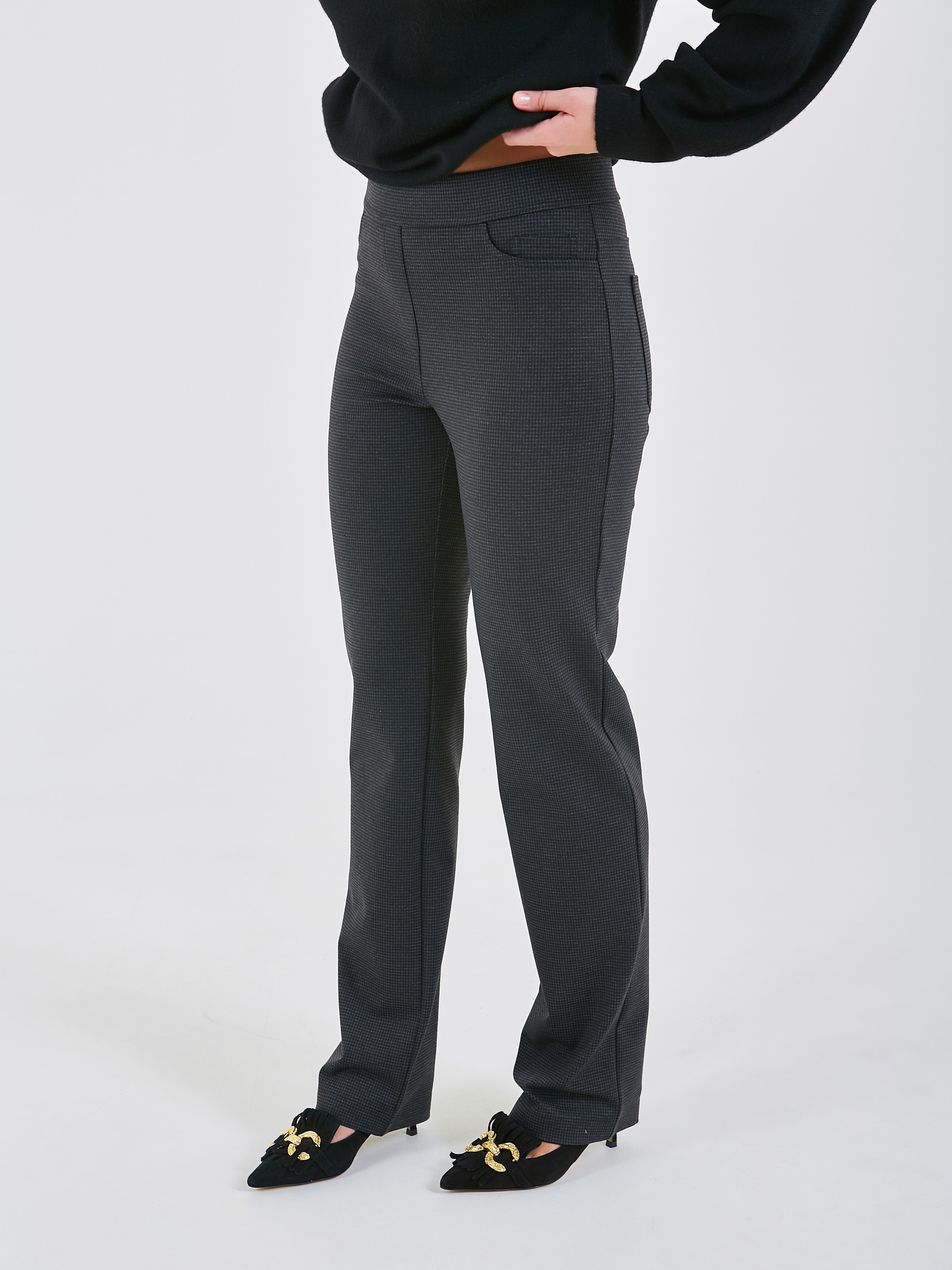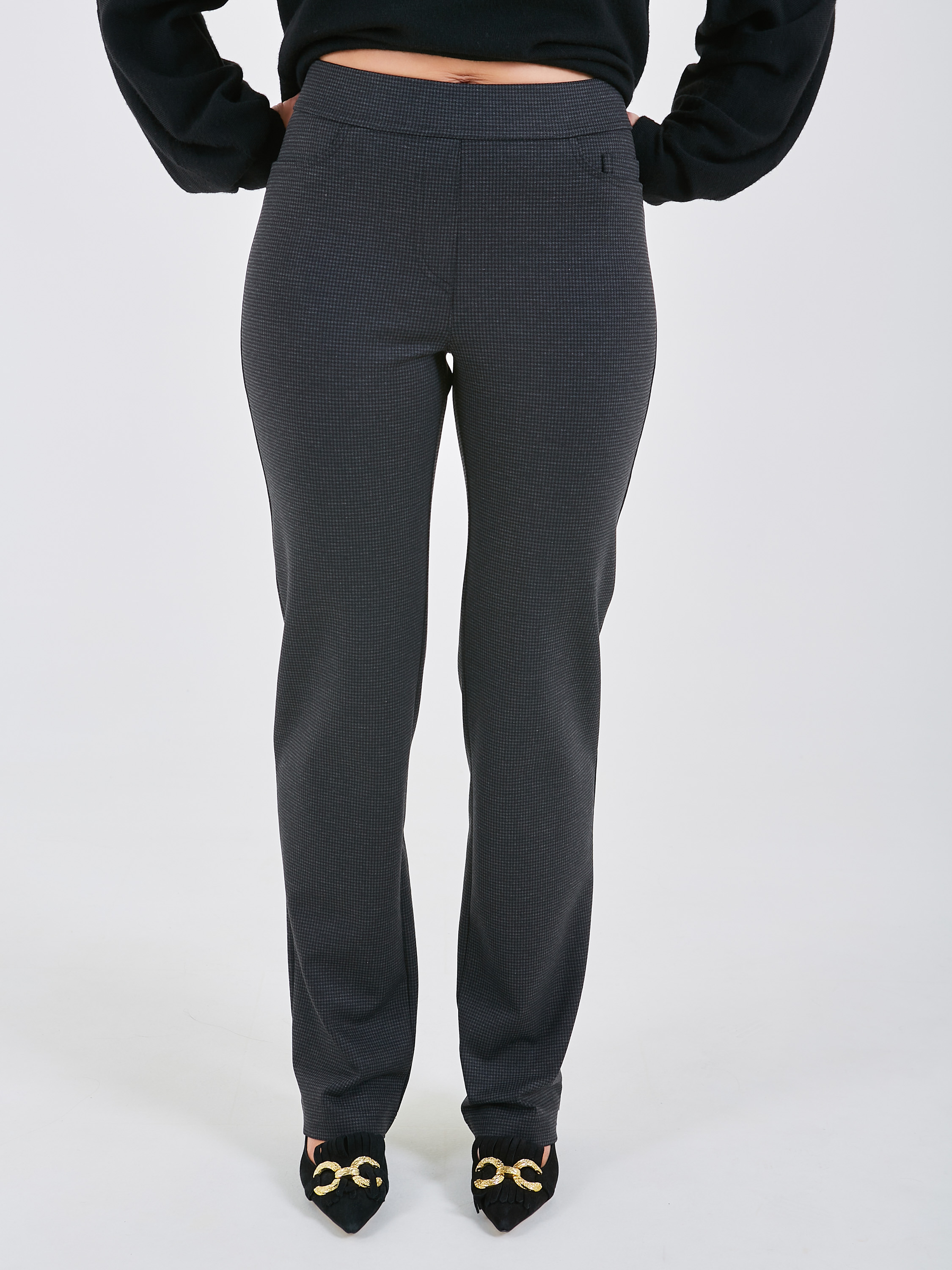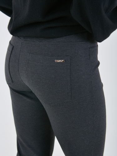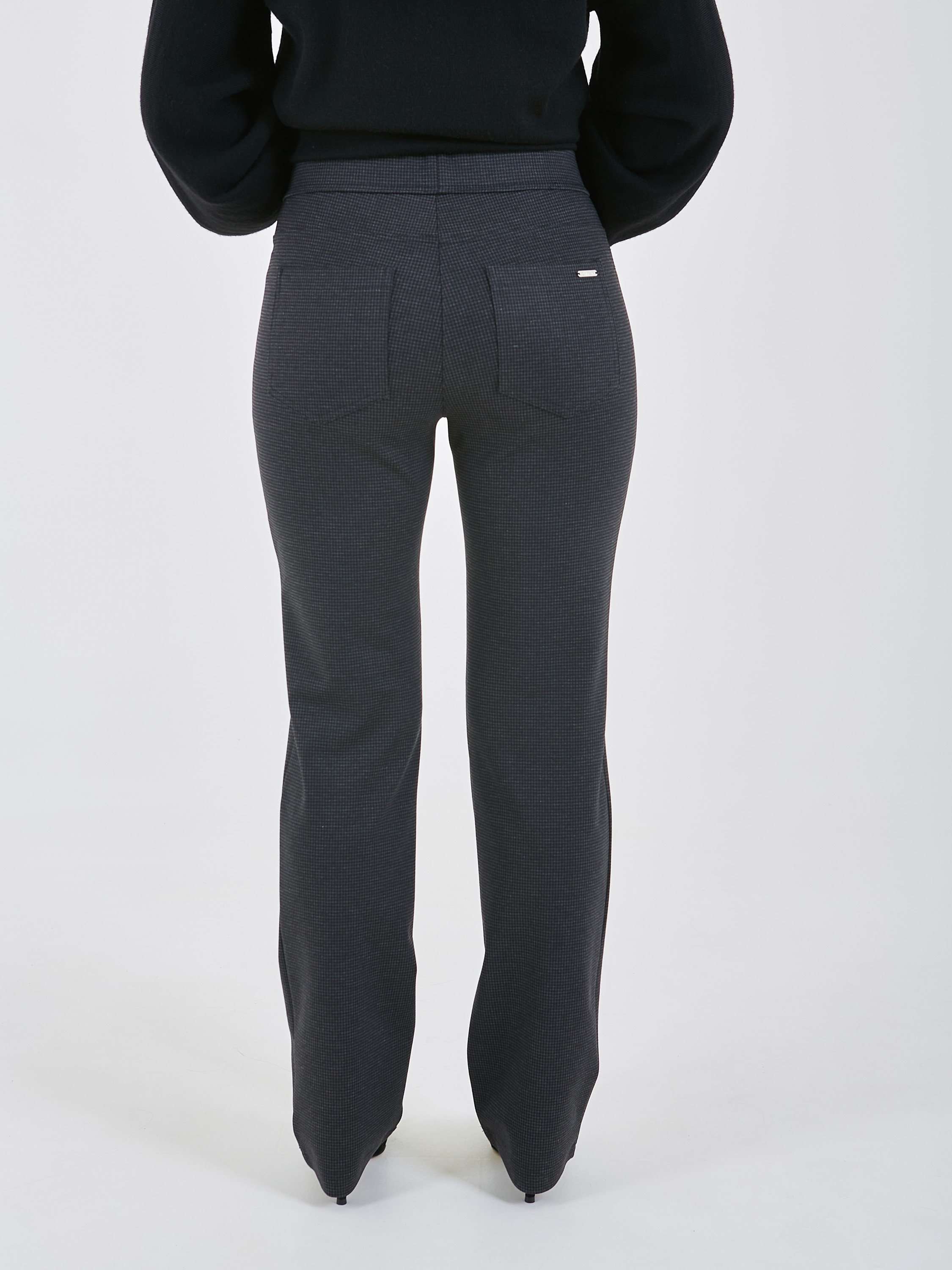 Классические брюки в мелкую клетку немного зауженные к низу. Сзади два накладных кармана.