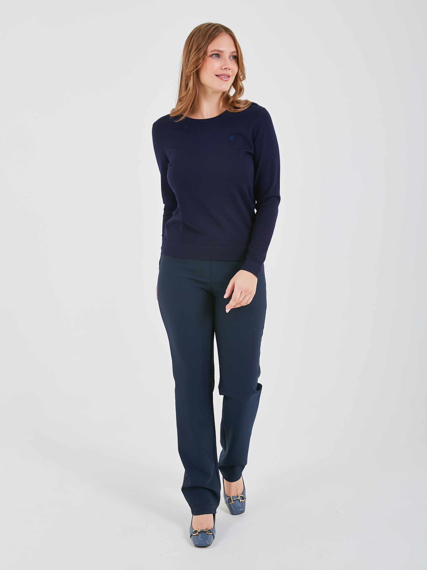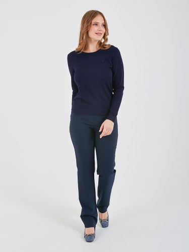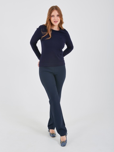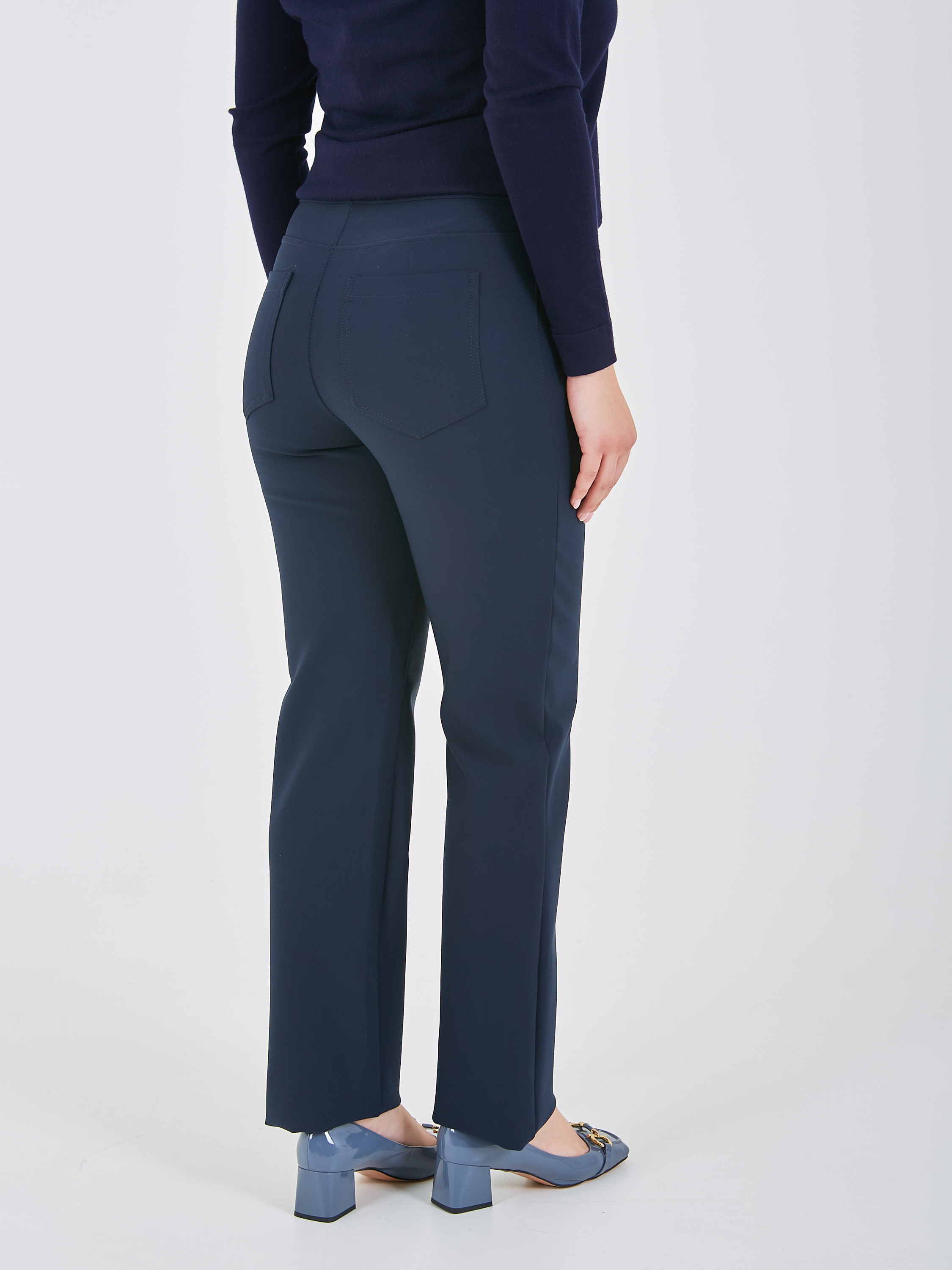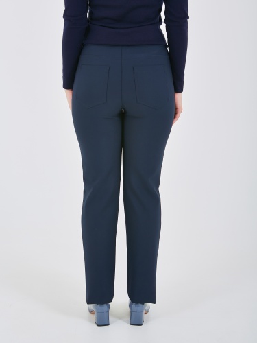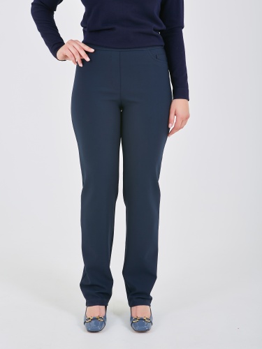 Тёмно-сииние брюки слегка зауженные к низу. Сзади два накладных кармана. Пояс на резинке.