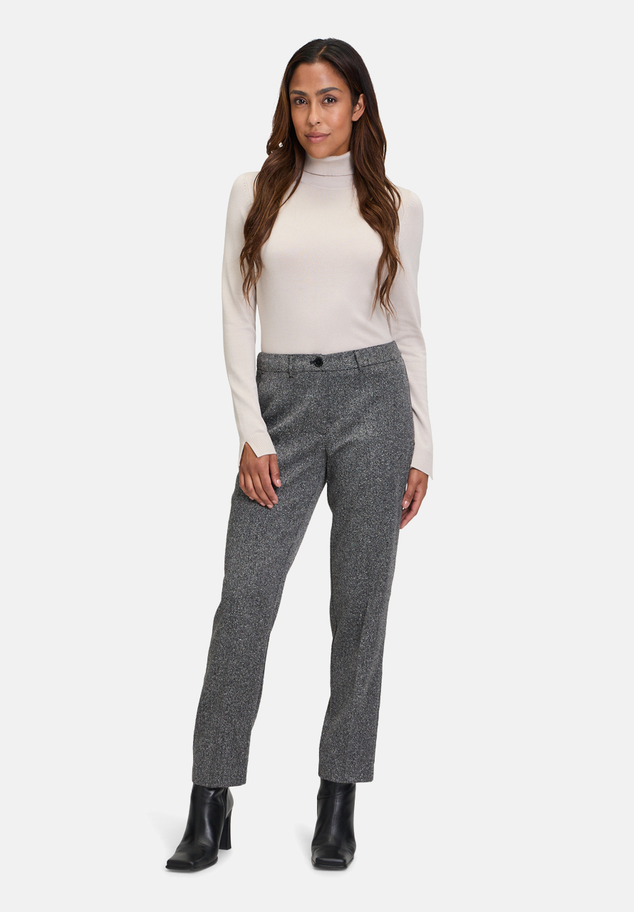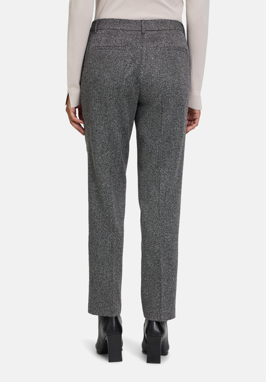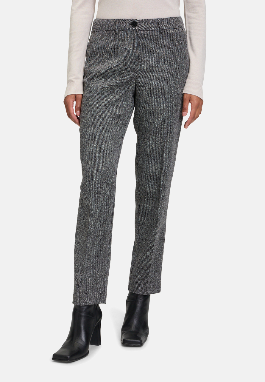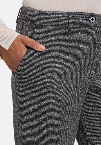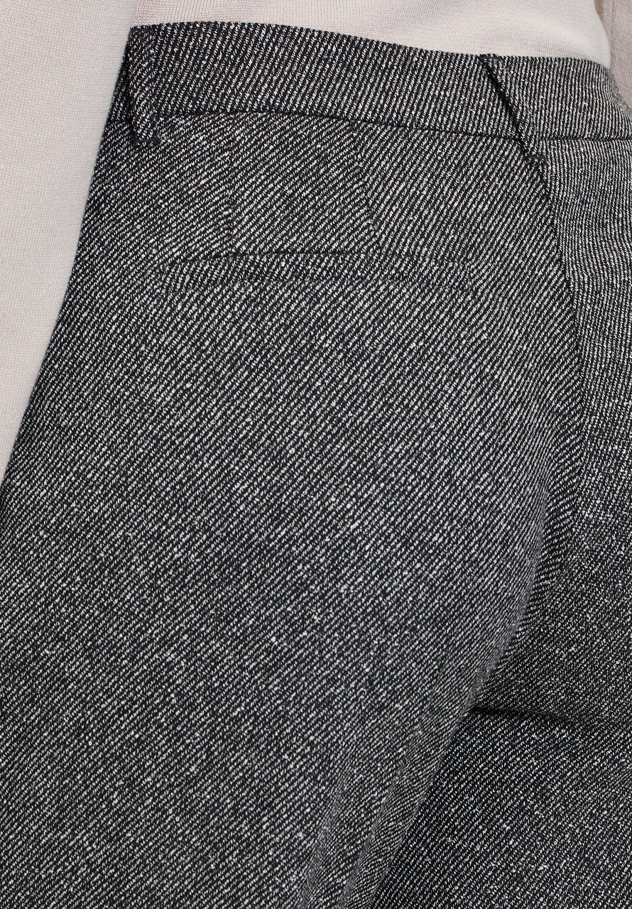 Зауженные брюки бело-черного цвета в мелкий диагональный рисунок. Модель на стандартной застежке, имеются врезные карманы по бокам и сзади. Брюки - незаменимая классика делового образа.