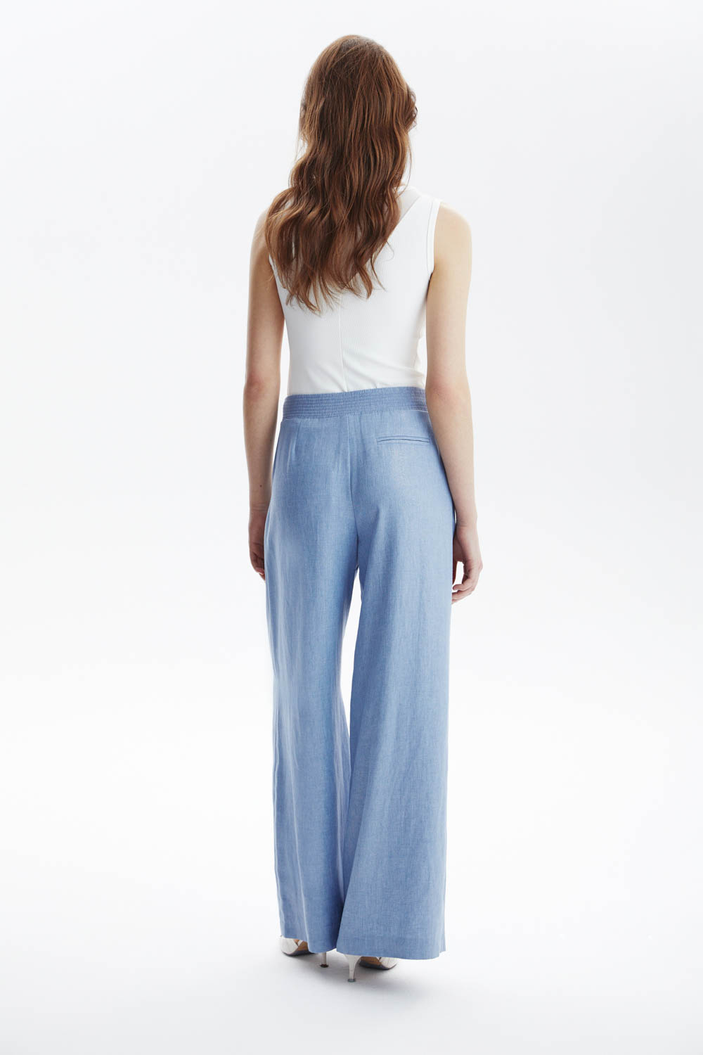 Брюки свободного кроя с широкой ногой. Светло-голубой оттенок брюк освежает образ, а легкая и дышащая ткань идеально подходит для весенне-летнего сезона, обеспечивая комфорт и свободу движения. Брюки идеально подходит как для прогулок по городу, так и для более формальных мероприятий, выражая уверенность и стиль.