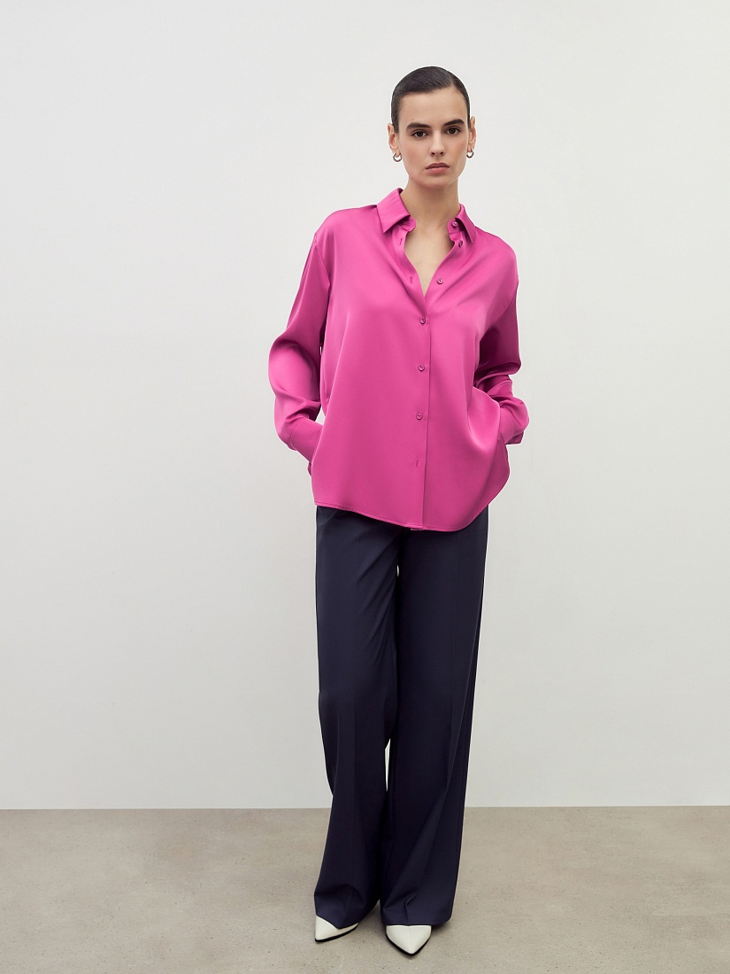 Прямые брюки свободного силуэта из костюмной вискозной ткани в блогородном темно-синем цвете. Имеют два функциональных кармана по бокам и два прорезных кармана сзади. Брюки идеально сочетаются с жакетом из одной ткани.