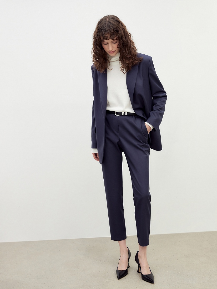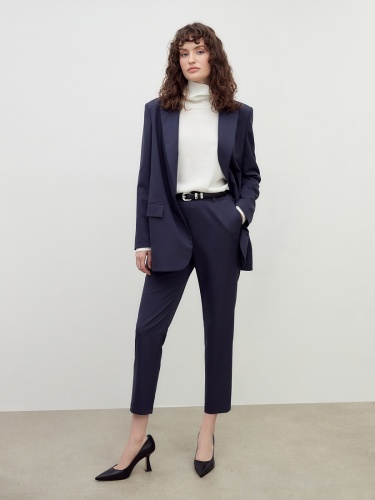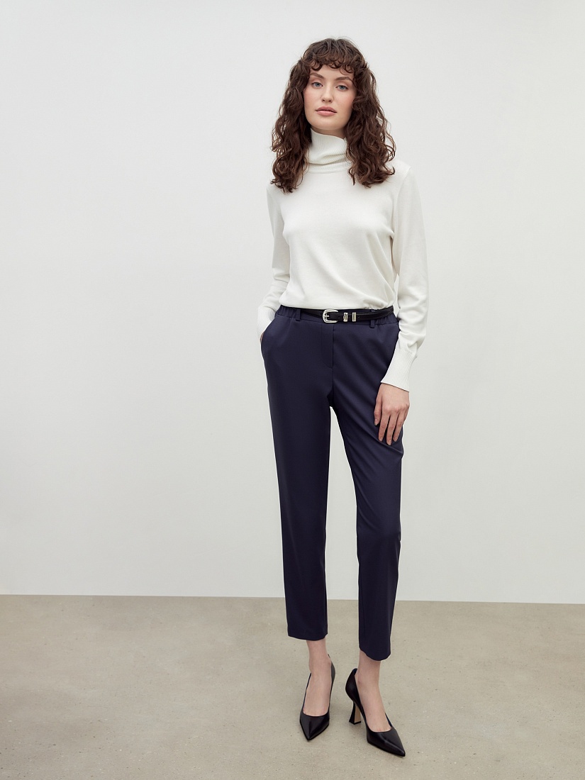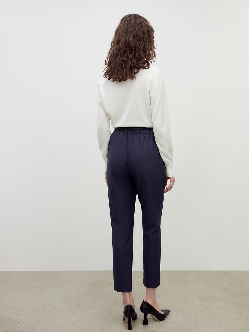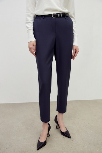 Брюки из костюмной ткани в благородном темно-синем цвете. Зауженный к низу силуэт на притачном поясе со шлевками и резинкой по спинке для лучшей посадки. Брюки с карманами по бокам и двумя прорезными карманами сзади. Модель идеально подойдет для создания ярких образов с жакетом в полоску из одной ткани.