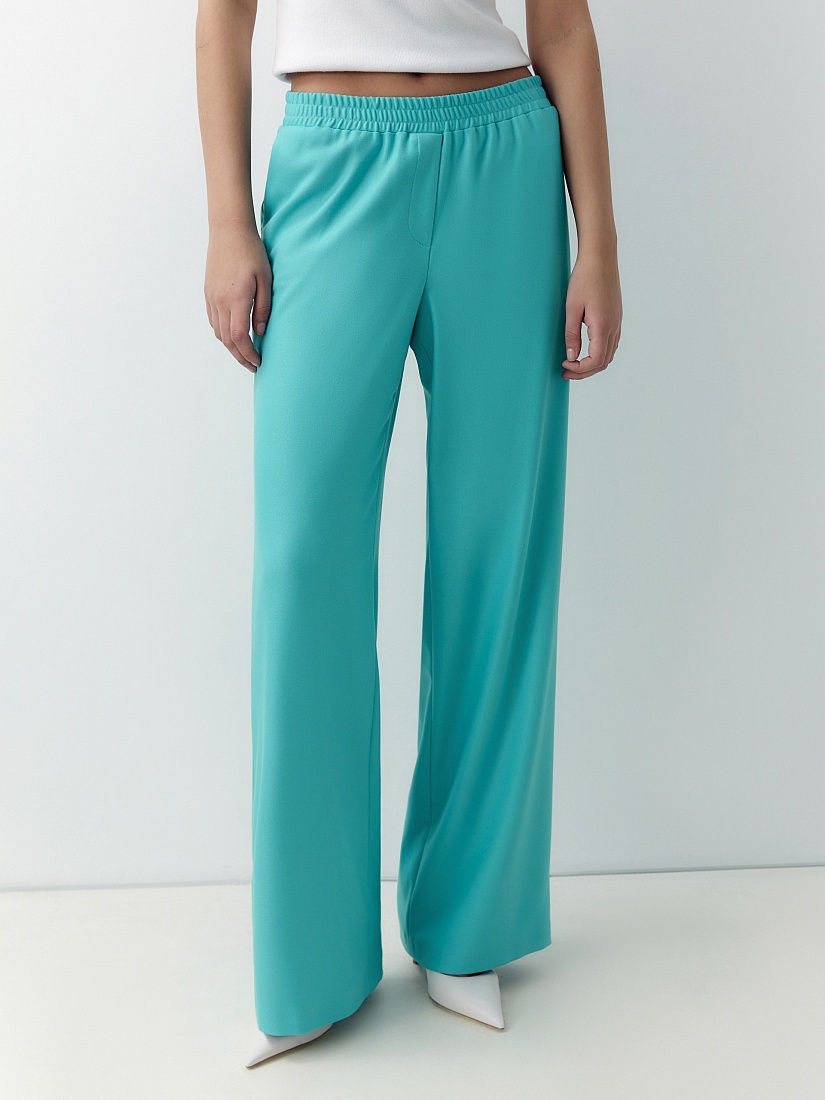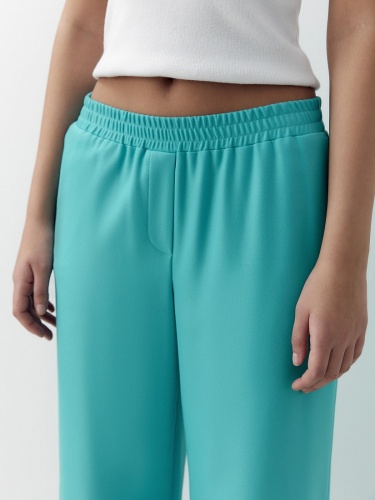Свободные прямые брюки из костюмной вискозной ткани бирюзово-голубого цвета. Пояс на резинке позволяет чувствовать себя комфортно и расслабленно. Брюки имеют два функциональных кармана по бокам и два прорезных кармана сзади. Брюки в комплекте с жакетом из этой же ткани идеально сочетаются между собой и помогут создать модный аутфит.